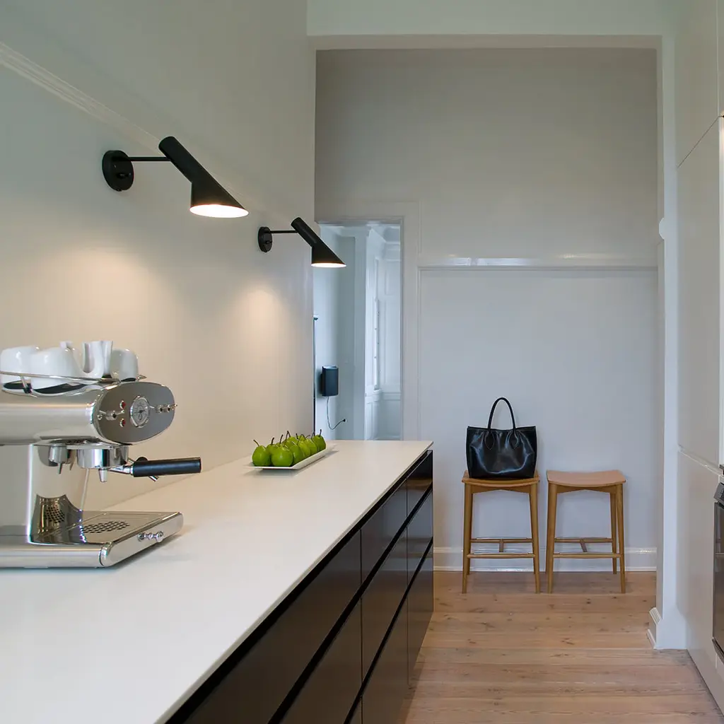 Arne Jacobsen designed the AJ Wall for the SAS Royal Hotel in Copenhagen, the lamp was part of the total design concept created for the hotel. Several of the products created for the hotel are regarded as design icons and within the lighting industry the AJ lamps in particular have obtained world-fame. AJ Wall has a fixture head with a distinct, asymmetrical shape, which determines the light characteristics of the fixture. The head is rotatable and can be turned 60 degrees to the sides. Integral on/off switch is located on the backplate. Can be used for accent or task illumination.