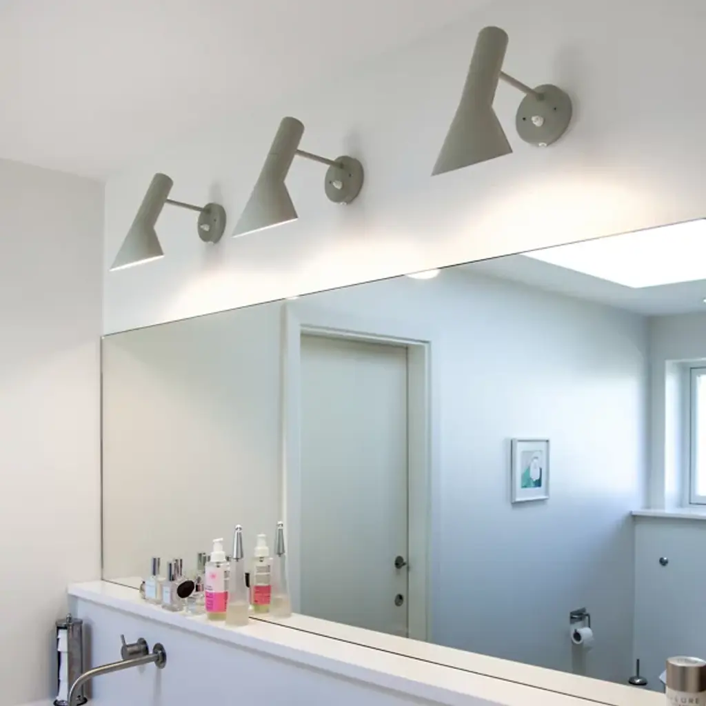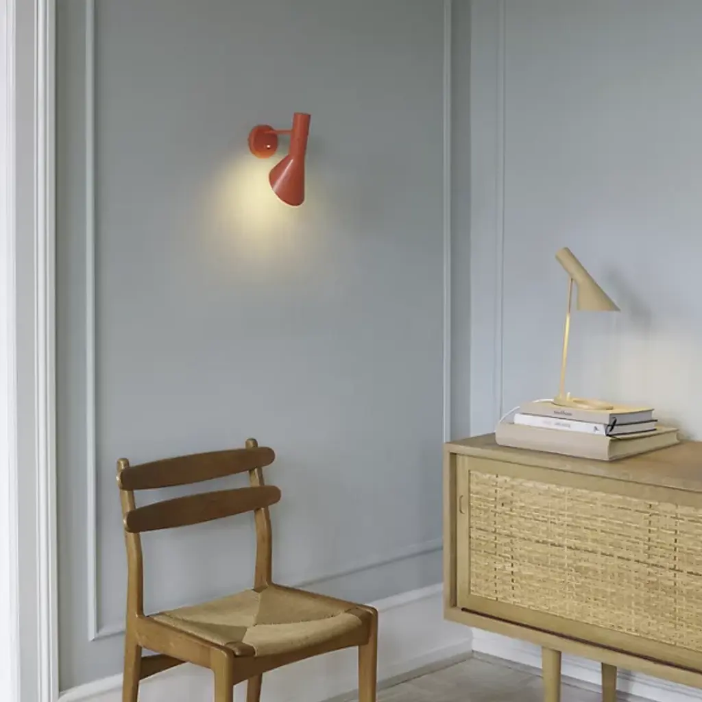 The AJ Wall Sconce by Louis Poulsen is an iconic light launched in 2010 as a tribute to the original 1960 AJ design. It was designed for the SAS Royal Hotel in Copenhagen. Each wall sconce features is a sleek, geometrical design that is reminiscent of triangles and sharp points. The head of the fixture can be rotated for the perfect direction of light. The product provides both indirect and direct illumination on any wall space. With a modern design, the AJ Wall Sconce perfect for bedrooms, living rooms, and dining rooms.