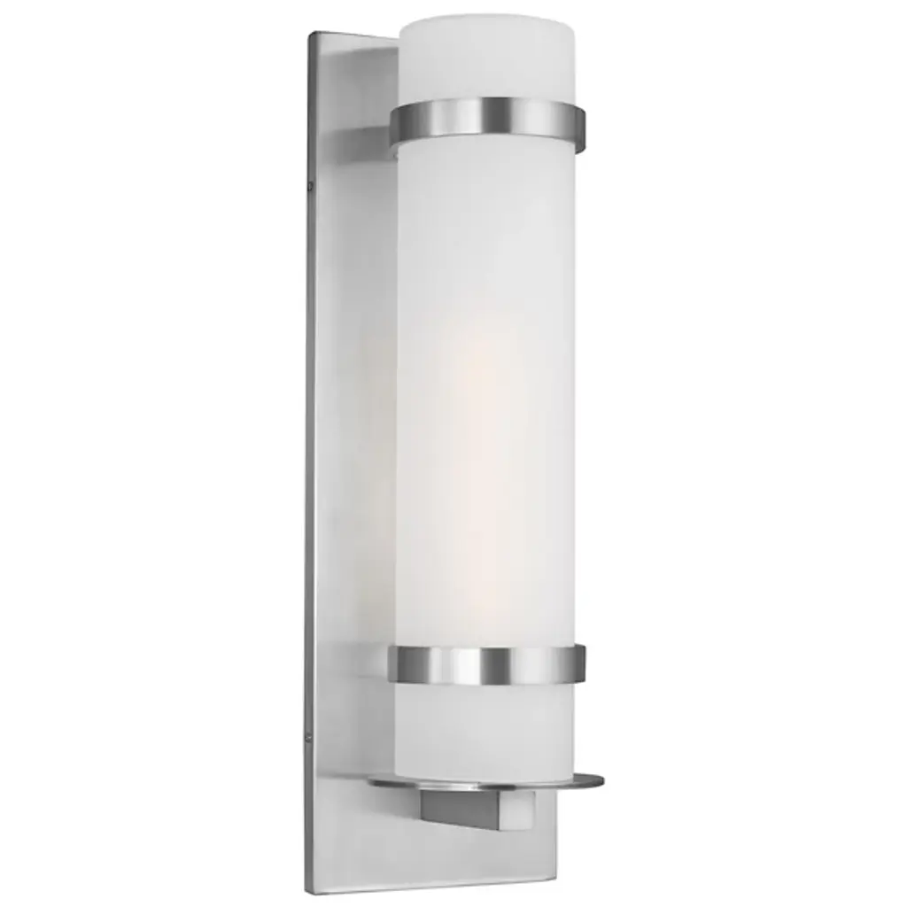 The Alban Outdoor Wall Sconce by Generation Lighting, formerly known as Generation Lighting, formerly known as Sea Gull Lighting,, is a minimalist lantern evoking modern simplicity in outdoor lighting. A solid aluminum base extends lightly from the wall, carrying an oval-shaped, opal glass which rests on a small, circular platform. The glass container is gently attached by two restraining bands at the top and bottom ends, and an energy-efficient LED bulb encased inside the glass diffuses soft, ambient light. Rated for wet locations, the Alban Round Outdoor Wall Sconce is the perfect addition to any outdoor space.