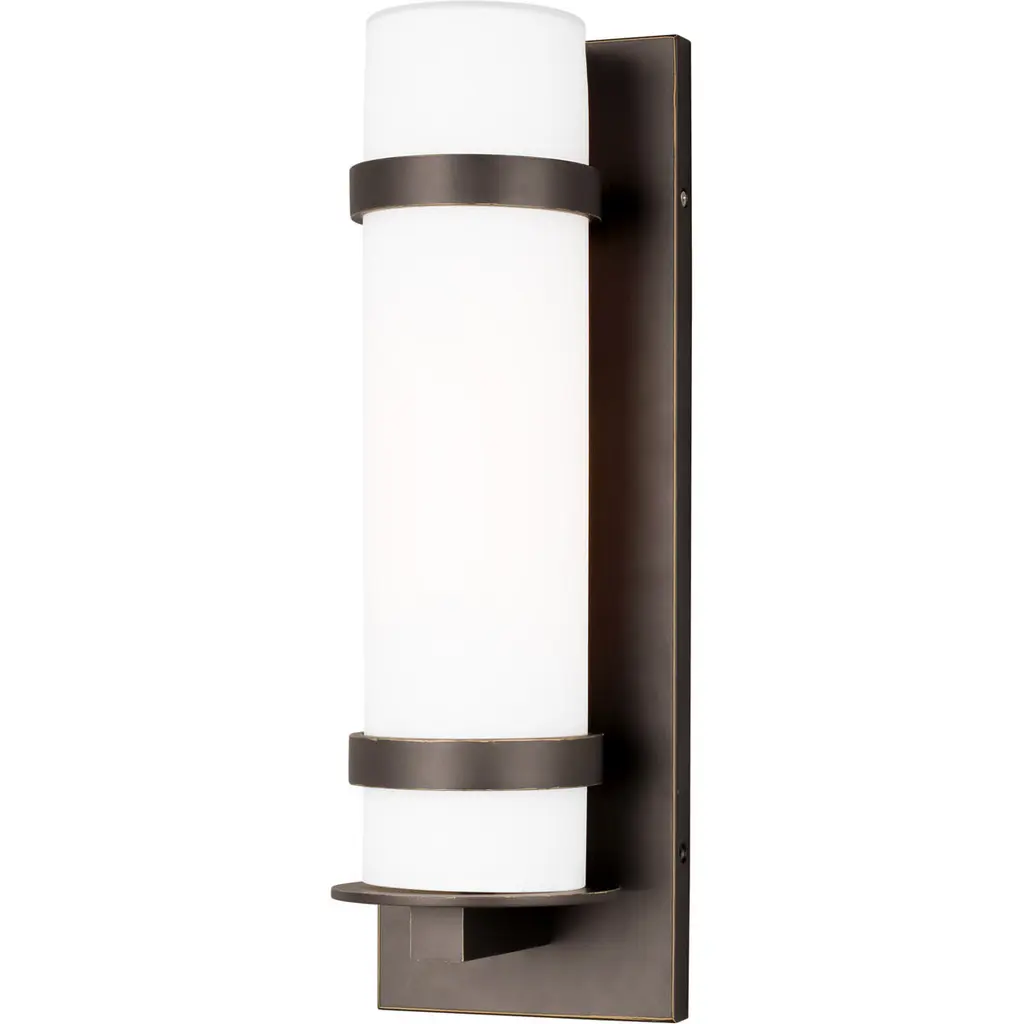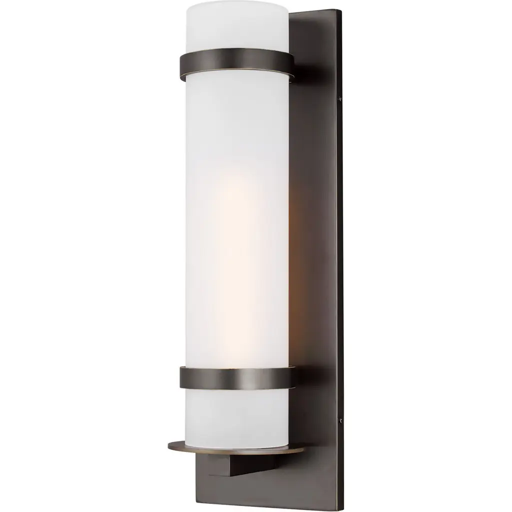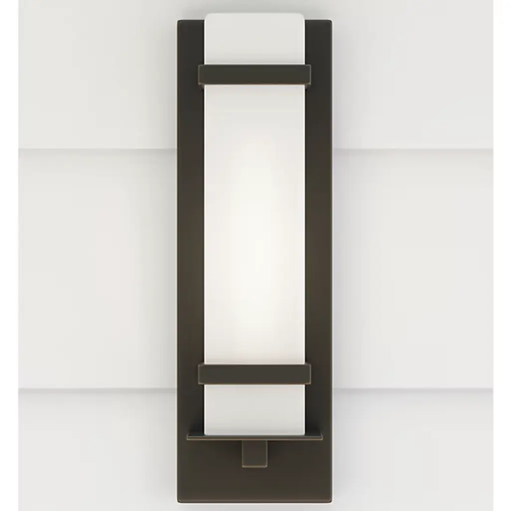 The straightforward design of the Alban Square Outdoor Wall Sconce from Generation Lighting, formerly known as Sea Gull Lighting, offers a timeless modern look with a touch of minimalist class. A low-profile rectangular wall mount of robust aluminum extends into a mounting post and two restraining bands for the opal etched glass shade. Designed to mellow and diffuse direct light while still dispensing enough to see by, the fixture is sure to brighten up a patio, driveway, or entryway while a damp rating ensures greater durability and long service.