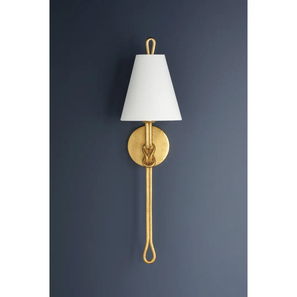 Maritime meets modern style in the Alburgh sconce. The clean single-light design features an elongated silhouette accented by a nautical square knot in the center and loop details at the top and bottom. The crisp white linen shade carries through the timeless, tailored look. Alburgh is available in luxurious Vintage Gold Leaf or a more rustic Aged Iron finish.