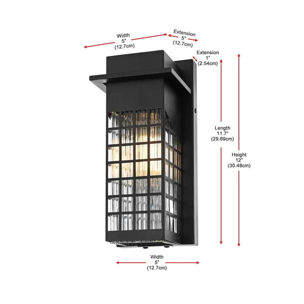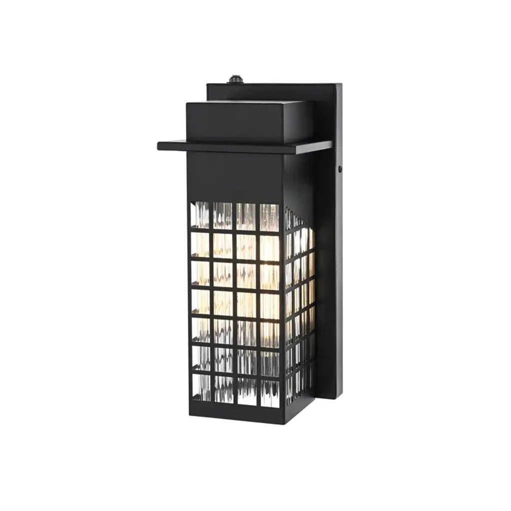 Transform your outdoor space with this captivating outdoor wall sconce, featuring a robust iron and glass construction that is perfect for any modern aesthetic. The sophisticated grid-patterned design of the iron frame showcases the beautiful glow of the light inside, while the clear glass panels with unique textures add an element of charm. Designed to withstand outdoor elements, this wall sconce is a seamless blend of style and durability, providing a warm and inviting glow to your entryways, patios, or gardens. With an E26 socket, it can accommodate a range of bulbs, making it adaptable to suit your lighting preferences while enhancing the overall appeal of your outdoor area. The built-in dusk to dawn sensor ensures that your home remains well-lit at night while saving energy during the day by automatically turning the light off at sunrise.