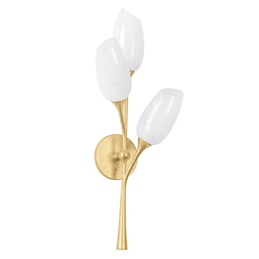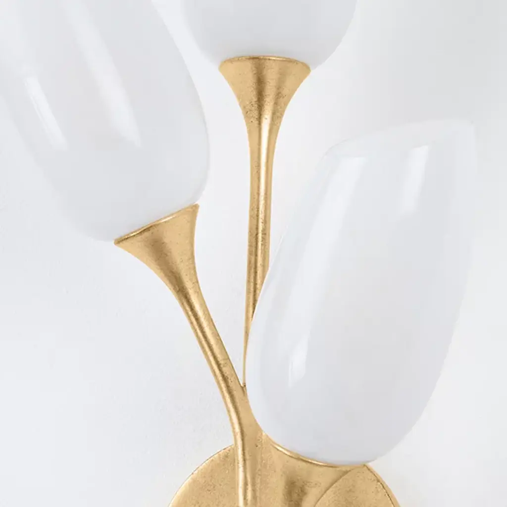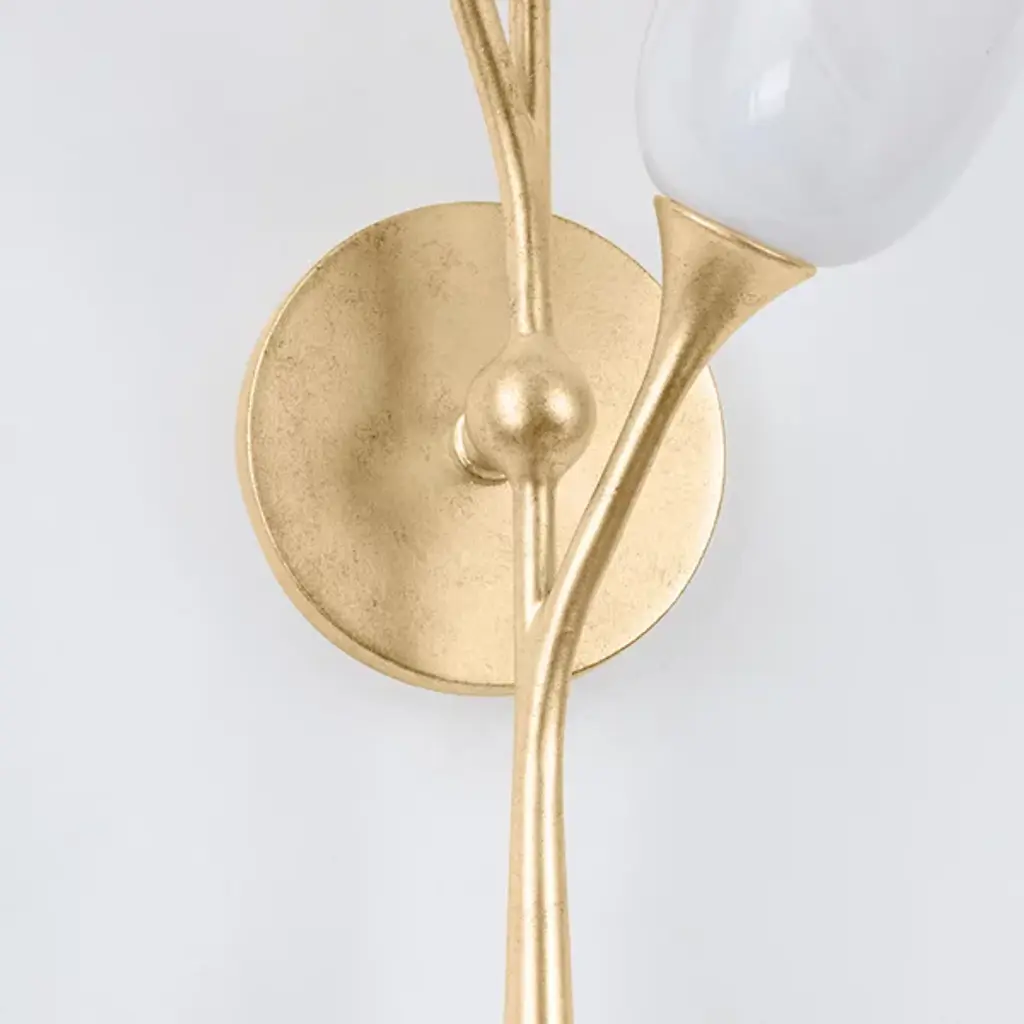 Drawing inspiration from the delicate buds of a dill plant, the Aldean Wall Sconce by Troy Lighting captivates with its whimsical design. Clusters of stems gracefully branch outwards, each supporting a handcrafted Cloud Glass shade, while the framework is elegantly finished in Vintage Gold Leaf. When lit, this fixture creates captivating shadows on the ceiling, infusing any space with a sense of drama and charm. Crafted from iron and steel with rounded glass shades and damp-listed for versatility, it becomes a standout addition to any decor scheme.