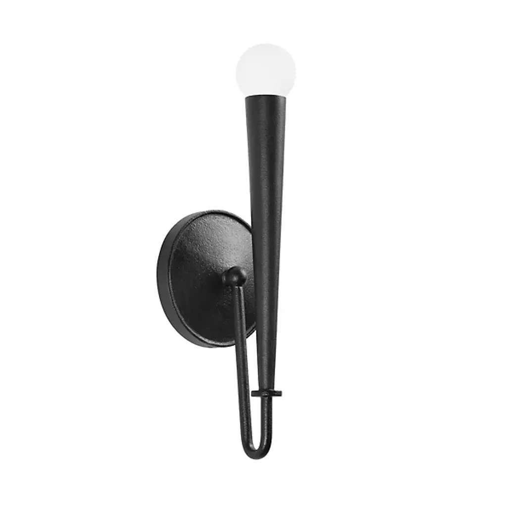 The Alder Wall Sconce from Troy Lighting is where elegance meets dynamism. A slender arm gracefully arcs down from the circular backplate before ascending to a tapered cone-shaped candleholder, imbuing the fixture with fluid motion. The combination of textured Gesso White and Forged Iron finishes and its slim profile ensures versatility, making it a suitable and adaptable addition to a wide range of interior styles and spaces. This sconce effortlessly marries aesthetics and functionality, offering visual appeal and practicality.