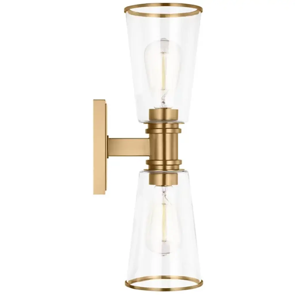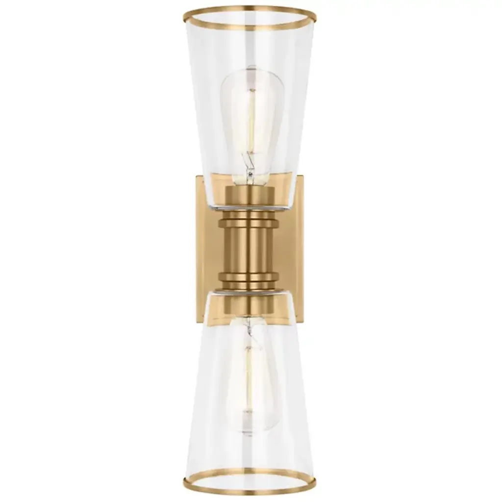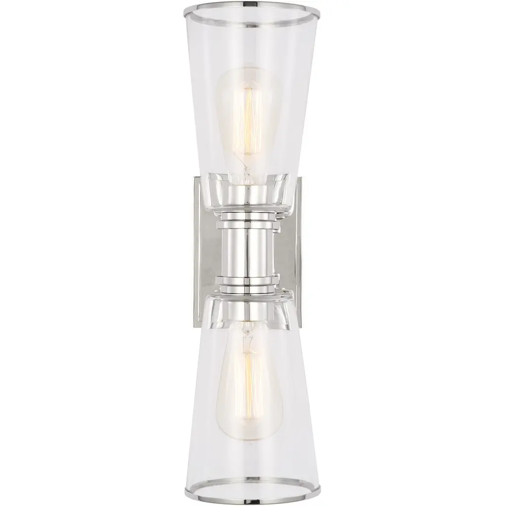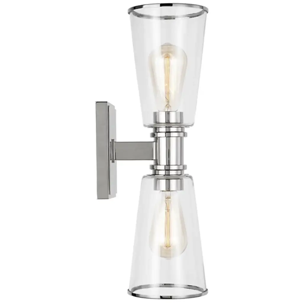 The Alessa 2-Light Wall Sconce from Visual Comfort Studio extends a stream of layered light on nearby surfaces above and below. Sporting clean geometry, this sconce looks natural in a modern or contemporary setting. A compact backplate helps the piece slot in tight areas. The intricate lamp holder at the center produces a pair of cone glass shades that pop visually with ring accents at their lip. The dual lamping setup funnels a rich glow suited for tasks and ambiance simultaneously.