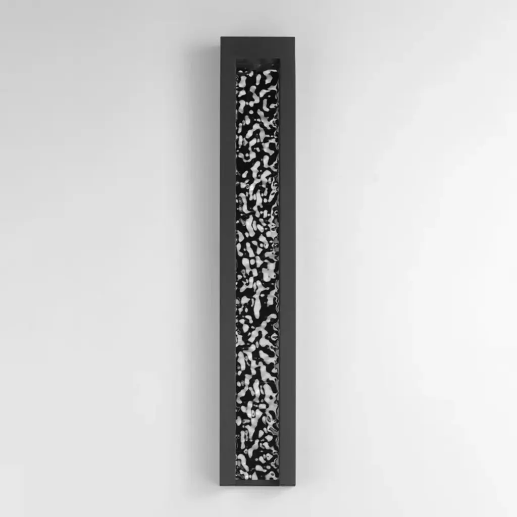 A water feature that seemingly flows down a narrow, elongated channel constructed of aluminum.