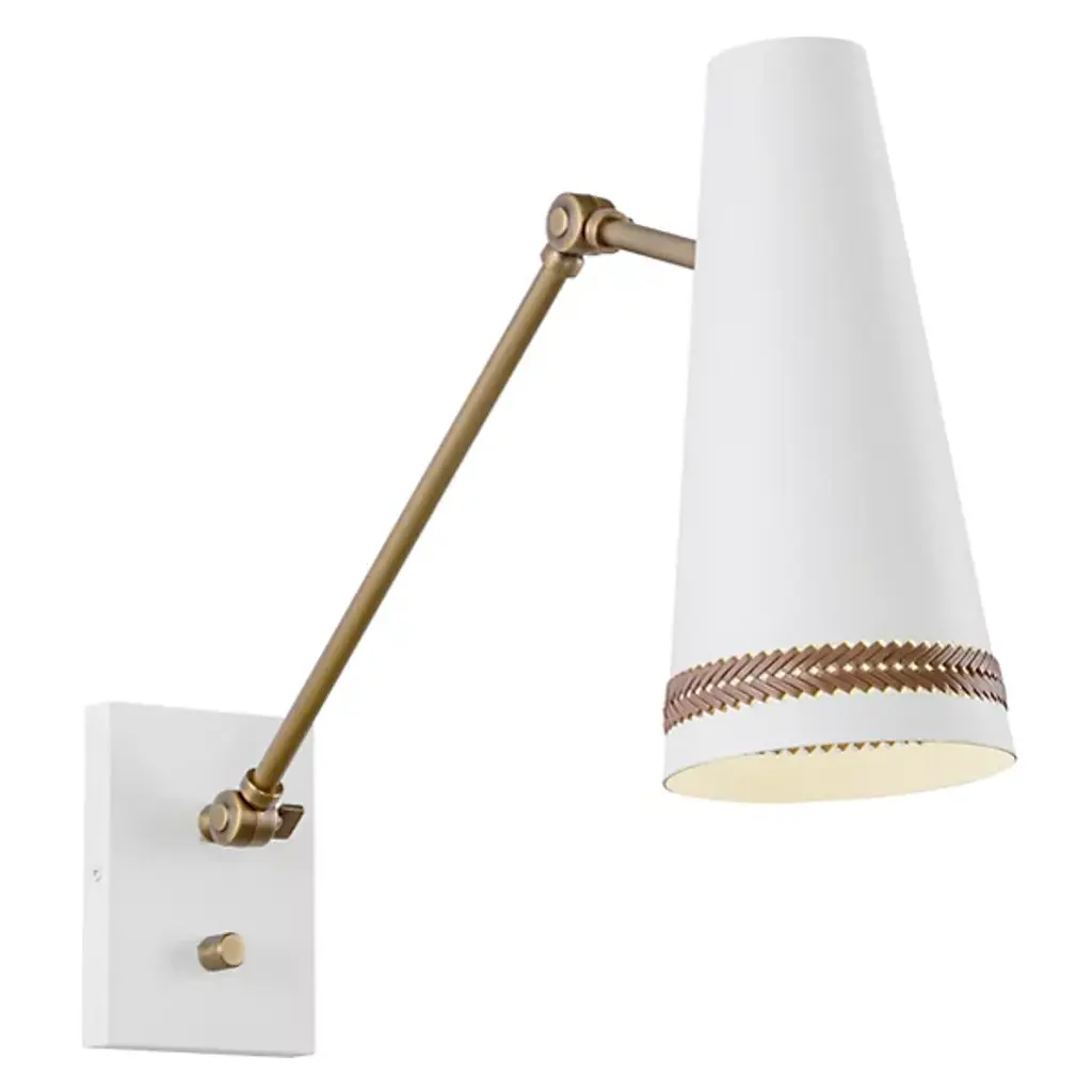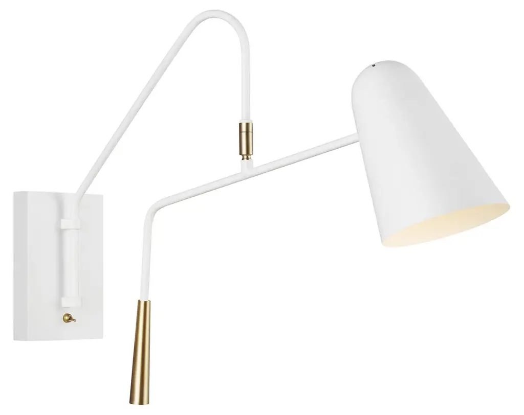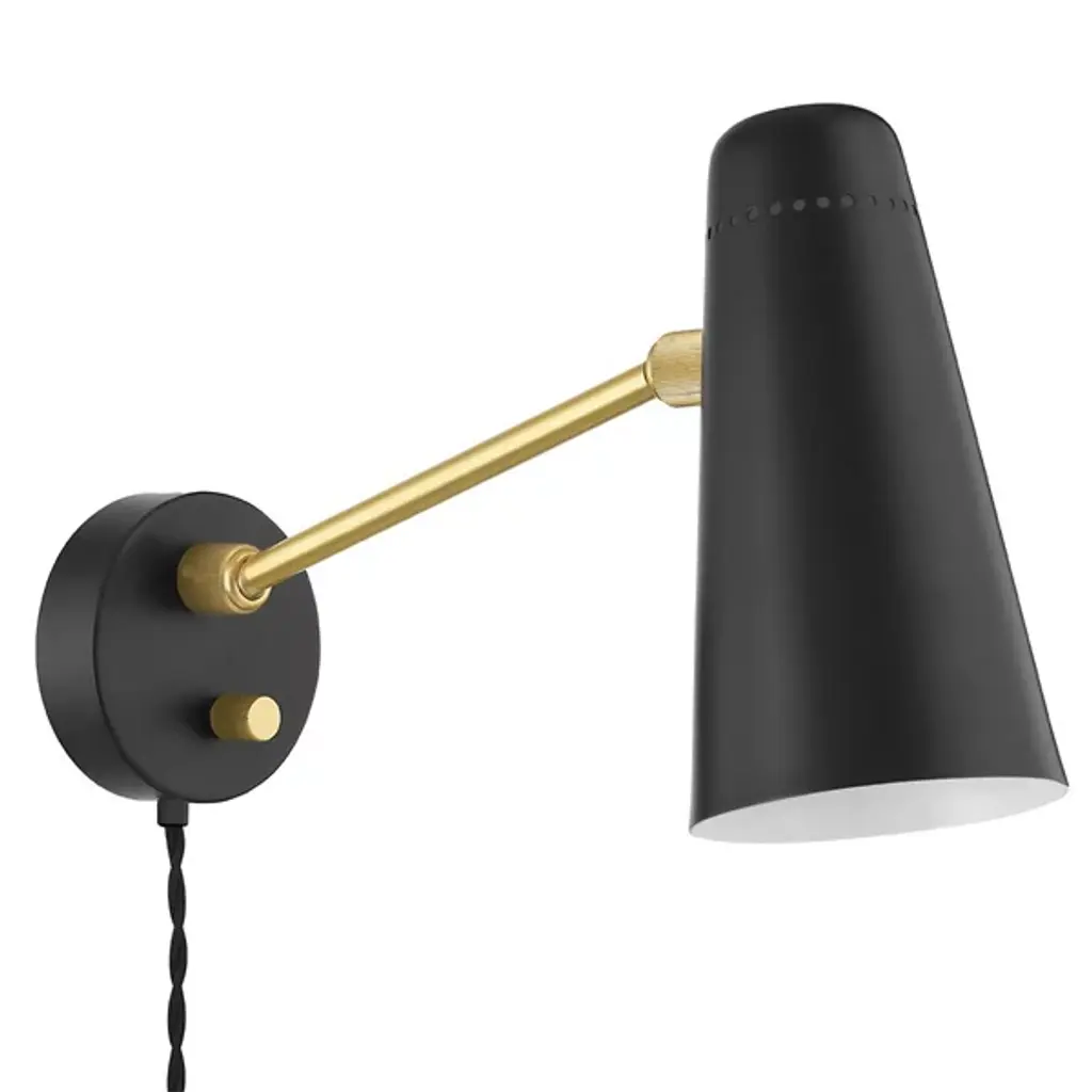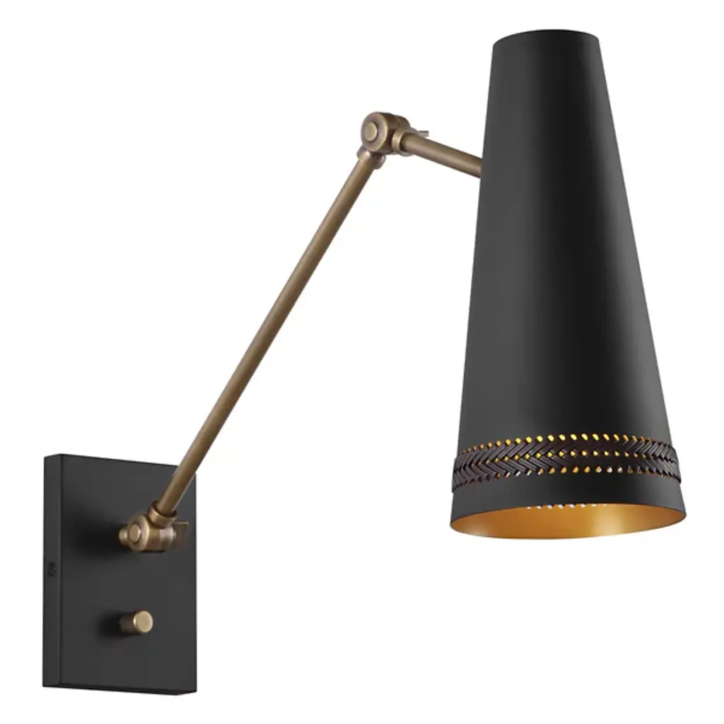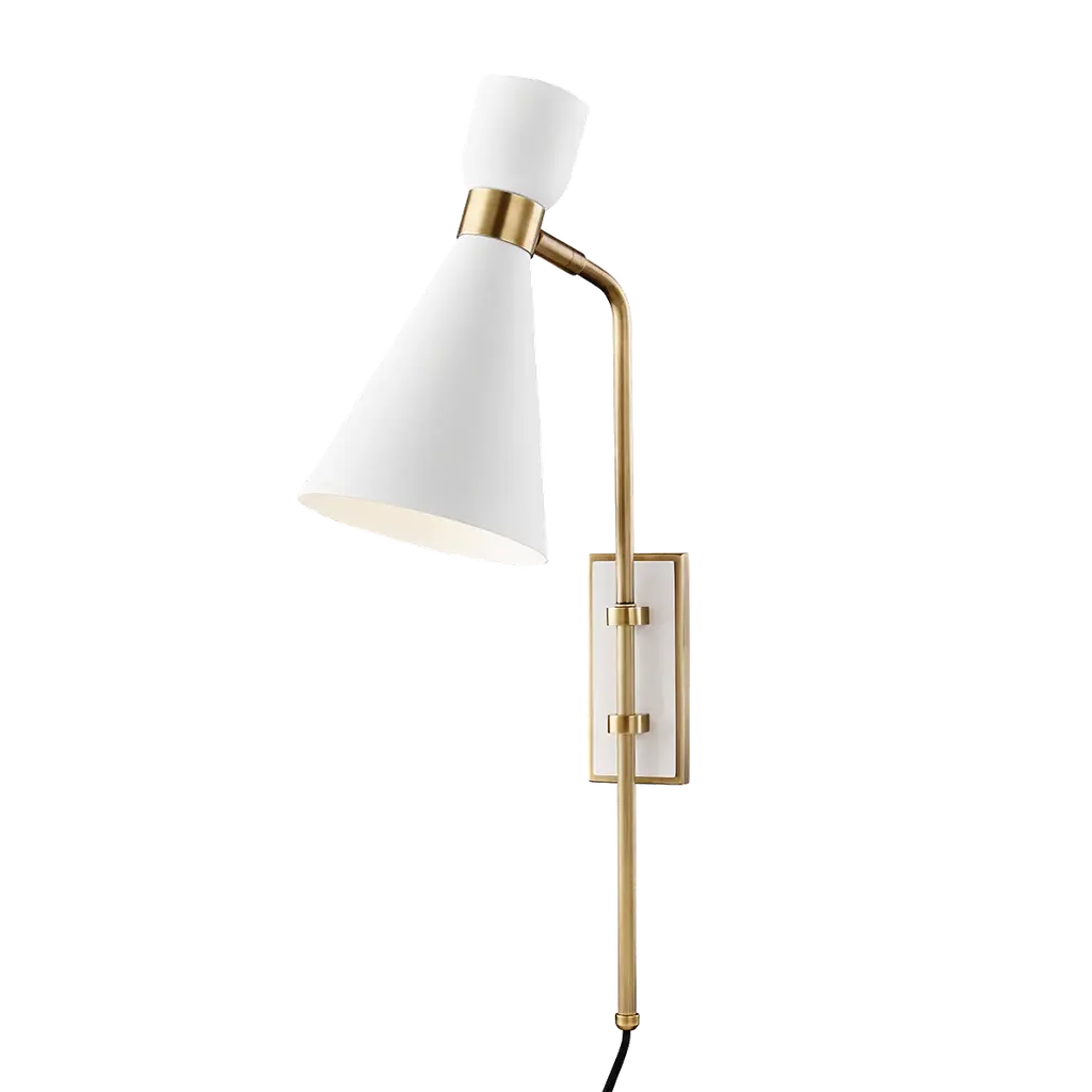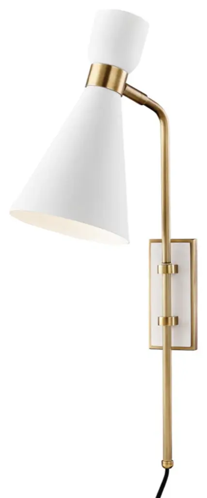 Mid-century modern design inspires the handsome and reliable Alex Plug-in Wall Sconce from Mitzi. This sconce puts a refined spin on the mid-mod style. It draws the eyes with the contrast of its aged brass and richly finished hardware. From the perforated shade to the etched joints, no detail is overlooked here. This cone shade focuses the light where needed with minimal glare. The plug-in design is hassle-free, allowing you to plug into an existing outlet versus hardwiring.