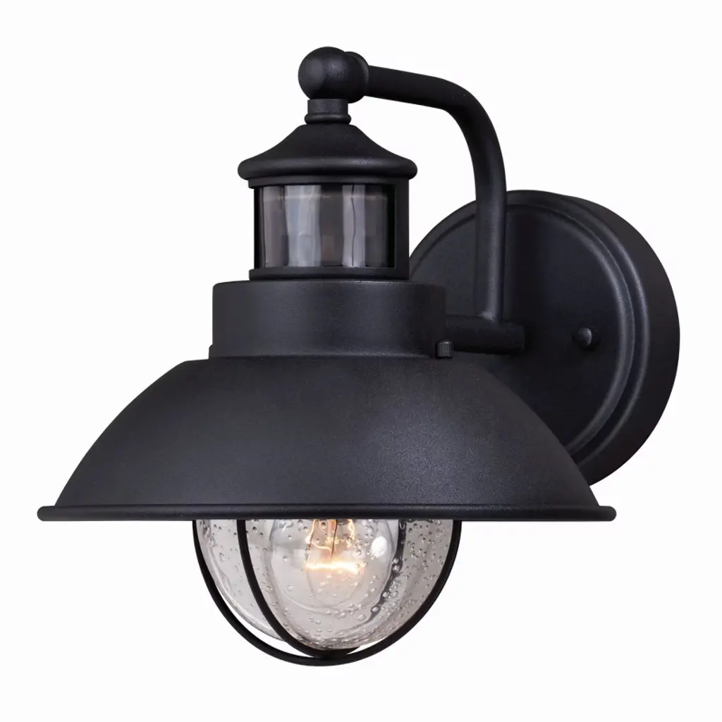 Lend enduring style to your outdoor wall and spaces with the Alexia Outdoor Wall Sconce from Alder & Ore. A vintage design starting with a stepped disc wall base, it uses two clamps to seat a curving stem that sweeps up its centerline, arcing up and over to bloom wet-listed lamping from a flared shade of contoured aluminum. The lamping is moderated by a curved dome shade of Weathertight glass, transforming bright glare into a pleasing glow that passes through a slender metal cage structure that drops down around it.