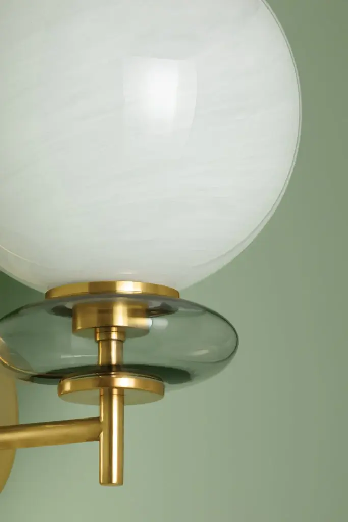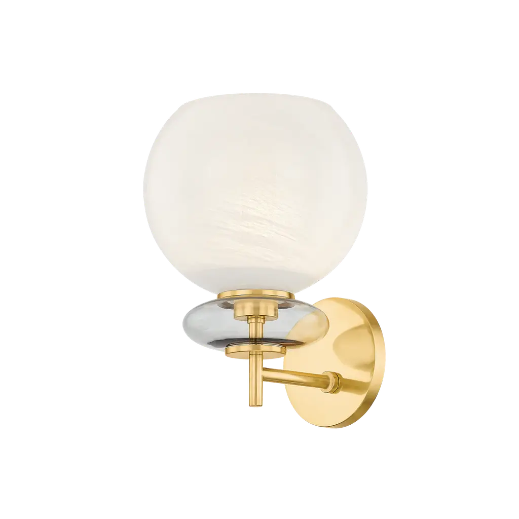 The totemic composition of Alexia strikes an artful note with a large cloud glass orb stacked above an iridescent glass bubble. Lustrous Aged Brass metalwork pierces through floating forms as if they were beads on a string. Available as a 1-light sconce or a 5-light chandelier, Alexia is both delicate and sweet – a true charmer.