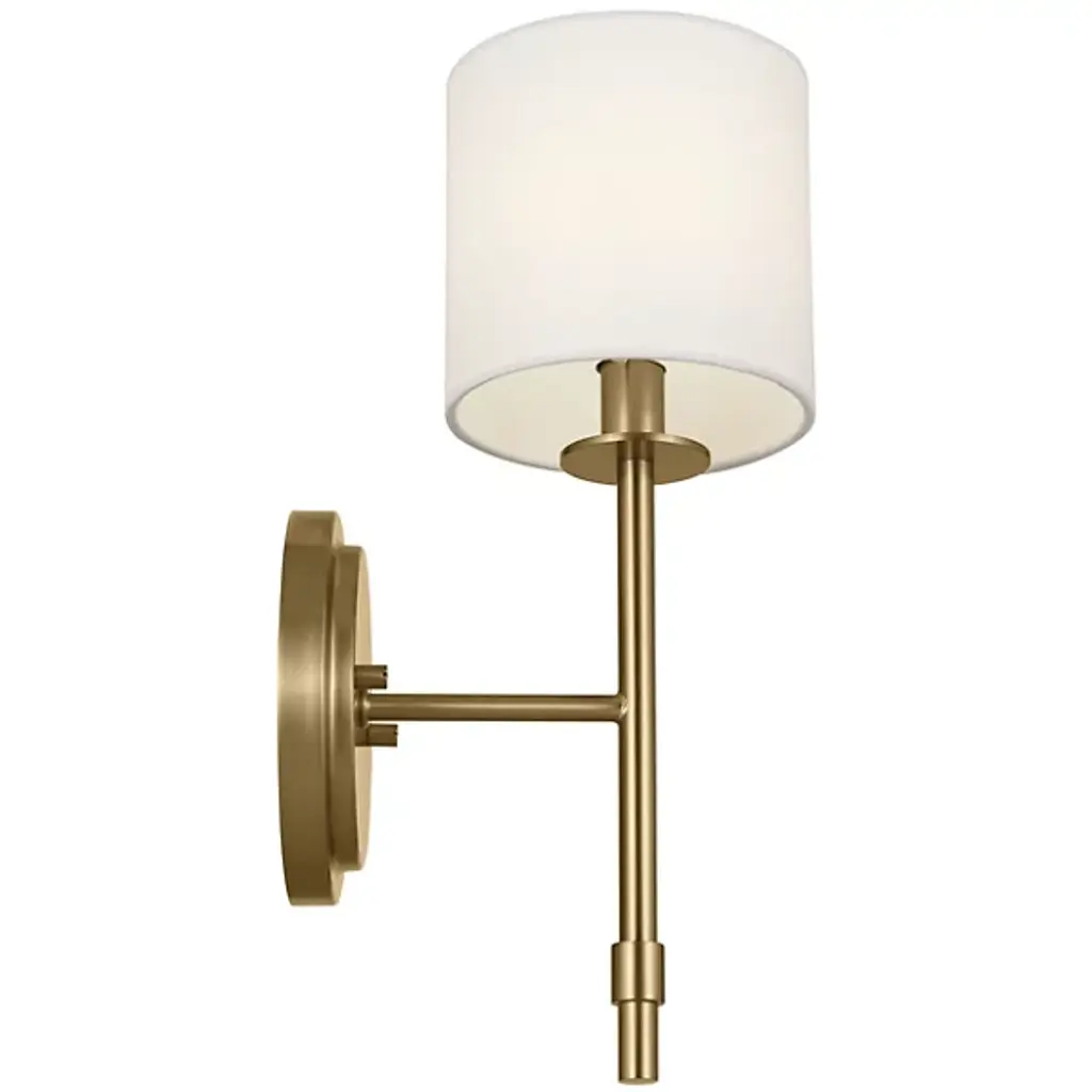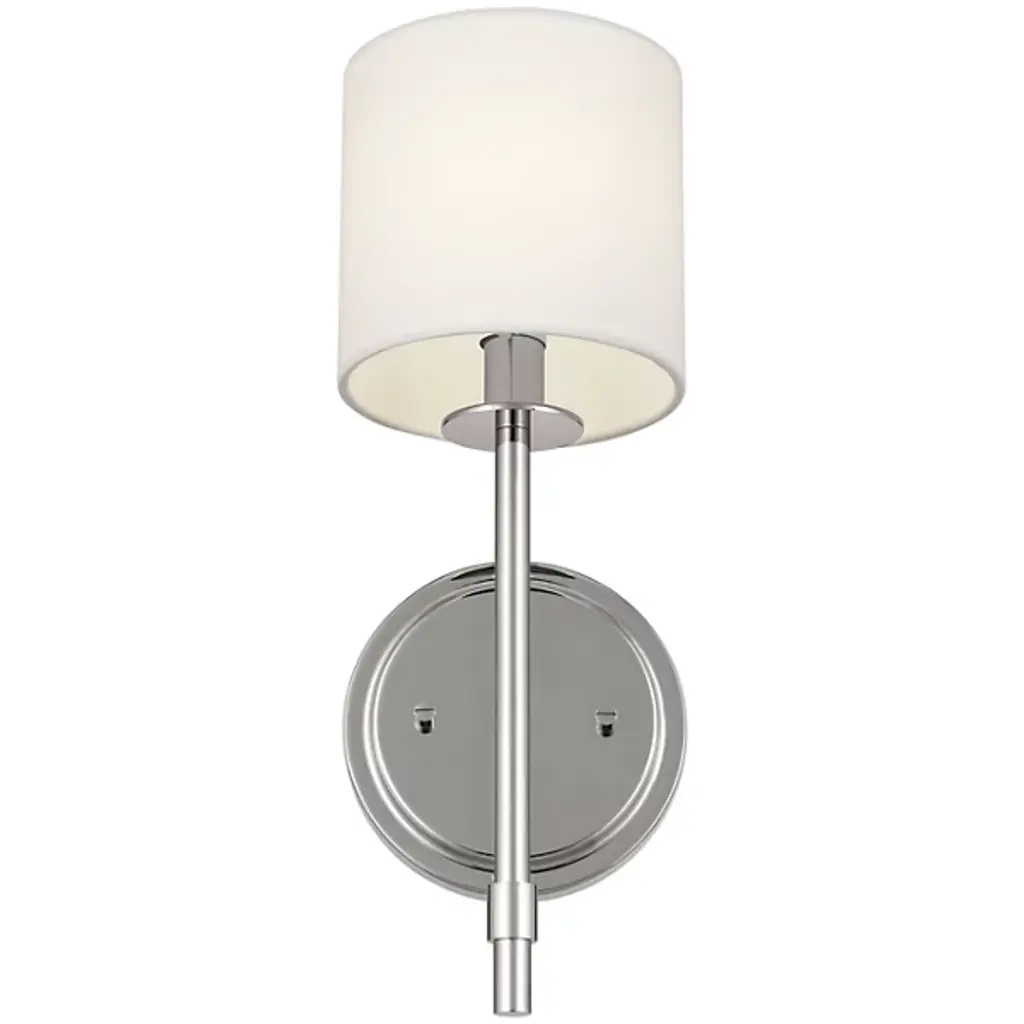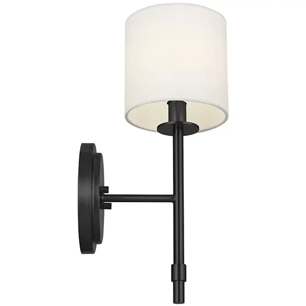 The Ali Wall Sconce by Kichler gives your home a sleek mid-century modern appearance. A cylindrical, white fabric shade rests overtop a steel plate supported by a metallic rod. An arm attached to a backplate at your wall bolsters this rod, effortlessly balancing a drum-shaped shade. Inside of this sconce’s shade sits an incandescent bulb that emanates light throughout your indoor layout. This sconce is fixed in place so that your most frequented spaces maintain illumination on an ongoing basis.