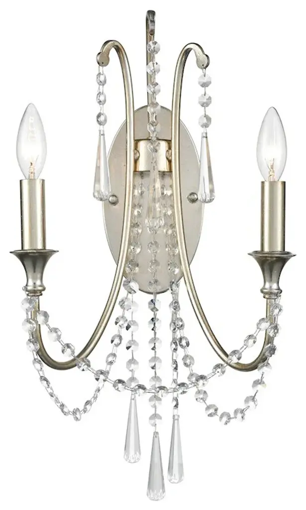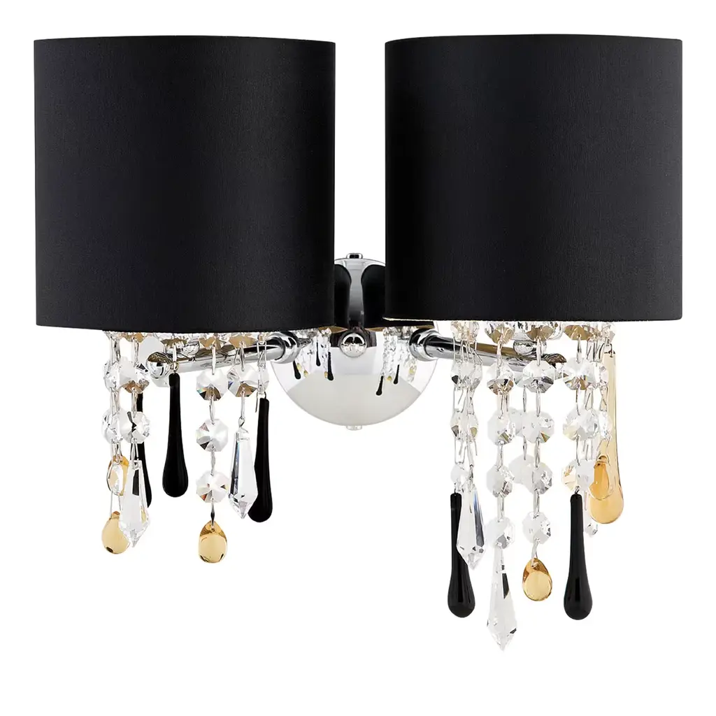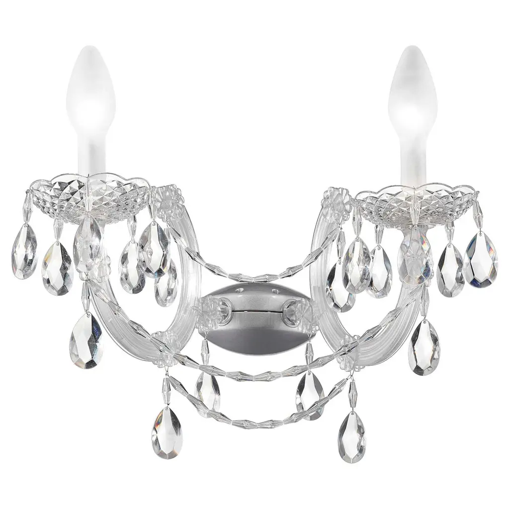 Boasting a jewel-like allure, this superb two-armed sconce will enrich foyers, living rooms, or bedrooms with romantic allure while providing ambient illumination. The white-lacquered metal frame is mounted on a round plate from which the curved arm extends, each with a cylindrical white fabric shade. Dangling strands of white glass beads resembling pearls with teardrop crystal pendants complete this unique piece that stands out for its elegant design suiting both classic and mid-century interior decors. This light holds two E12 max 5W bulbs.