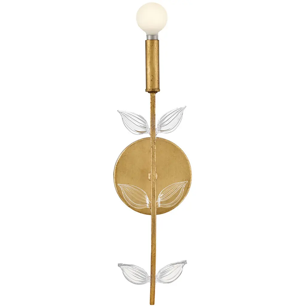 Feminine and romantic, Alisos thin, delicate frame is adorned with dainty, clear, pressed glass leaves. A Distressed Brass finish makes a polished and luxurious statement in classic living spaces or modern dining rooms.