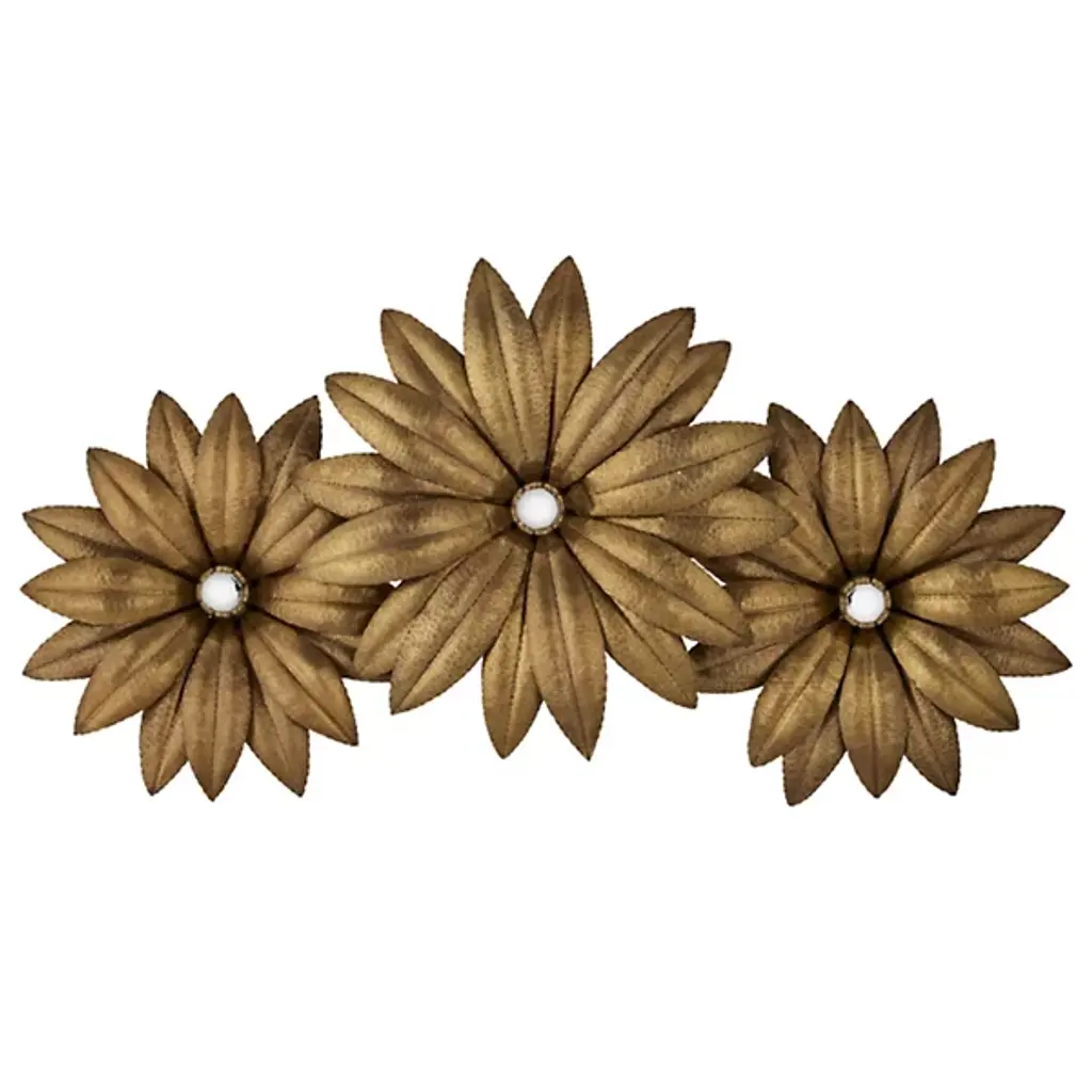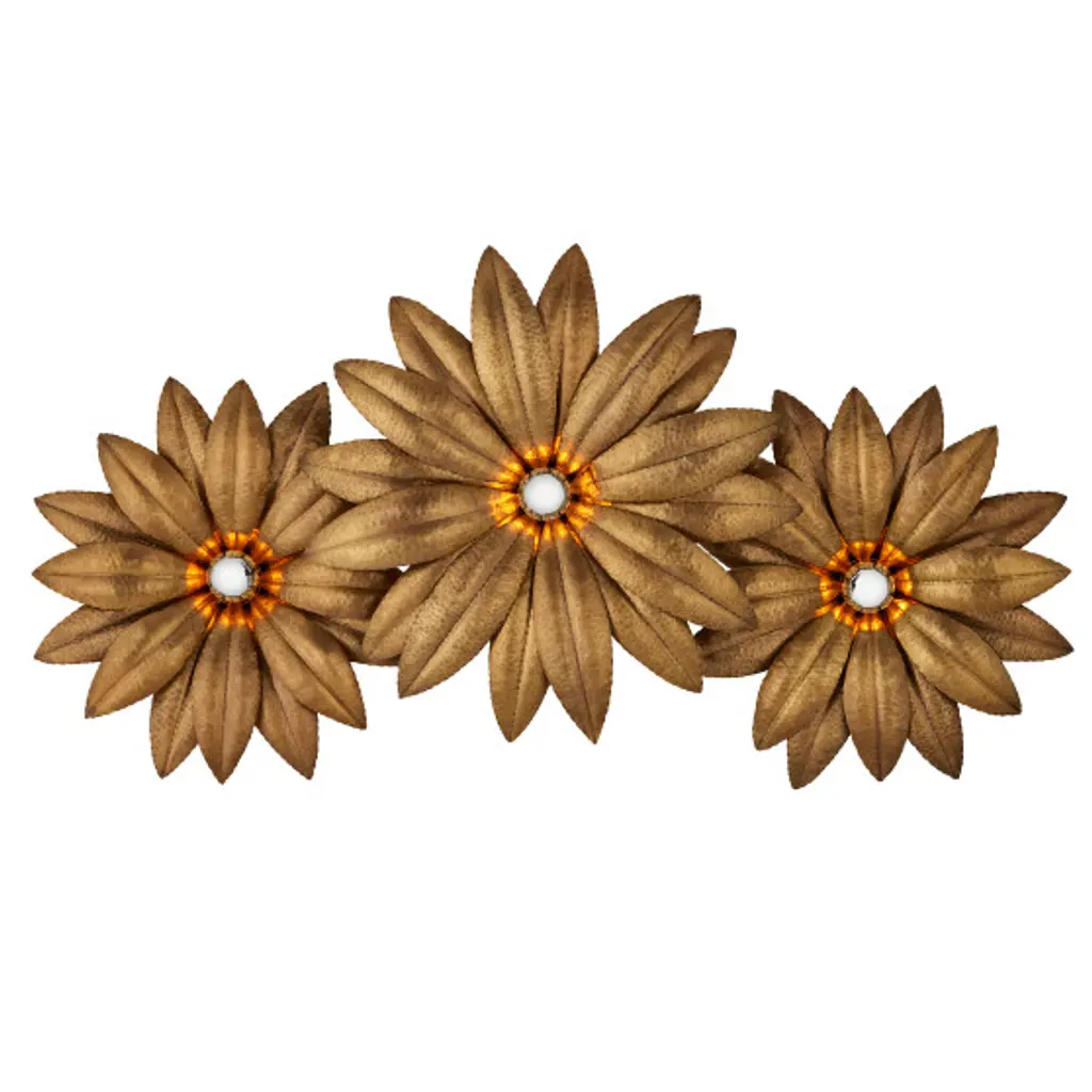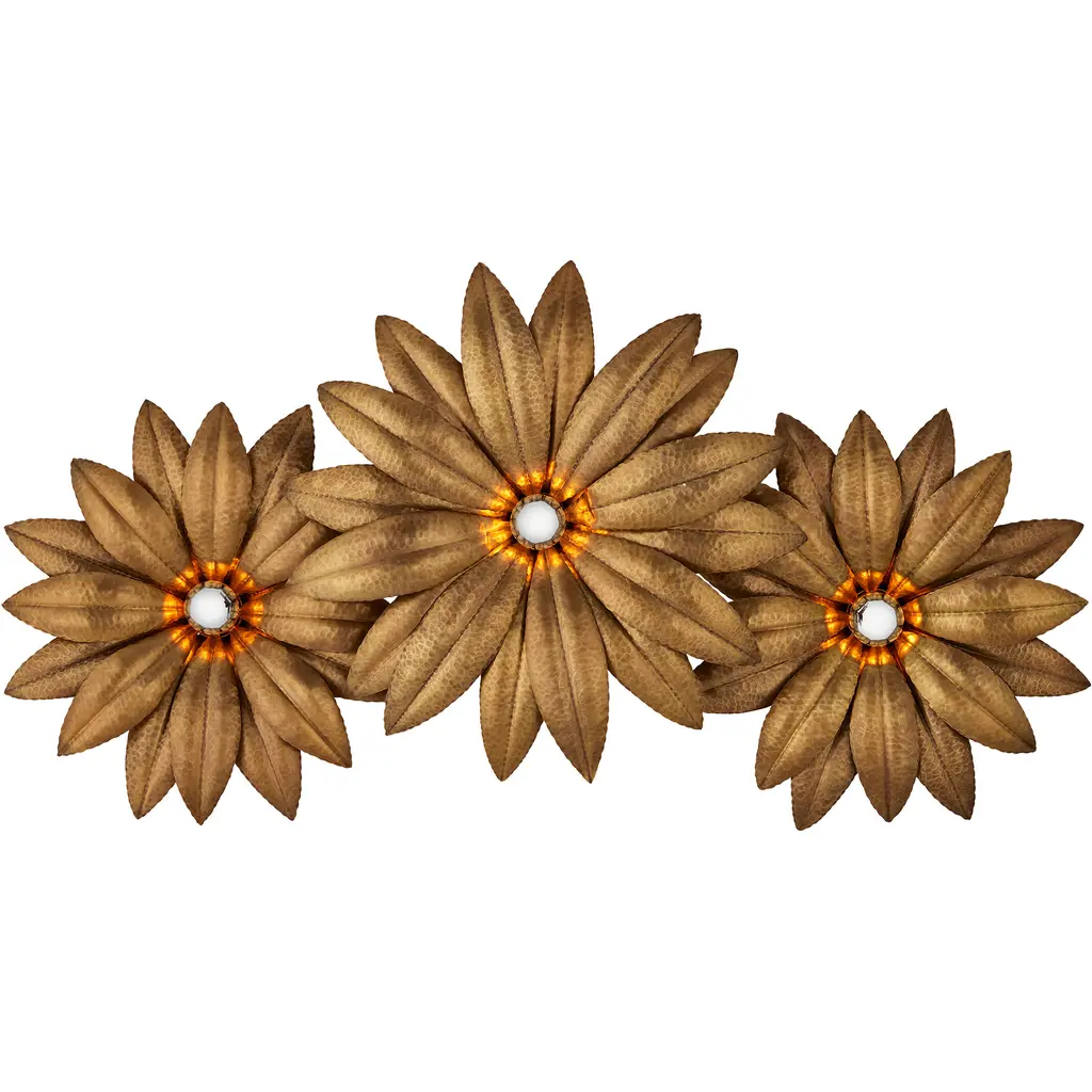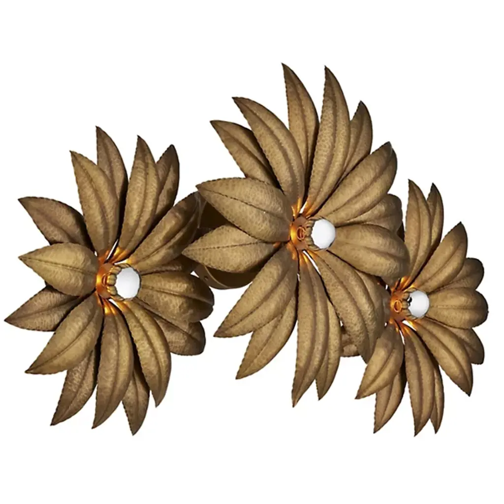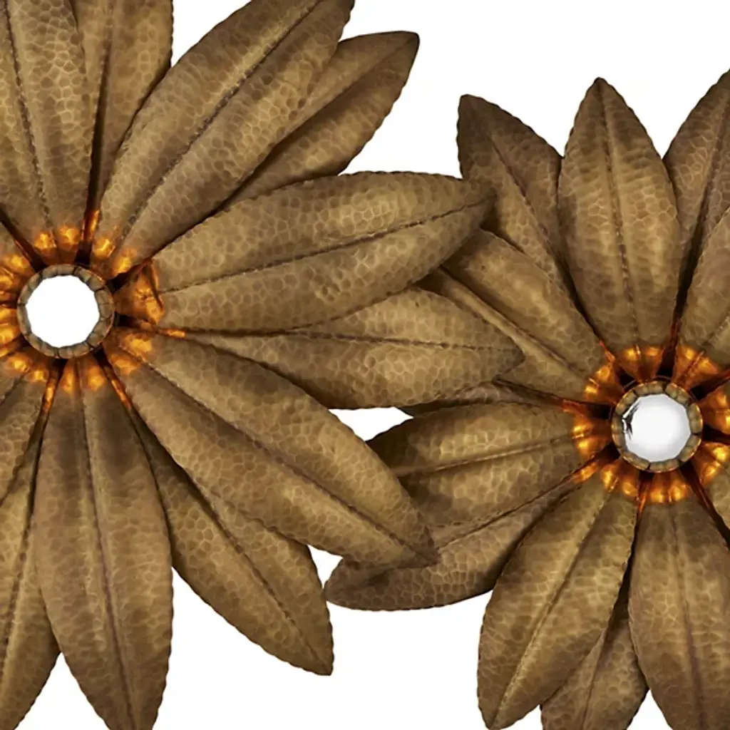 The Alithea Large Wall Sconce from Currey & Company showcases a charming blend of nature-inspired aesthetics and refined craftsmanship. Designed by Tom Caldwell and made from brass with a gleaming finish, this sconce's petals are meticulously hand-hammered, instilling them with life-like character. The result is a stunning, floral-inspired bouquet that adds a touch of natural beauty to any illuminated space, with button-like bulbs that reflect off the shining metal with a memorable glow.