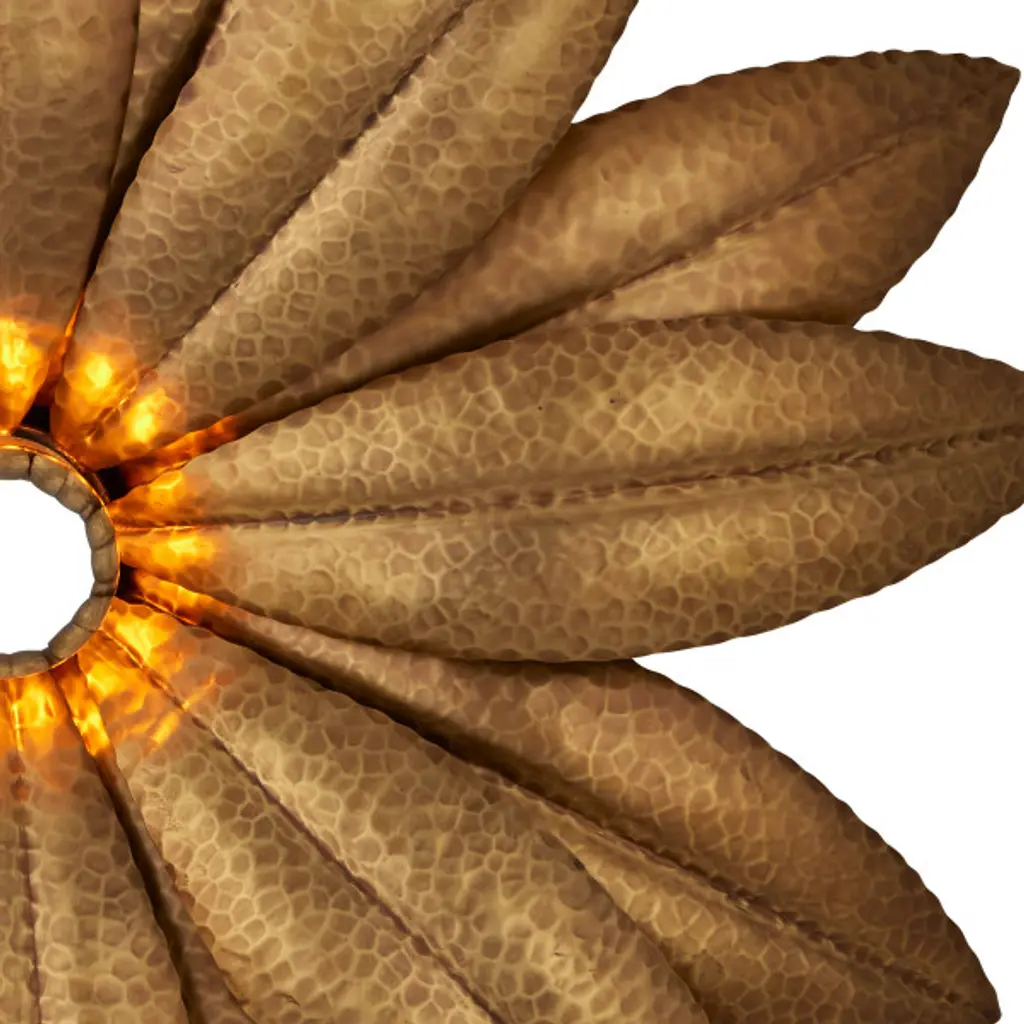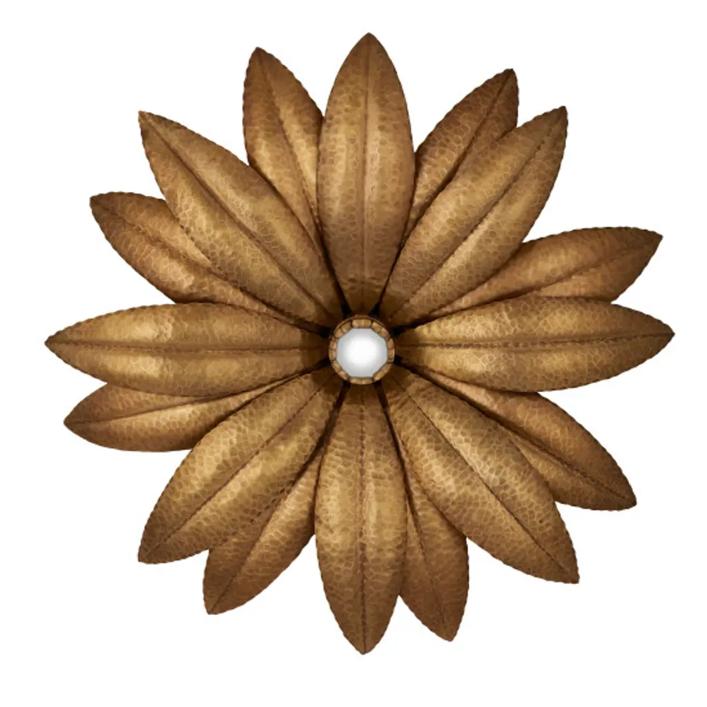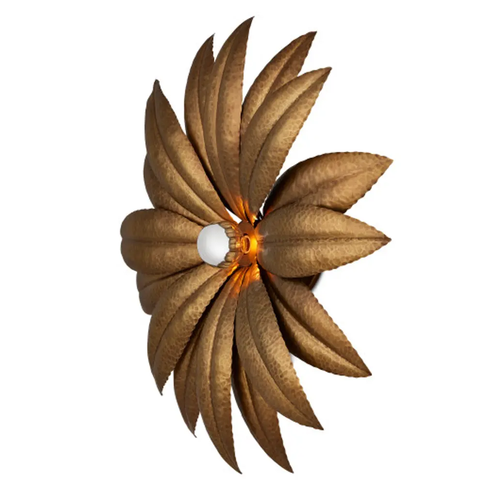 The Alithea Wall Sconce is made of brass in an antique brass finish. The petals on this nature-inspired sconce have been hand-hammered to give them life-like personality. Designed by Tom Caldwell, the floral sconce will be a pretty addition to any space it illuminates. The button-like bulbs bring the metal a luminous sheen.