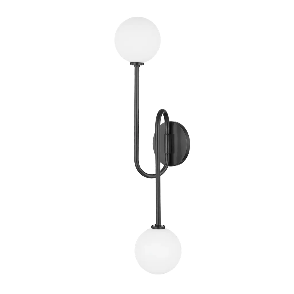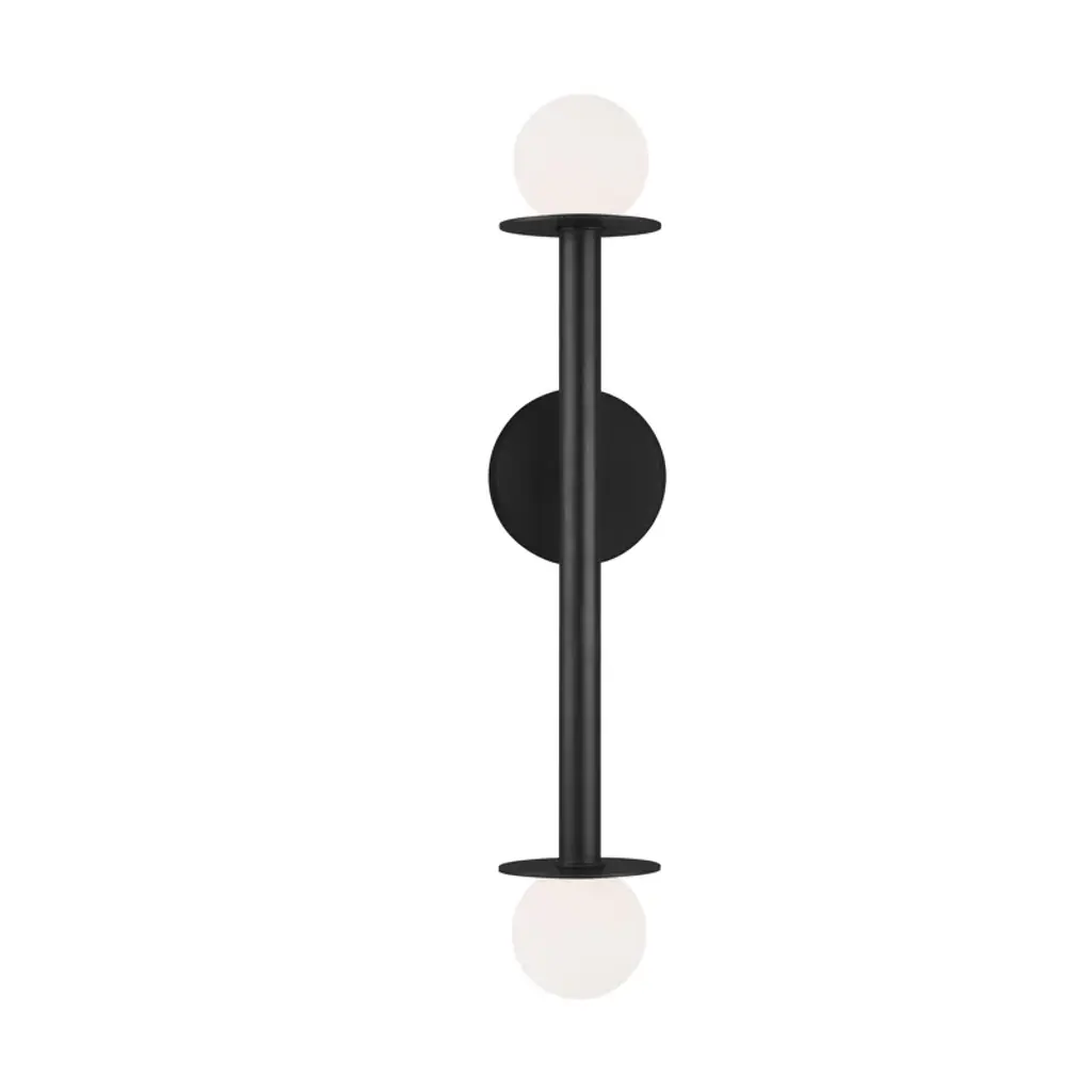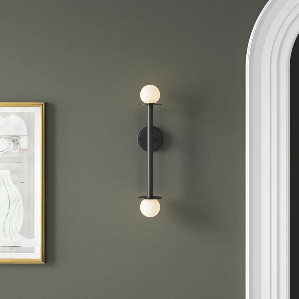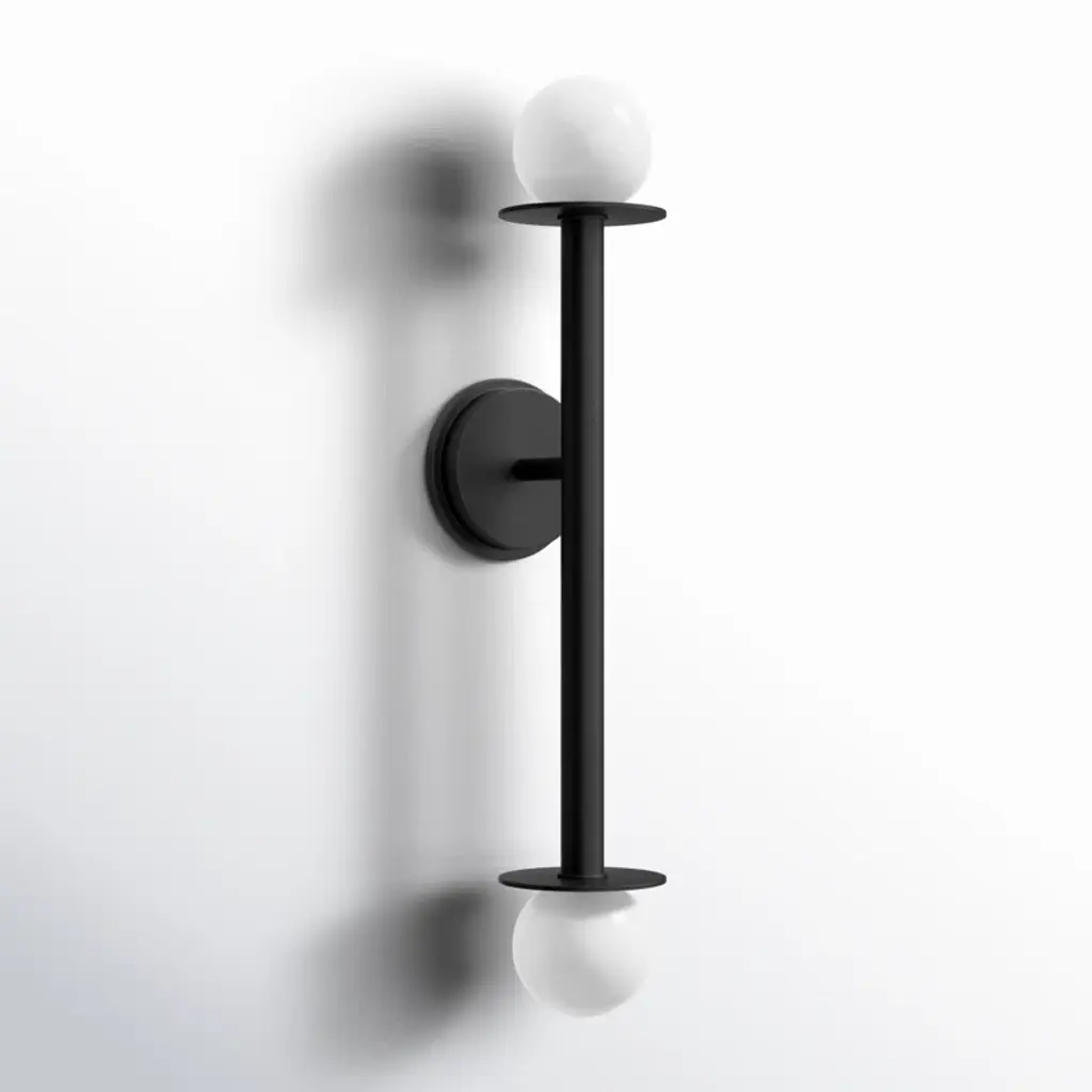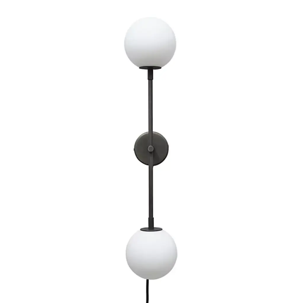 Provide bold, convenient illumination anywhere with this 2-light wall sconce. A milk glass globe is set at either end of a vertical rod with metal disc accents for bold contrast and dynamic vintage mod style. Nestled within each of the spherical shades is a single bi-pin bulb, which is sold separately and compatible with dimmer switches for easy light-level control in your space. It's also rated for damp locations, making it safe to use in bathrooms.