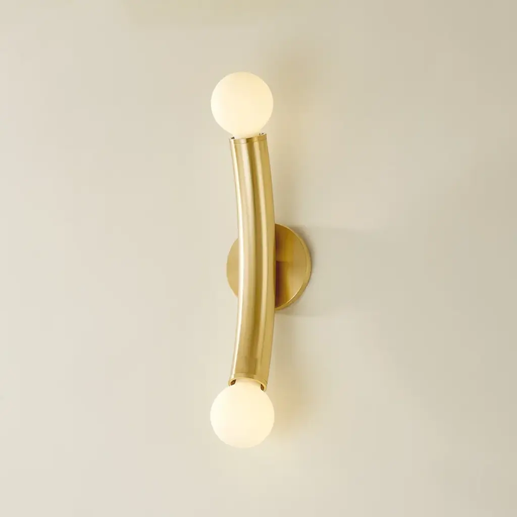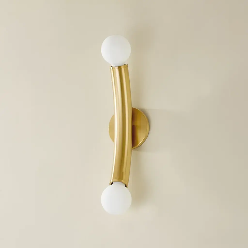 A deconstruction of the recognizable ring chandelier, Allegra breaks the circular form into separate staggered arcs. The arcs orbit around an Aged Brass orb at the center and the bulbs are deliberately spaced equidistant from each other creating an overall soothing, rhythmic effect. The wall sconce takes a single curved Aged Brass tube and mounts it on a circular backplate providing both uplight and downlight.