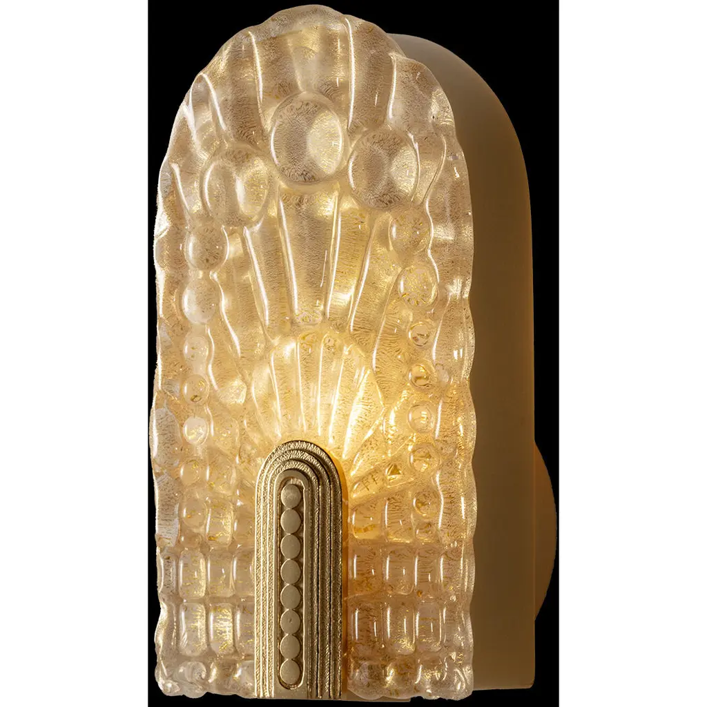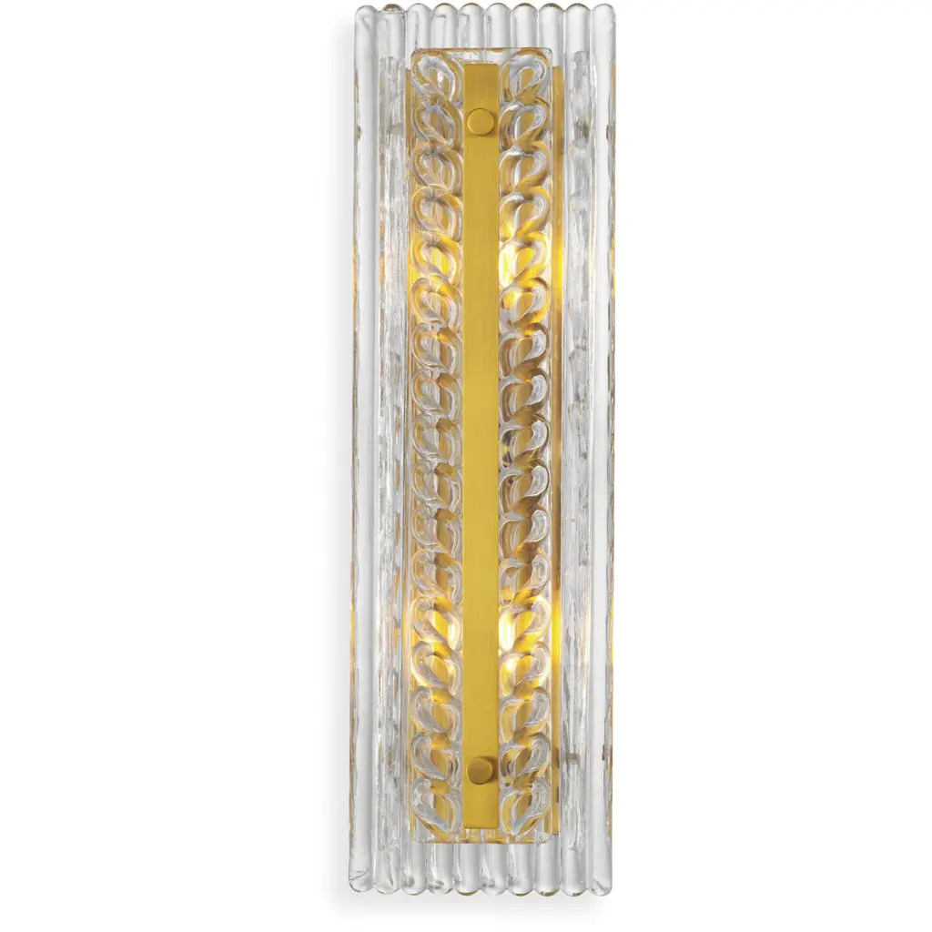 State of the art LED sconce in gold leaf finish, created by acclaimed interior designer Allison Paladino incorporates our exclusive studio process of dichroic rough-cut sculpted glass. Each gem is lit by hidden LED highlighting a subtle dual-colored refle
