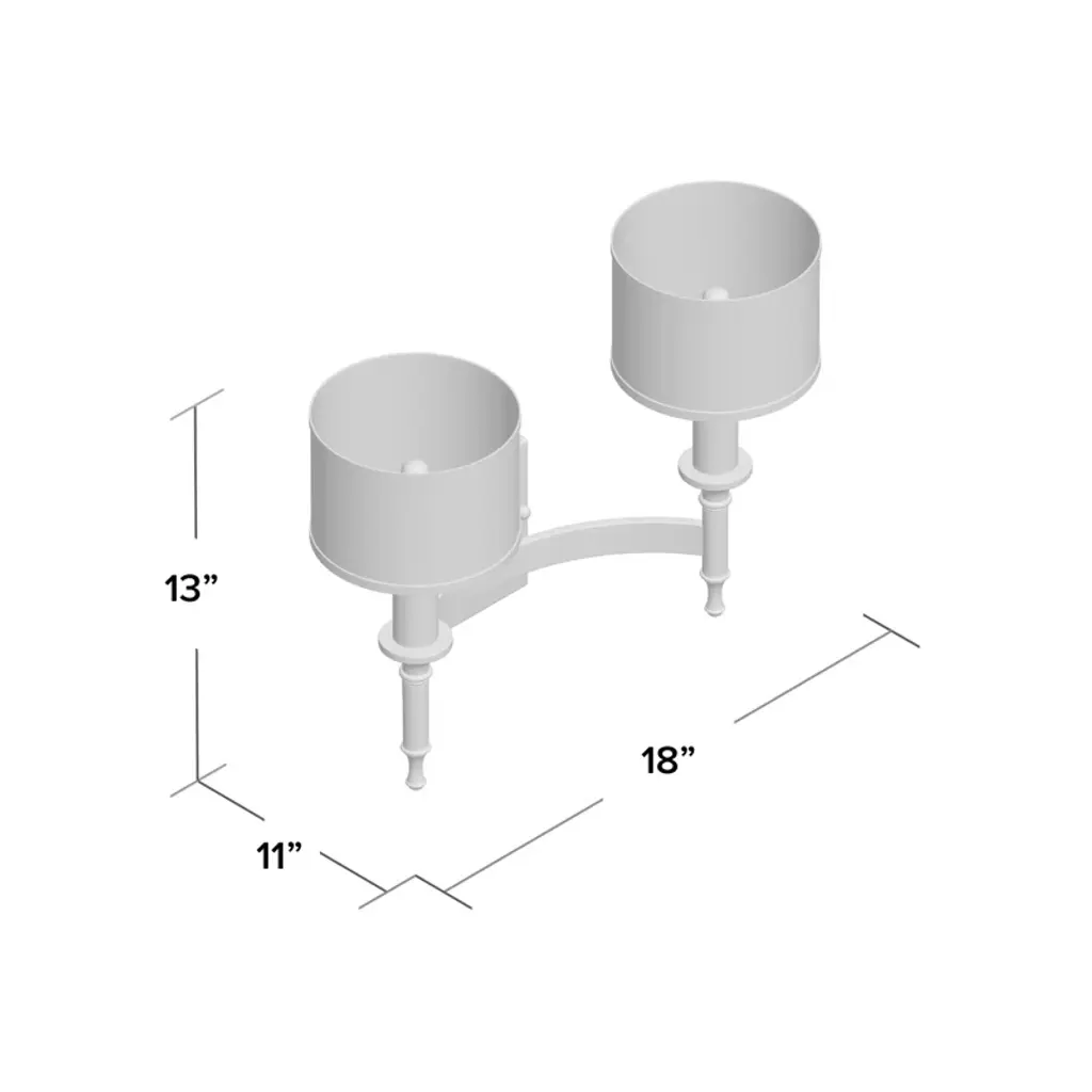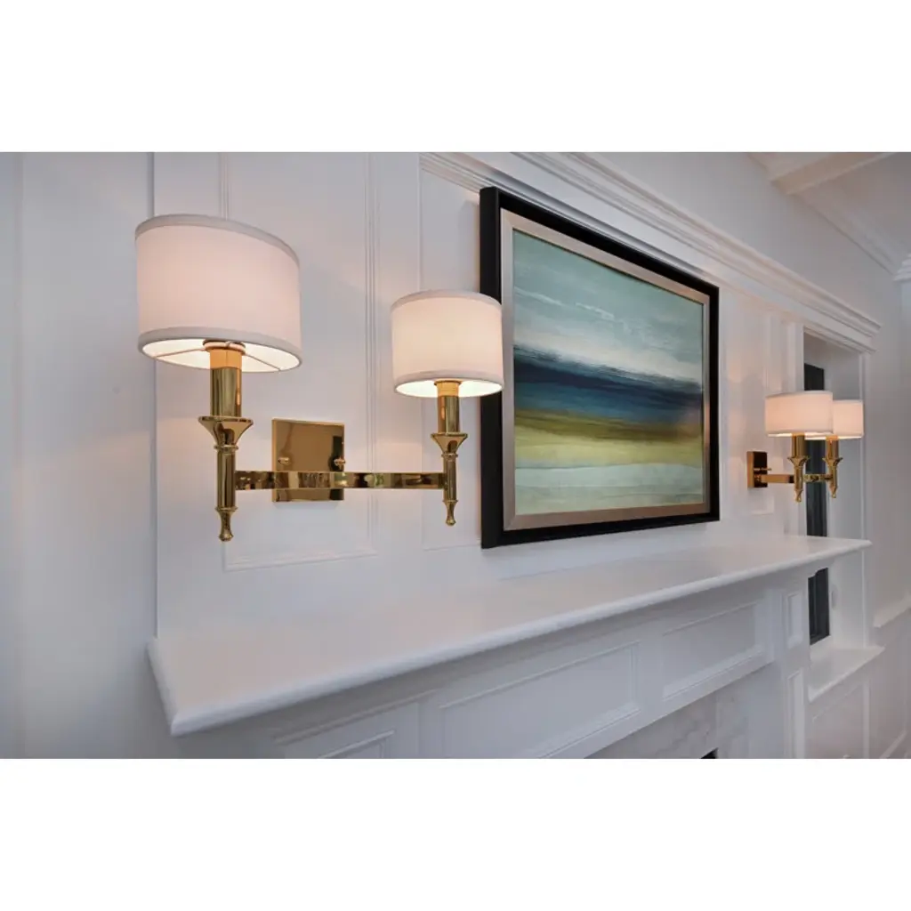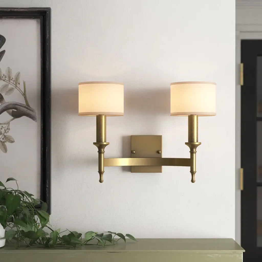 This 2-light sconce has a torchiere-inspired design that's right at home in any room, from the living room to the master suite. Its metal base, awash in a natural aged brass finish, has a pair of candle-style covers topped with petite white fabric drum shades. It accommodates one 60W bulb (not included) that brings a hint of brightness to your space. Plus, it's compatible with a dimmer switch so that you can adjust the light to your liking.
