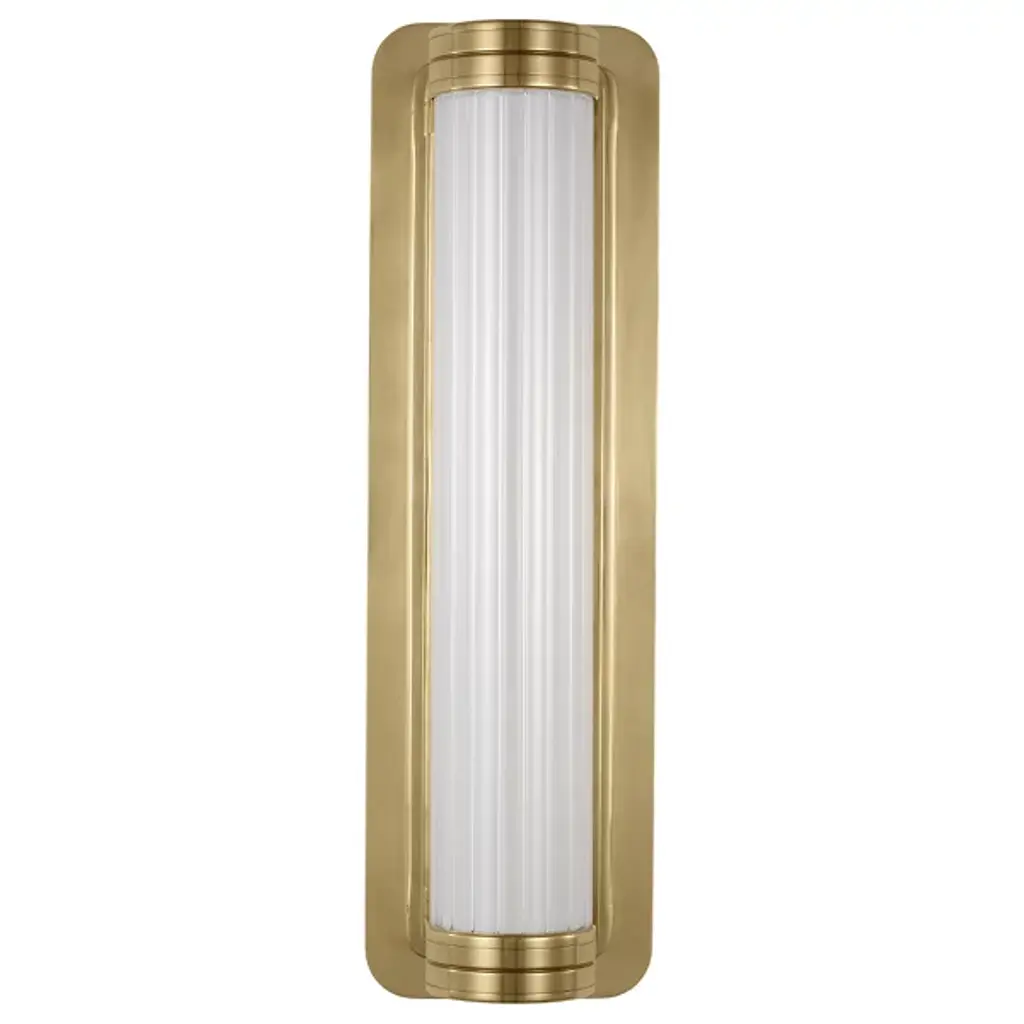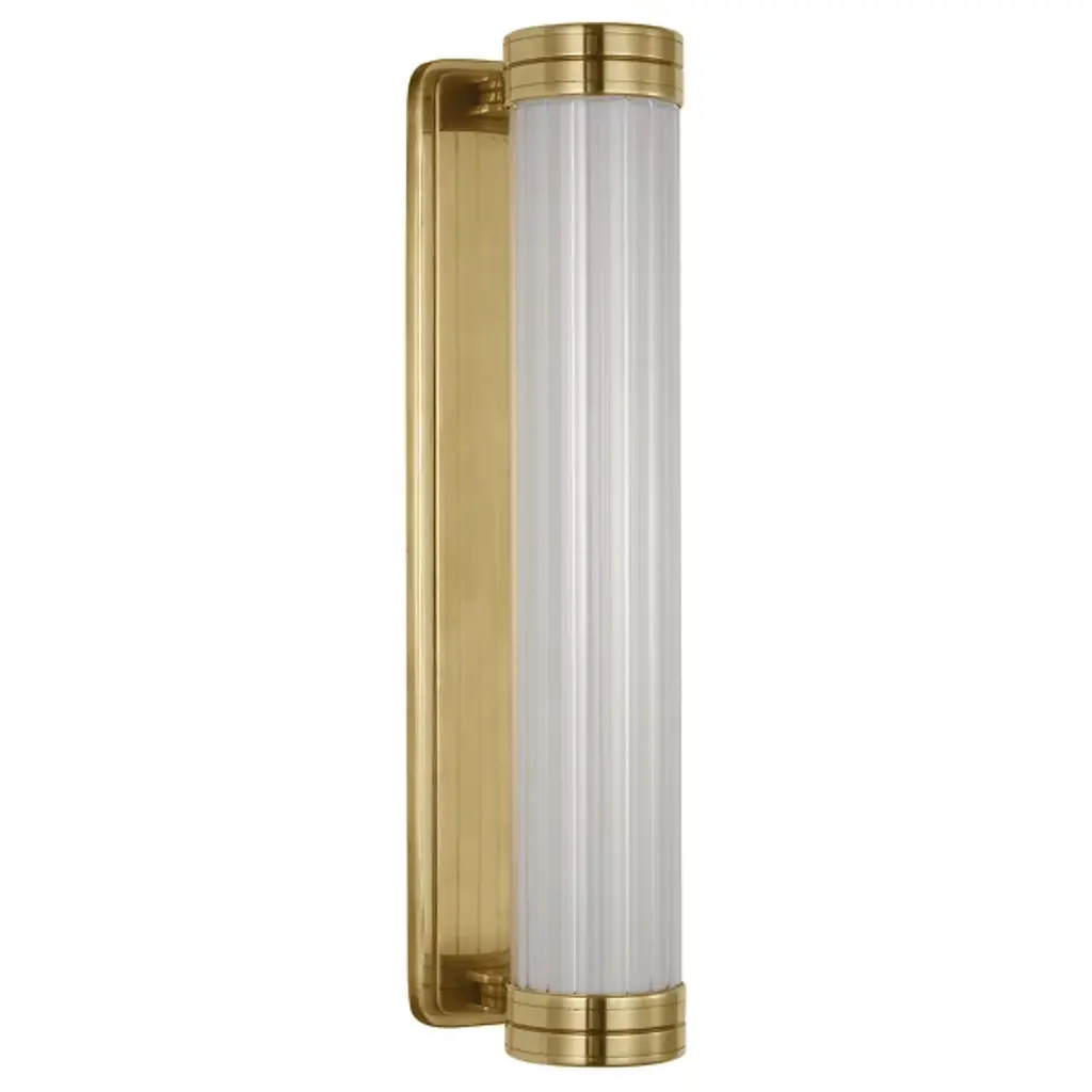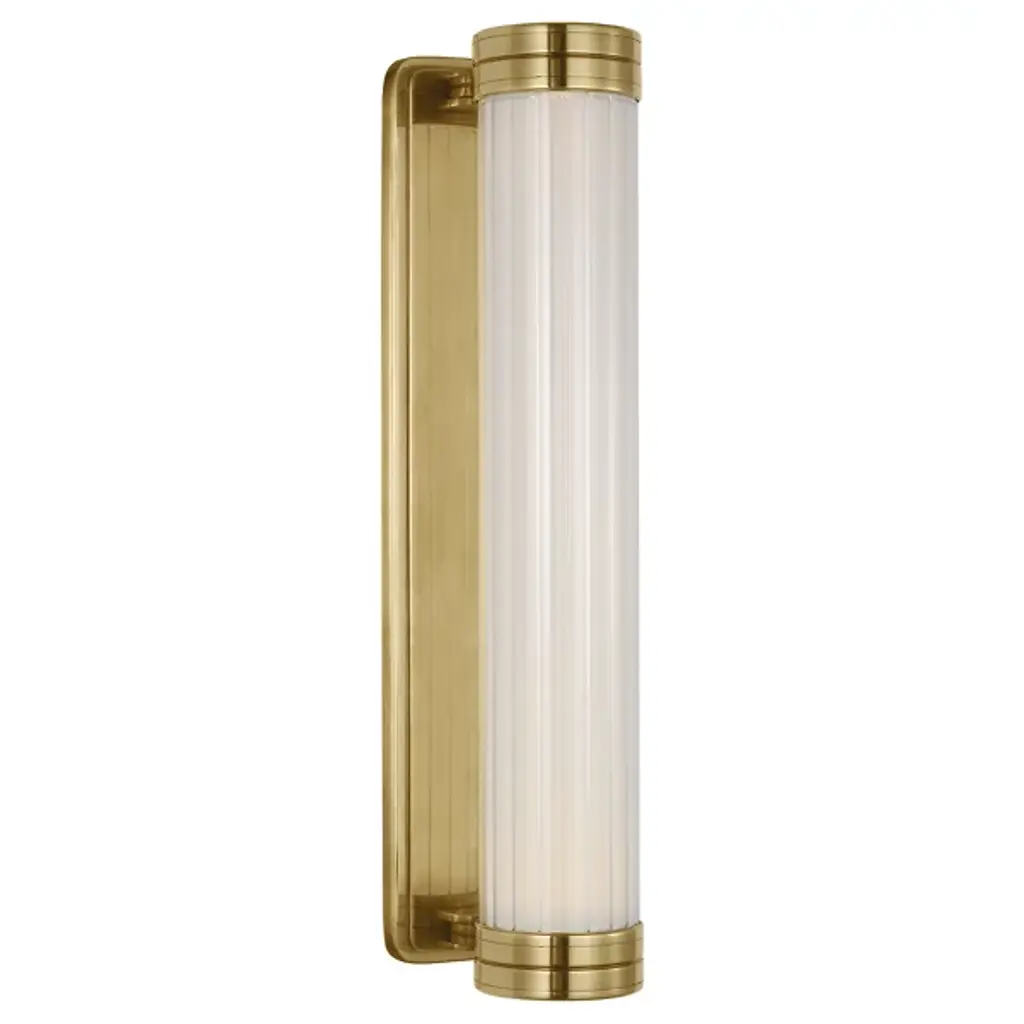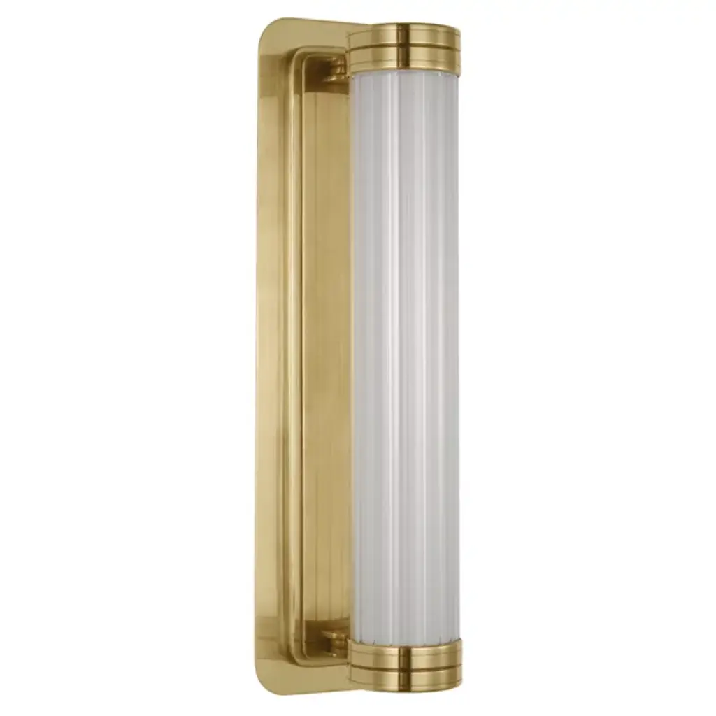 The Alo LED Wall Sconce from Visual Comfort Modern offers a refined, retro presence and soft illumination to indoor walls. Designed by Avroko, this fixture pairs a fluted glass cylinder with a clean-surfaced brass frame, casting a warm, ambient glow while. Each fixture is damp-listed and thoughtfully built, with fluted detailing on the diffuser adding intrigue. The simple structure becomes a refined accent for all manner of hallways, bathrooms, or bedside settings, making a lasting impression without dominating its surroundings.