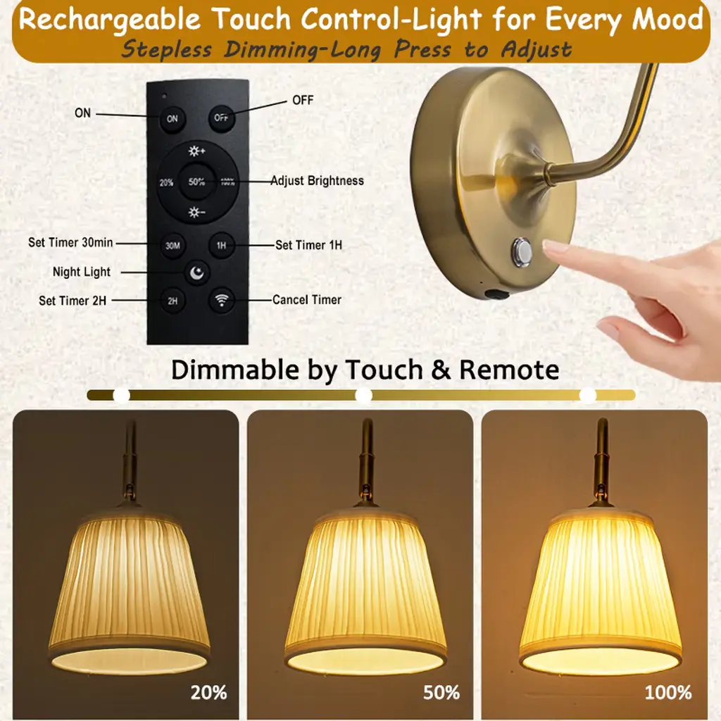 This USB-C rechargeable LED wall sconce blends timeless elegance with modern convenience, making it a versatile lighting solution for virtually any room in your home. Its warm brass finish pairs beautifully with an elegant pleated white fabric shade, effortlessly complementing a variety of décor styles—whether your space is modern glam, transitional, mid-century, or vintage-inspired. The integrated LED casts a cozy, inviting glow that’s perfect for reading, relaxing, or adding ambient light to your space. Both remote and touch controls allow you to switch the light on or off, set a timer, and adjust brightness with stepless dimming from 20% to 100%, giving you complete control over your lighting mood. The fully adjustable swivel head rotates 360° horizontally and tilts up to 180°, so you can direct light exactly where it’s needed—making it ideal for bedside reading, bathroom vanities, dressing tables, hallways, living rooms, dining rooms, or entryways. Designed for convenience, this cordless fixture features a USB-C charging port for fast, easy recharging and eliminates the hassle of frequent bulb replacements. ETL Listed for damp locations, it’s safe for both dry and damp indoor environments, including bathrooms and kitchens. Backed by a 1-year limited warranty, this wall sconce delivers beauty, flexibility, and peace of mind in one stylish package.
