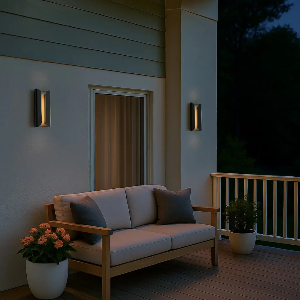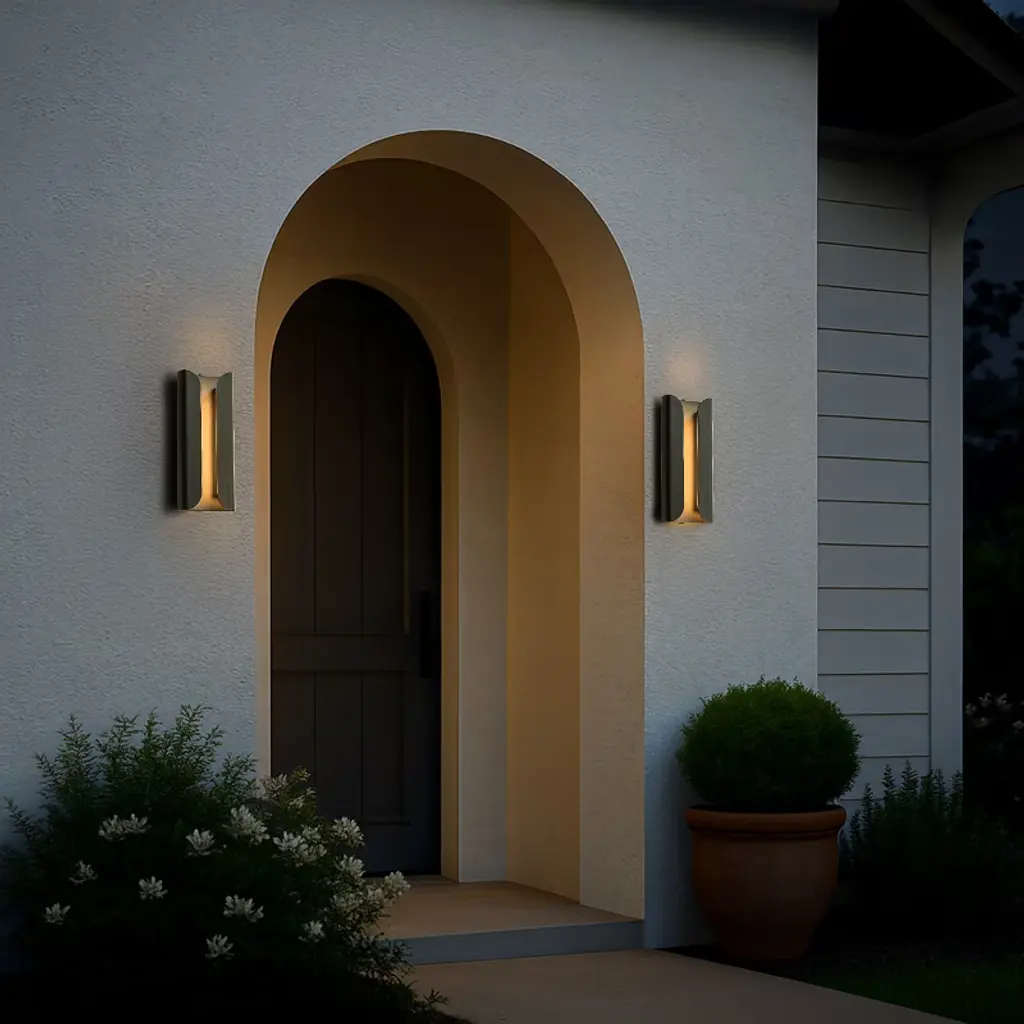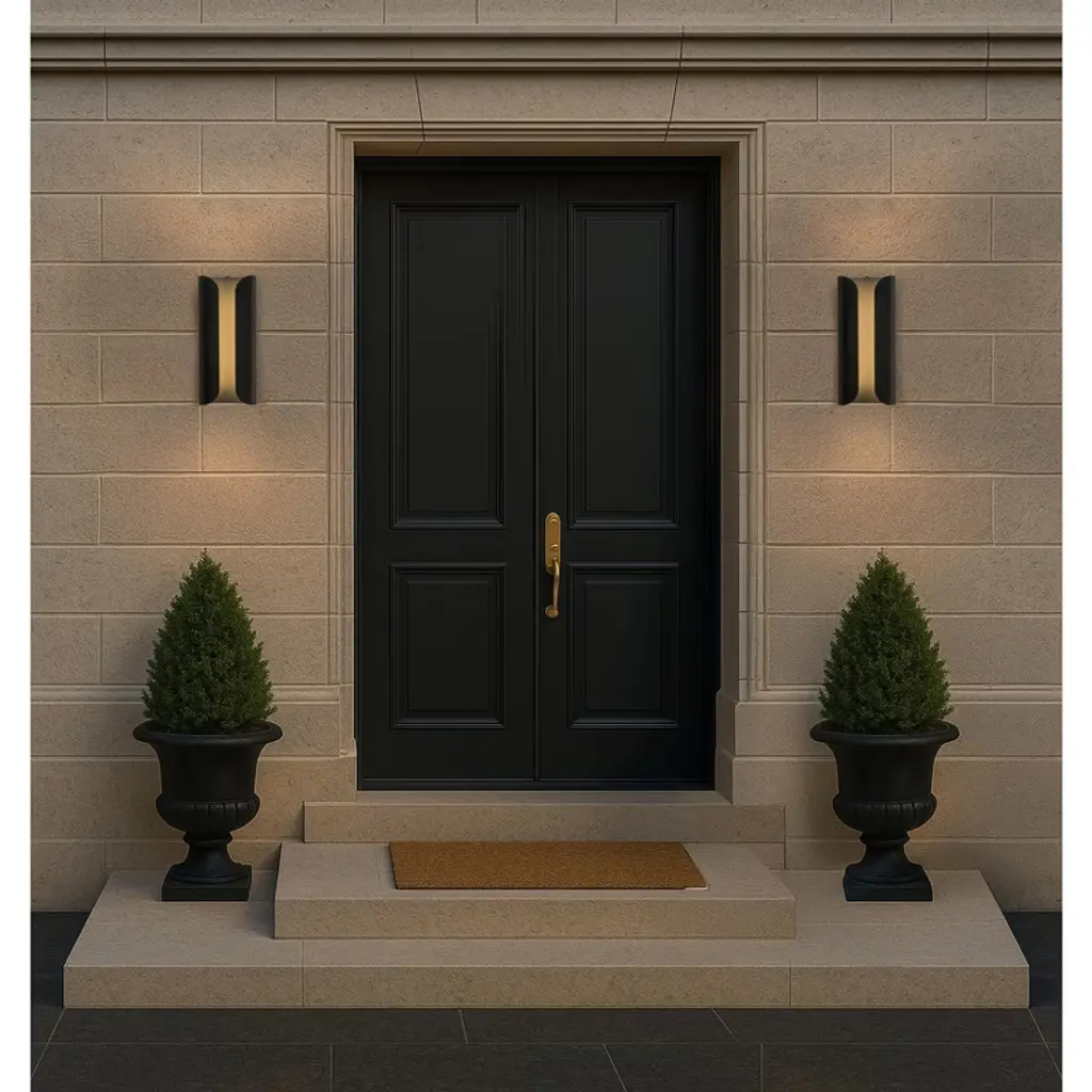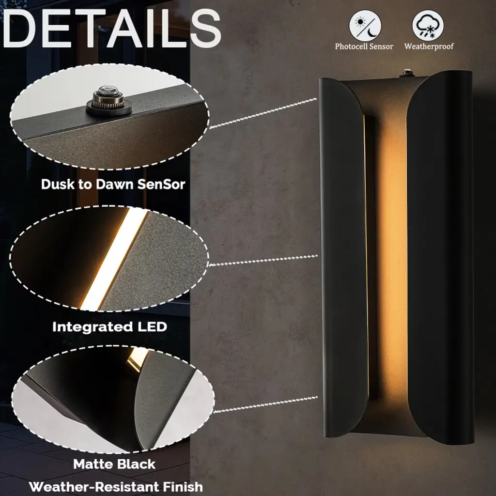Redefine your home's exterior with this 2-pack modern outdoor wall sconce, crafted to combine smart lighting with sculptural design. The distinct curved silhouette and matte black iron finish bring bold elegance to your porch, patio, or garage - a perfect fit for modern and contemporary spaces. Equipped with a dusk-to-dawn photocell sensor, these fixtures automatically light up at sunset andturn off at sunrise, saving energy while keeping your property illuminated. The integrated 24W LED light strips emit a warm 3000K glow (1920 lumens) through a white acrylic diffuser, creating a soft,inviting ambiance that enhances security and style. Engineered for outdoor use, these lights are waterproof sun-proof, snow-proof and wind-resistant making them a reliable choice all year round. Their 15-inch height and unique curved shape give your exterior walls a modern architectural upgrade-sleek, smart, and built to last.