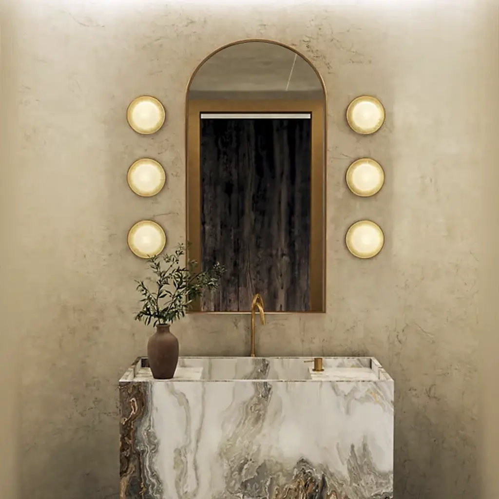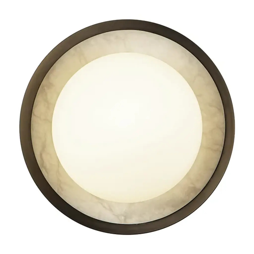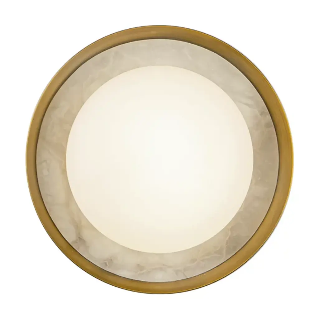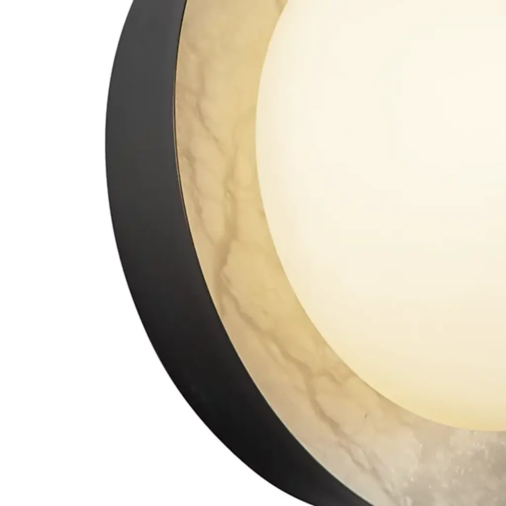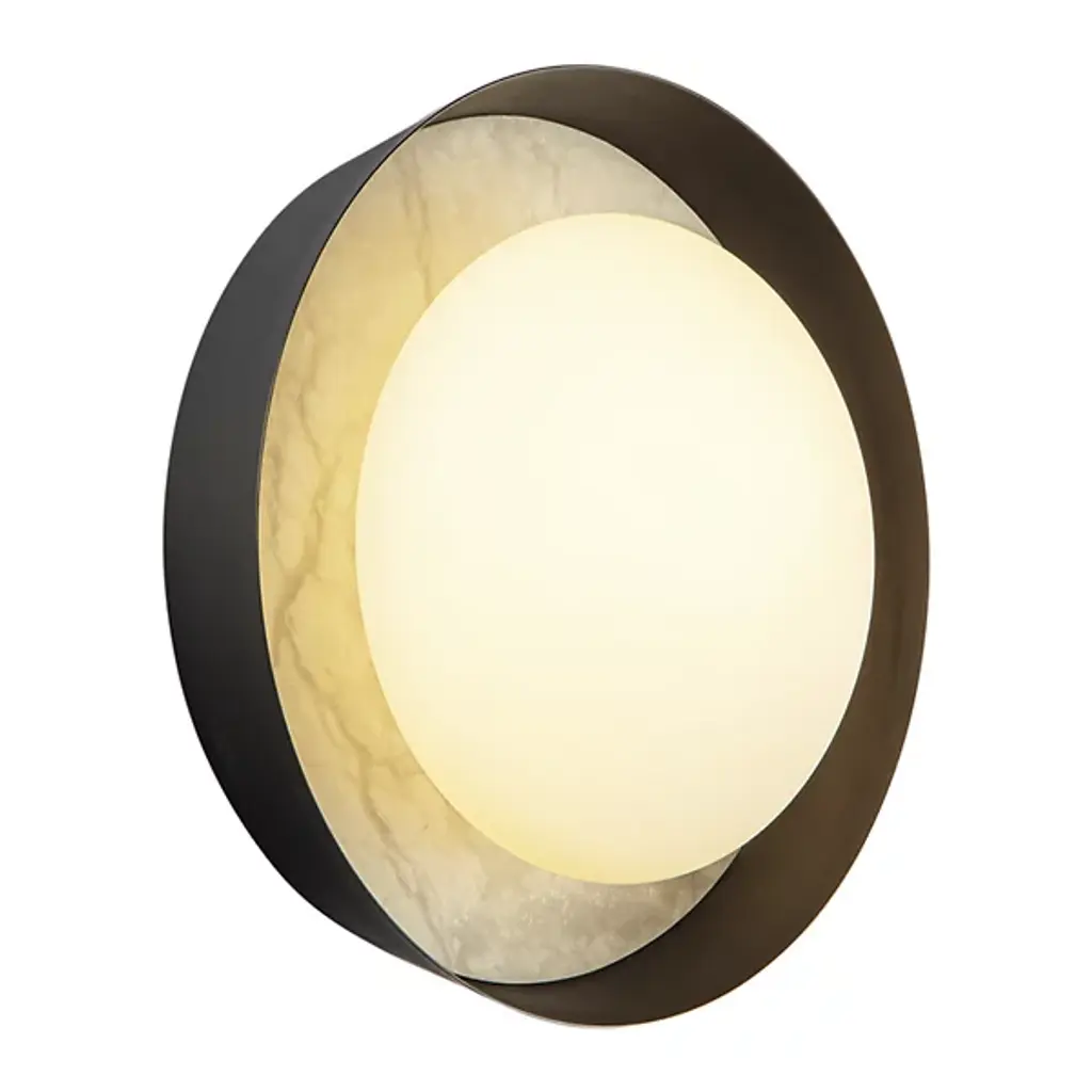 Meet the Alonso LED Wall Sconce from Alora Lighting, a harmonious blend of retro style with smooth round shades. Precisely crafted from aluminum and steel, it shows a ring surrounding a central alabaster disc that showcases its natural beauty. Integrating alabaster as a decorative backplate element. A rounded opal glass shade mellows the lamp’s bright glare, striking a balance between traditional and modern aesthetics. Natural variation in the alabaster ensures each piece is one-of-a-kind, adding timeless allure to walls.
