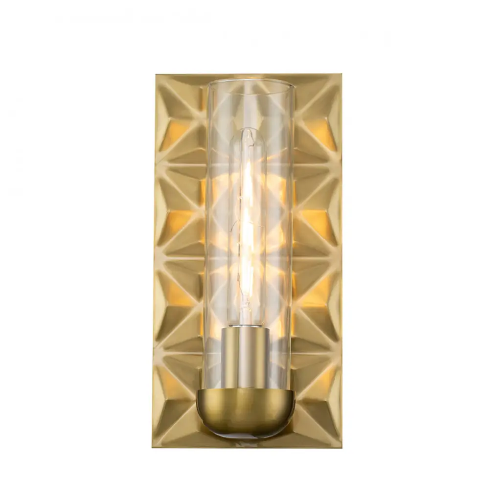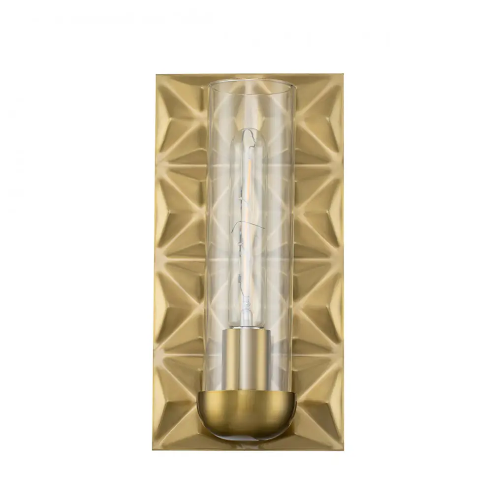 Alpha 1 Lt sconce in Aged Brass. Geometric pattern offered in Transitional design with Glass Candle Cover of 1 60w light. ADA Compliant at 4" depth