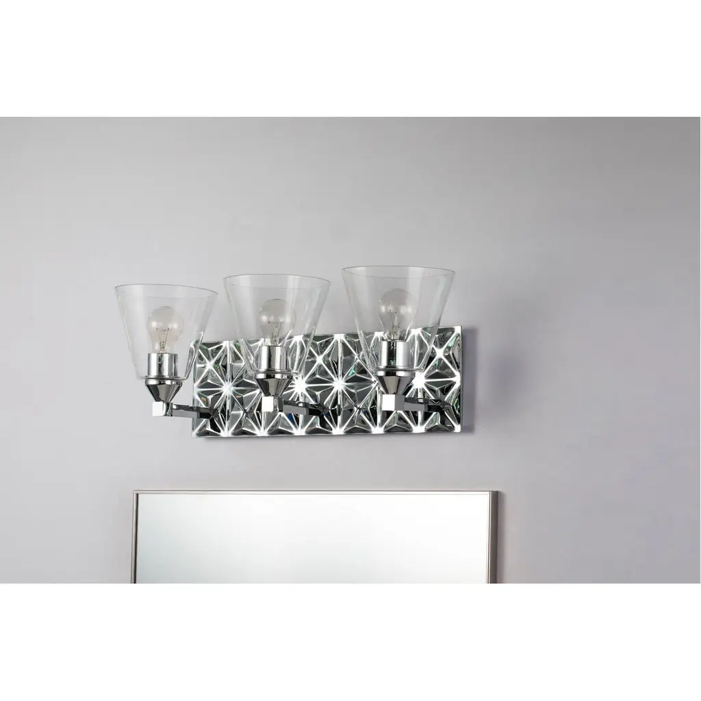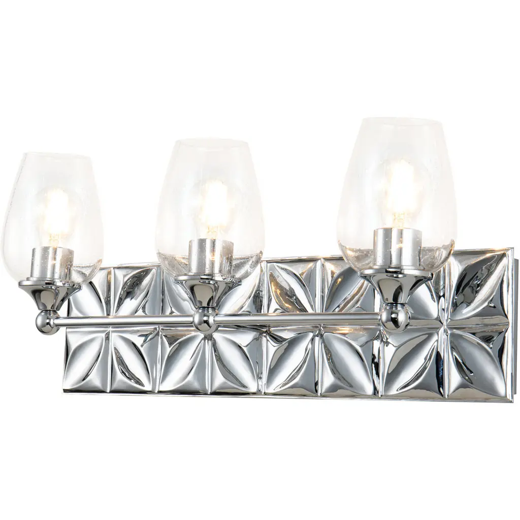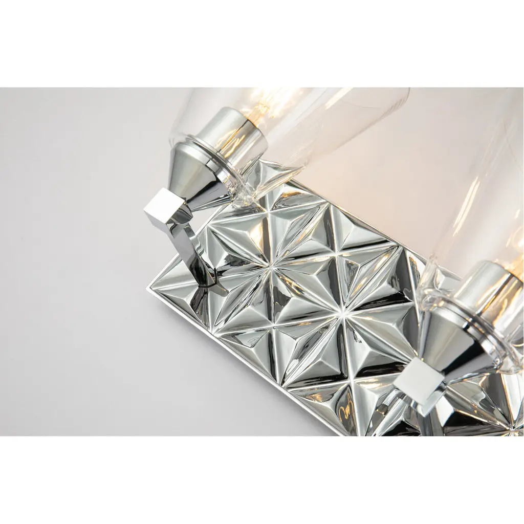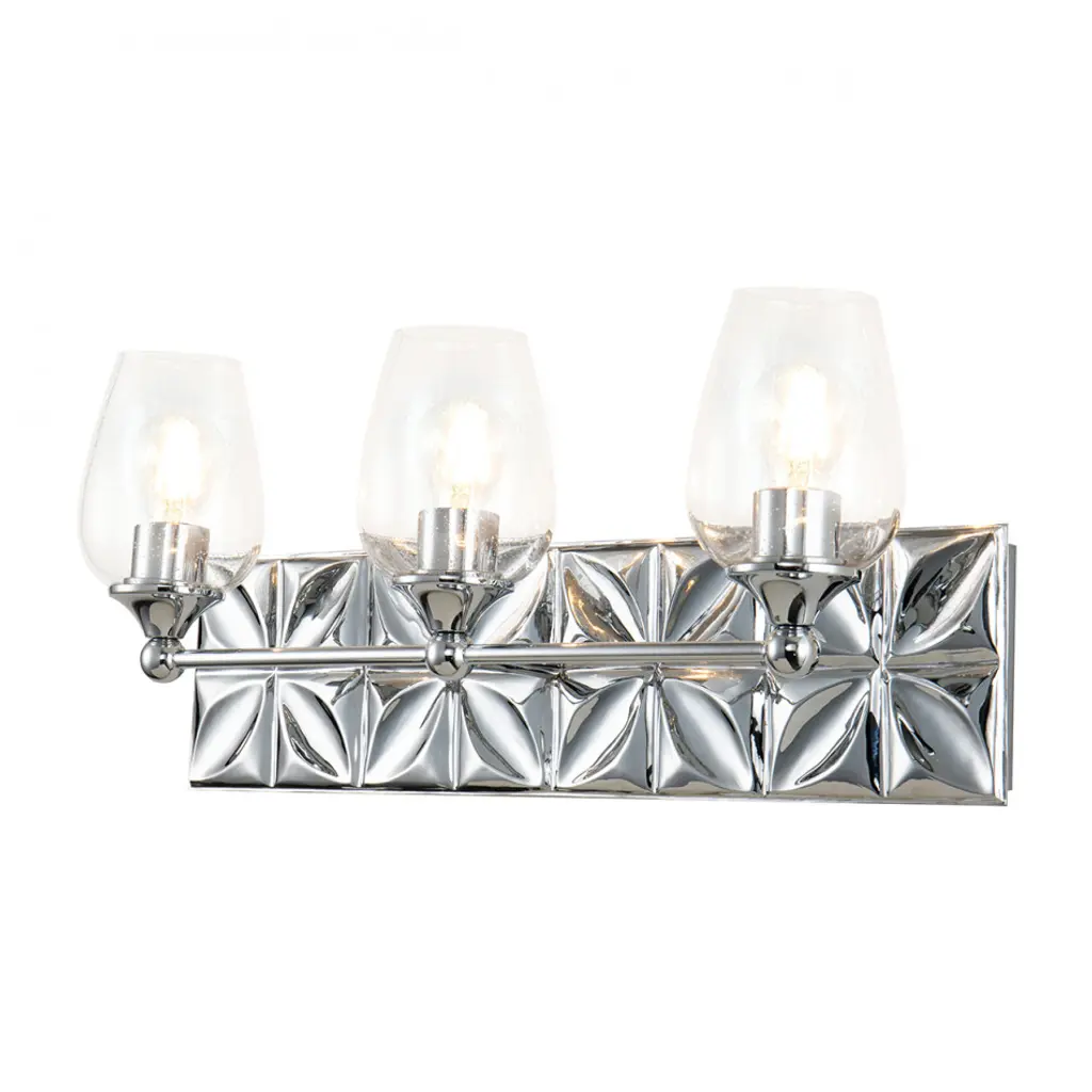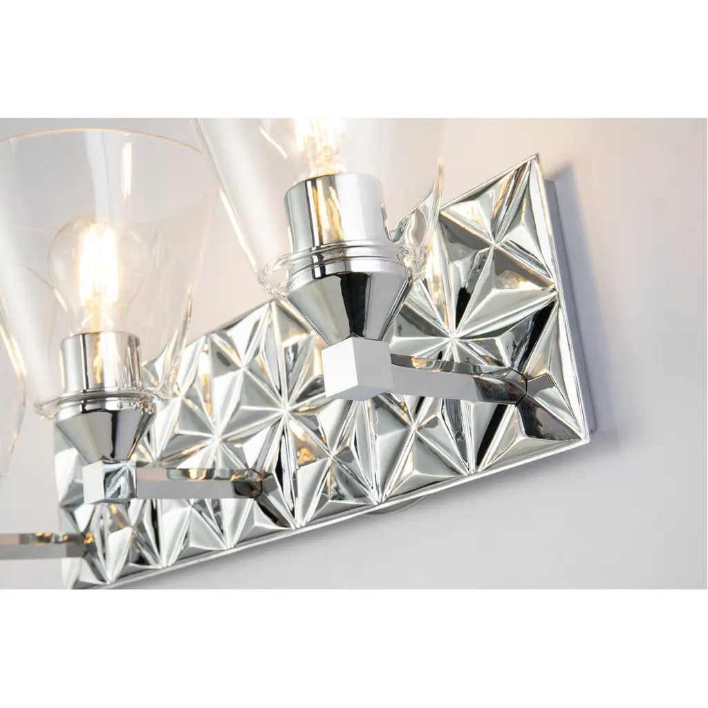 Always looking to add texture and dimension to a room, we created the perfect 3-light wall sconce. The 24.5 inch rectangle back plate with a pressed textured shape creates a modern design completing our intent. Showcasing the elegant polished chrome finish and a sleek cone-shaped, clear shade that can be mounted either up or down, we are giving that extra touch to show our attention to design and our love for the details.