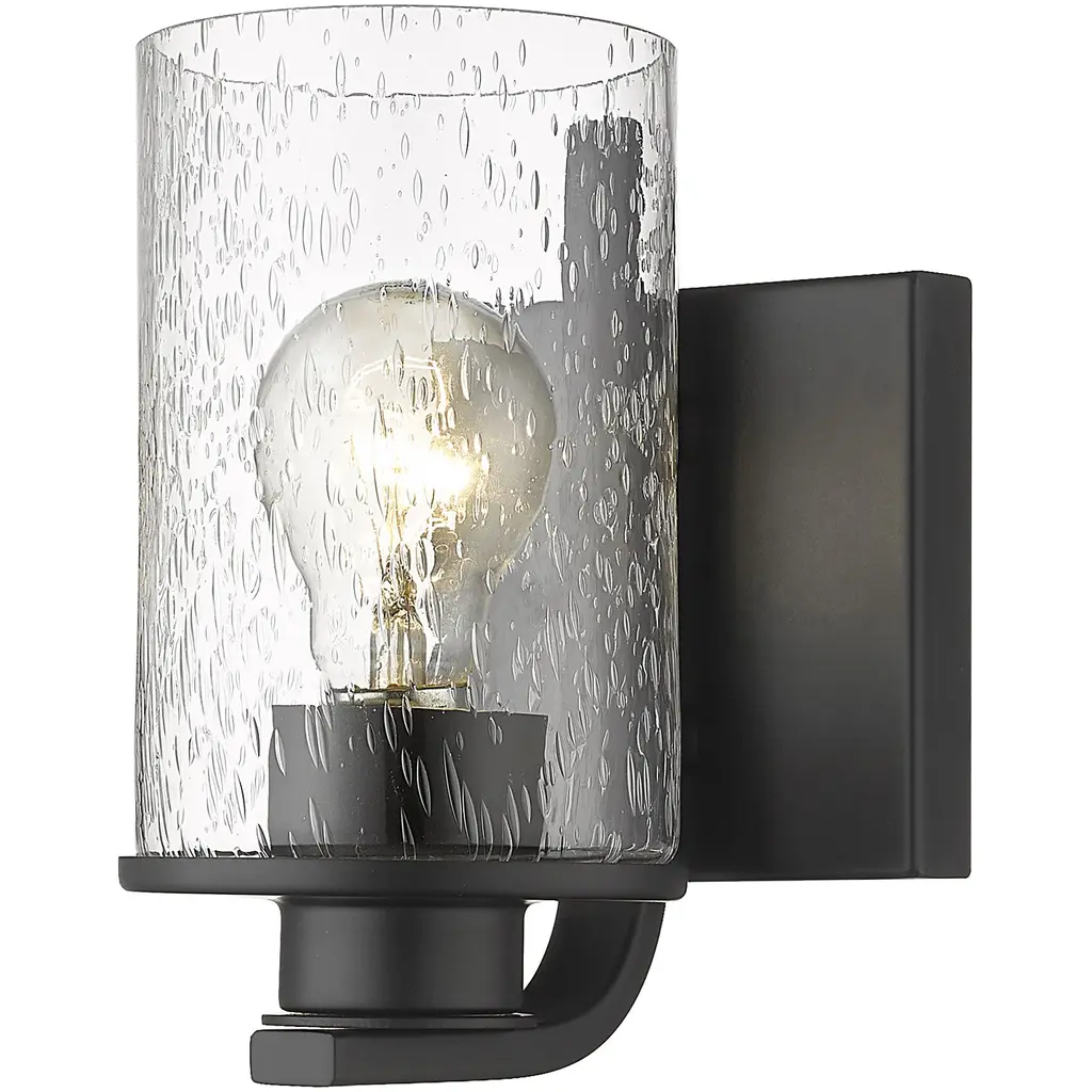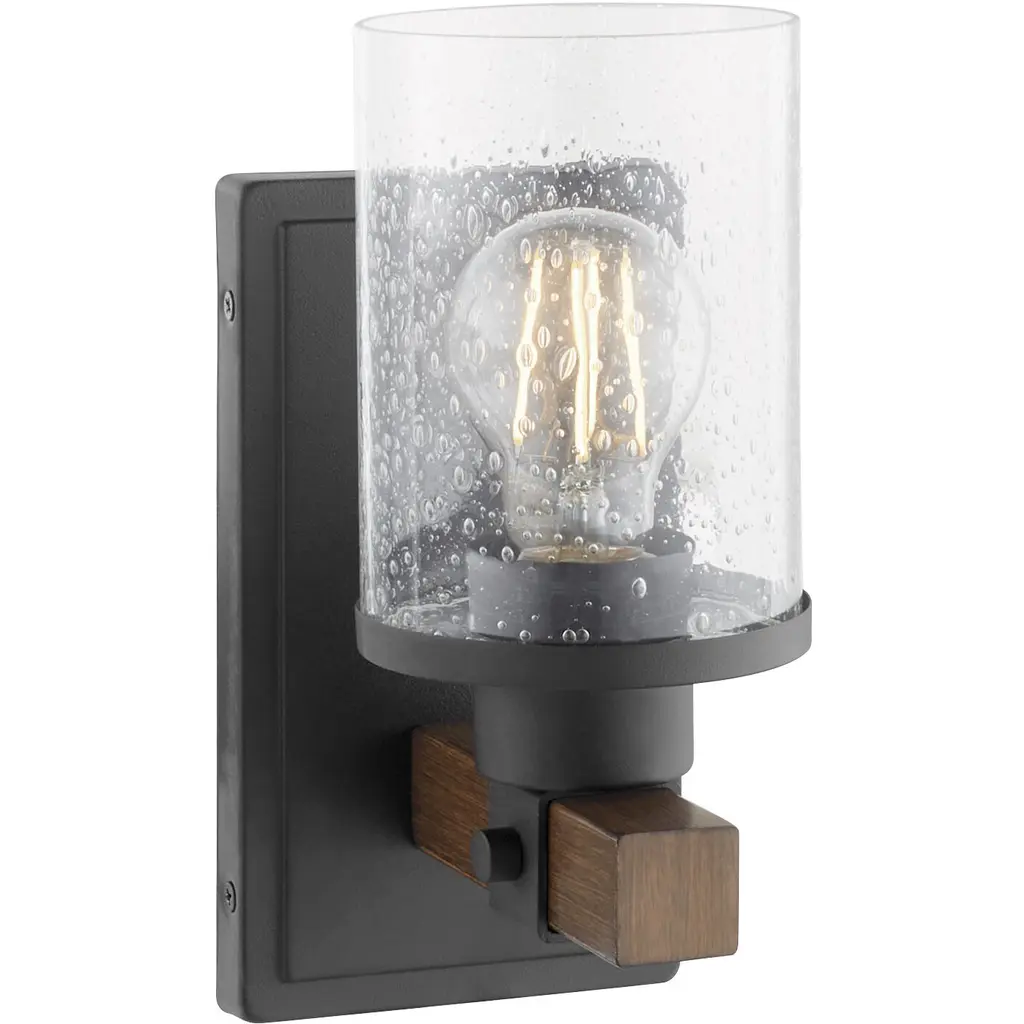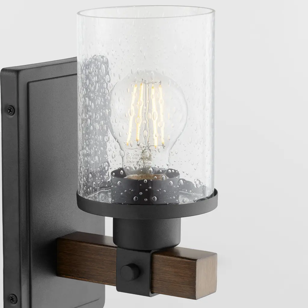 Add modern farmhouse charm to your home with this collection of vanities and wall mounts. Walnut finished wood and textured black steel combine with cylindrical glass shades to lend the collection industrial overtones. Boost the comfort and timeless aesthetic of your home with a 1 light wall mount.