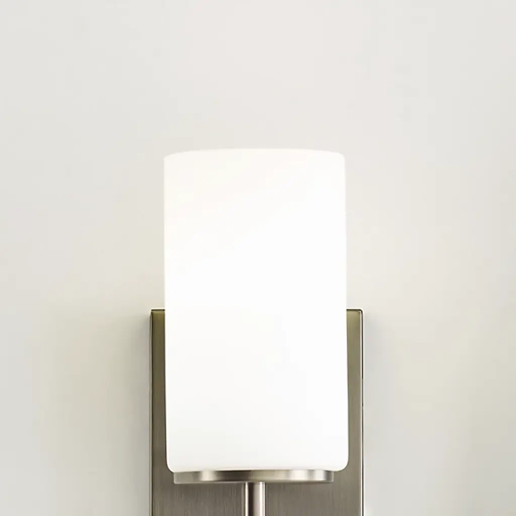 The Alturas Wall Sconce by Generation Lighting, formerly known as Generation Lighting, formerly known as Sea Gull Lighting,, brings that clean, contemporary look to your living space. Its sleek silhouette features a cylindrical Satin Etched glass shade that is supported by a low-profile, Brushed Nickel holder (with a similarly finished stem and wallplate). Once lit, a warm glow permeates the shade and reflects off the surrounding metal for a pleasant, yet functional ambiance.
