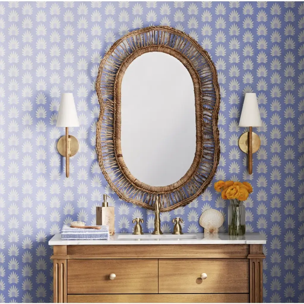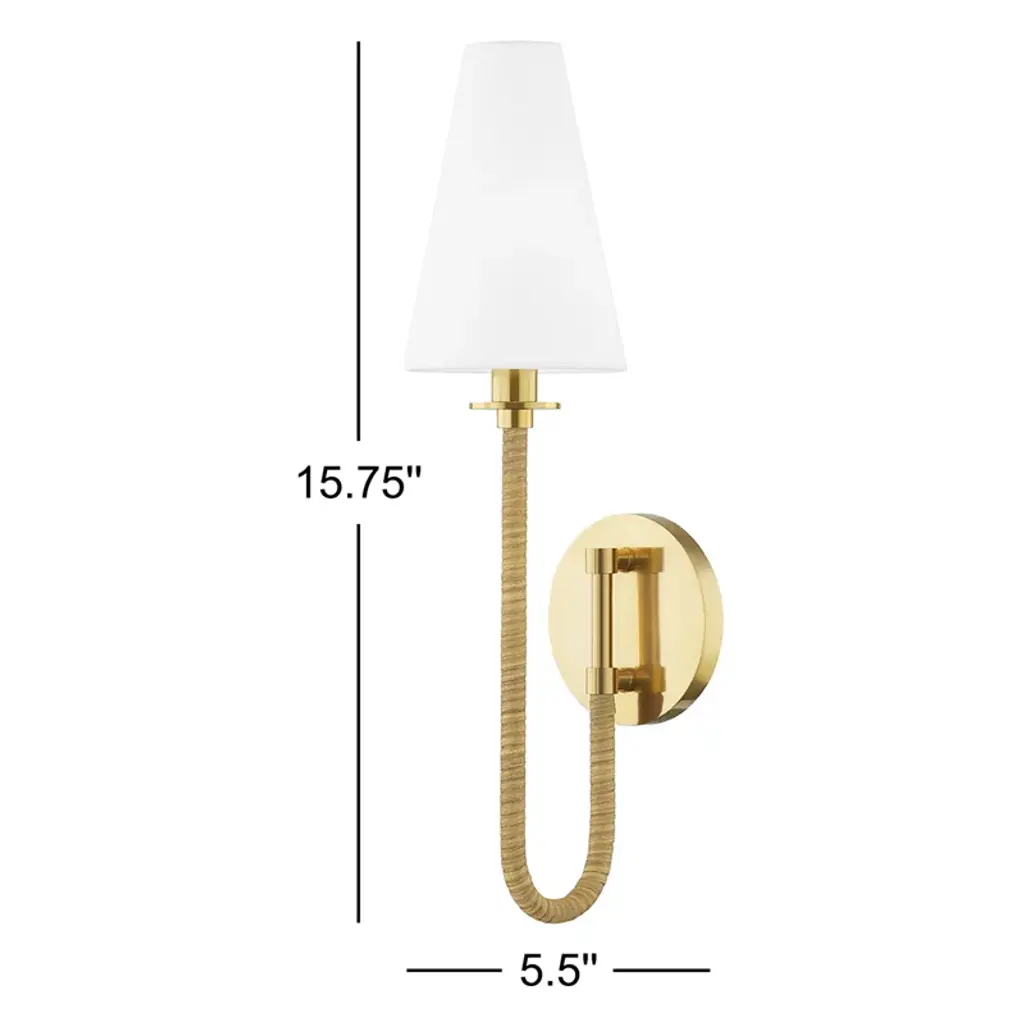 Rattan-wrapped arms support shades of white linen giving the entire fixture a natural warmth. Swooping arms add a modern feel to the traditional tapered shades while the aged brass accents complement the neutral colors, making Ripley the perfect addition to spaces of any style or palette.