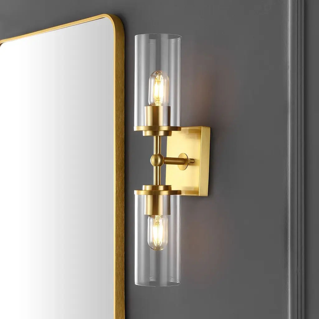 Elevate your wall decor with the sleek and charming presence of our wall sconce. Minimalistic aesthetics and a stunning mix of materials bring refined luxury and elegance to our wall light. Two slender cylindrical glass shades are arranged symmetrically to provide an even glow of light from each side. The wall sconce adds a touch of opulence and sophistication to any corner. Its slim and space-friendly proportions make it a stunning addition to a refined bedroom, powder bath, or any small space design.
