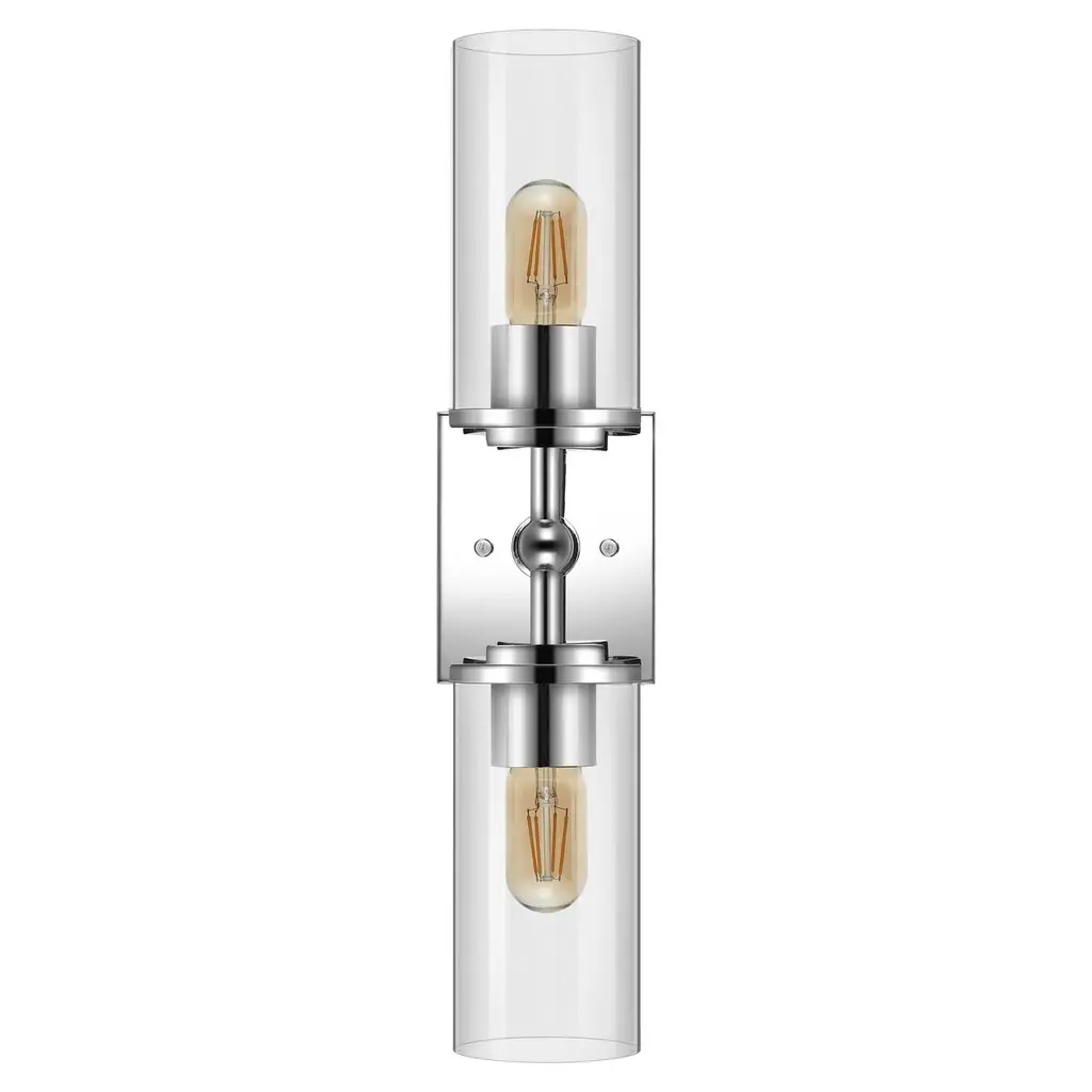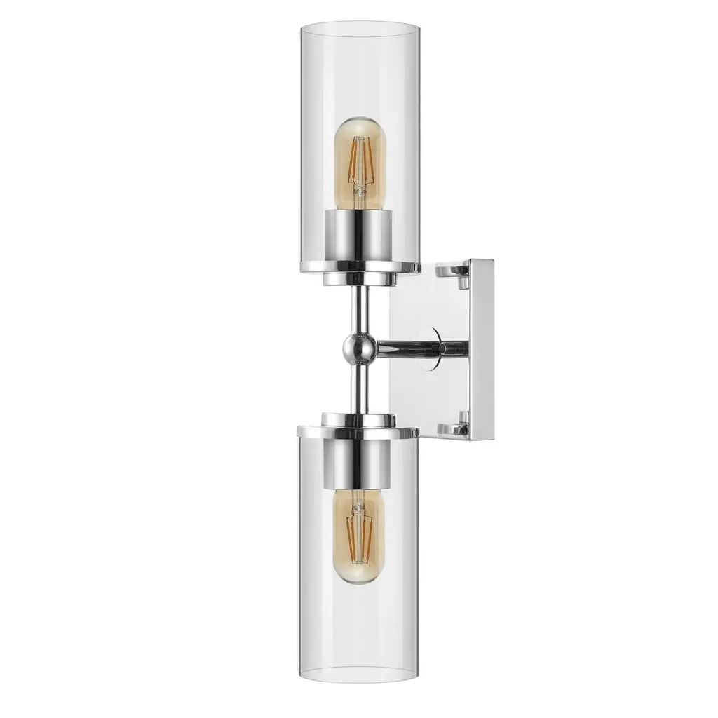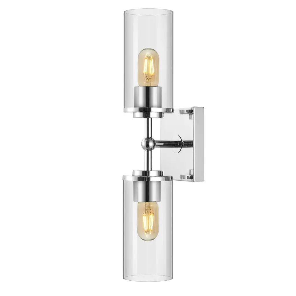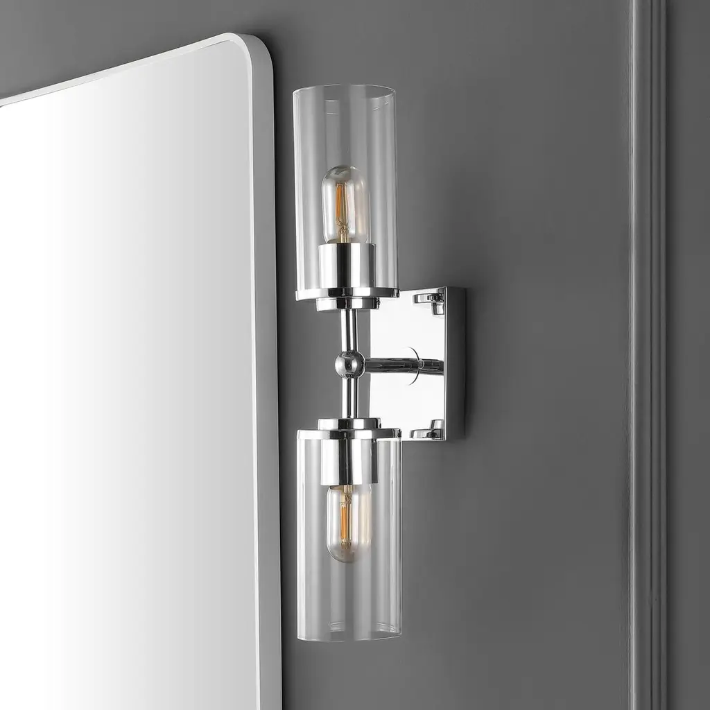 Elevate your wall decor with the sleek and charming presence of our wall sconce. Minimalistic aesthetics and a stunning mix of materials bring refined luxury and elegance to our wall light. Two slender cylindrical glass shades are arranged symmetrically to provide an even glow of light from each side. The wall sconce adds a touch of opulence and sophistication to any corner. Its slim and space-friendly proportions make it a stunning addition to a refined bedroom, powder bath, or any small space design.