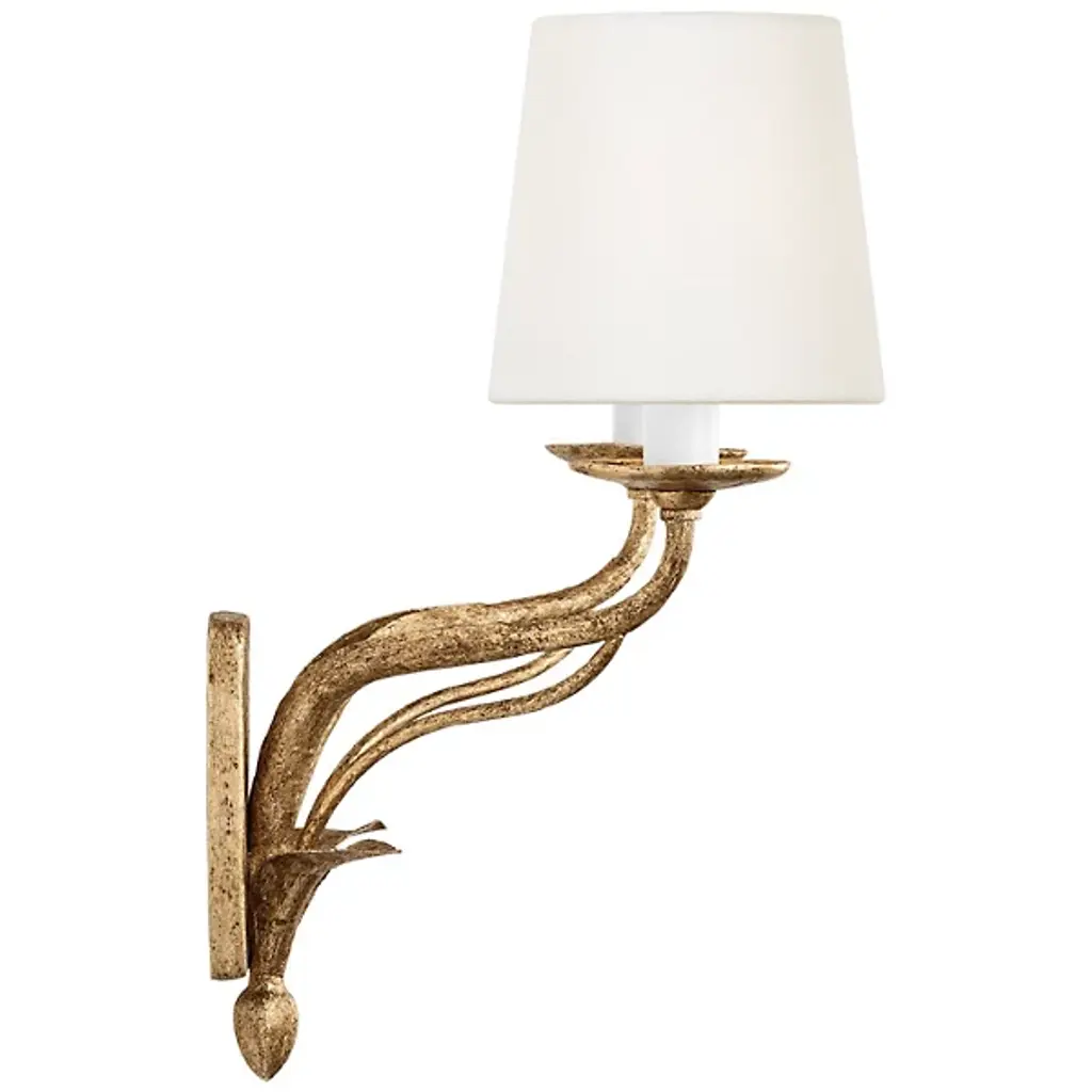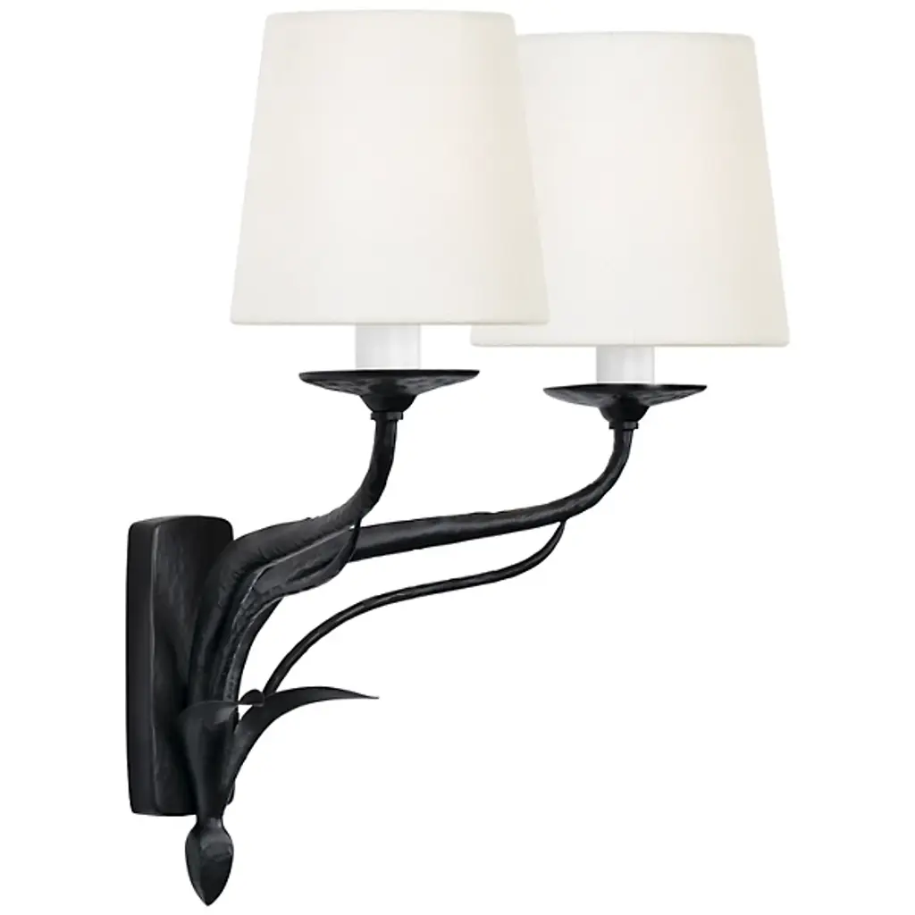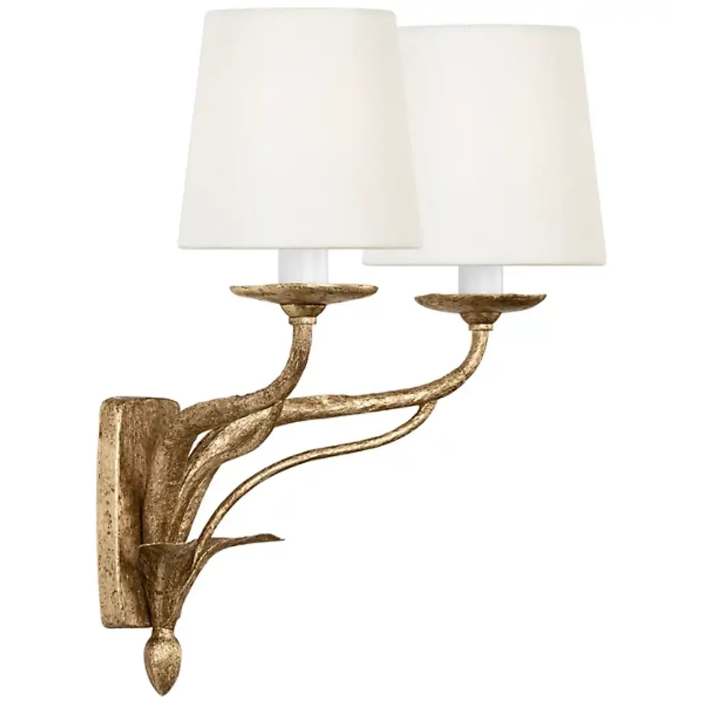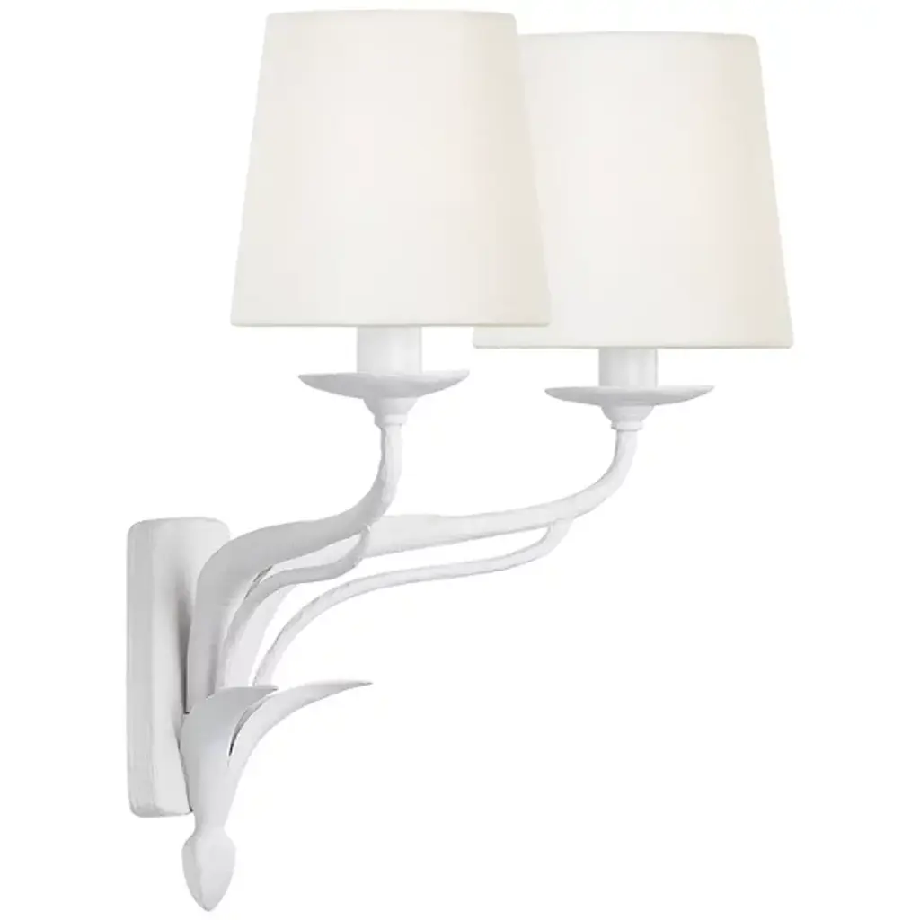 The Amalfi Double Wall Sconce by Visual Comfort Signature adds nature-inspired sophistication to any setting. A memorable design by Chapman & Myers, this sconce features a steel wall plate that diagonally extends two elegantly curved, branch-like arms, each supporting a flared linen shade around candelabra lamping. Damp-listed and durable, the design it combines rich, artisanal charm with a modern edge, while the lights cast a refined glow that enhances the texture of the metalwork below it.