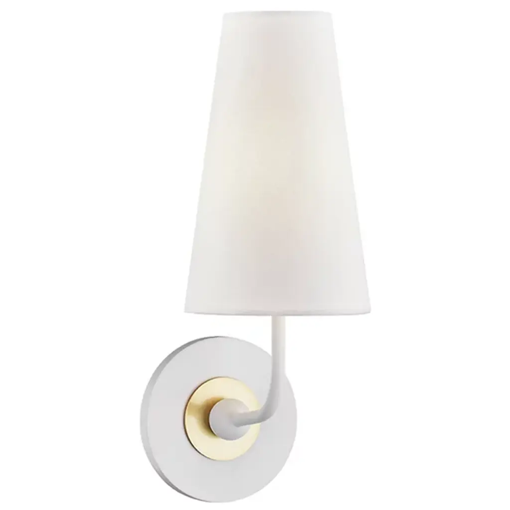 An exquisite combination of traditional design and modern flair, this wall lamp will make a sophisticated addition to any refined decor. Marked by a captivating geometric composition, the piece is mounted on a brass and metal structure with a satin gold finish, and features an elegant conical shade in white fabric (E14 max 5W lightbulb). Other finishes are available upon request.