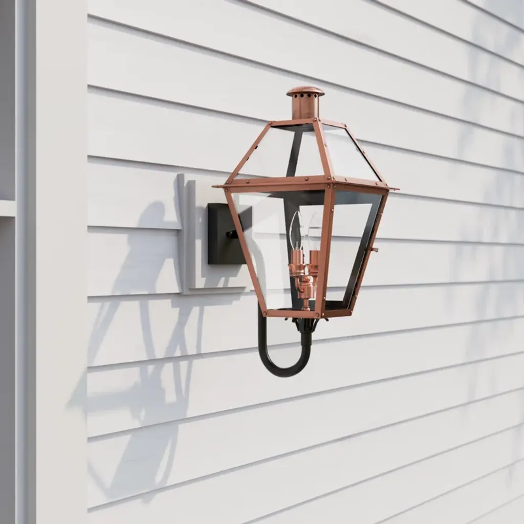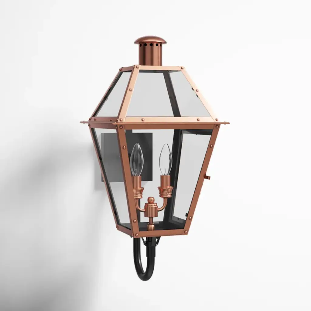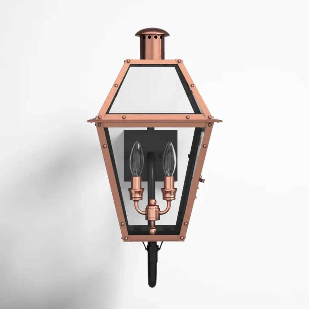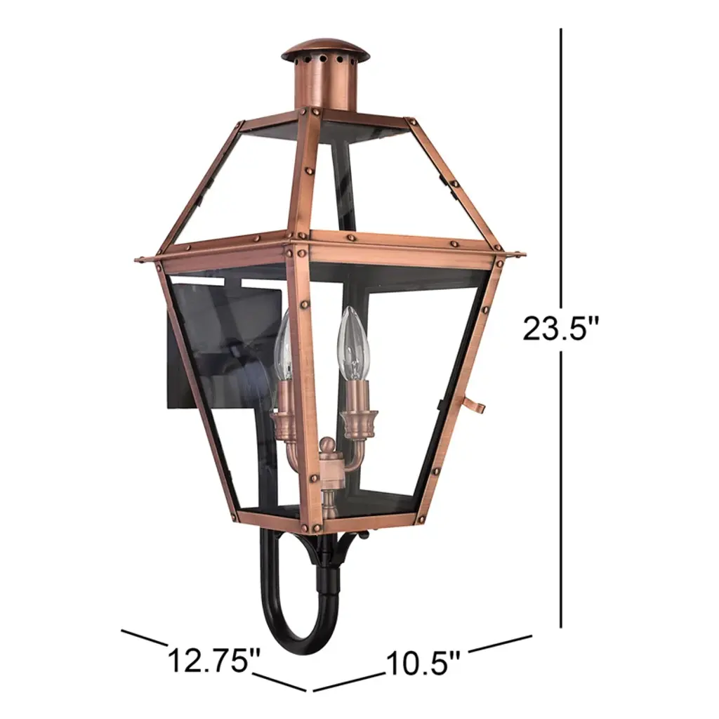 This 2-light outdoor wall lantern has a vintage-inspired design to welcome your guests with an heirloom touch at your front door. The frame is crafted from metal and clear glass in an empire silhouette, with an aged copper finish and rivets for a rustic feel. Its hardwired design holds up to direct water exposure out in the elements. This outdoor wall light gives off ambient lighting from two candelabra bulbs, so be sure to get some from your local hardware store. It also has a door that makes changing the bulbs easy.