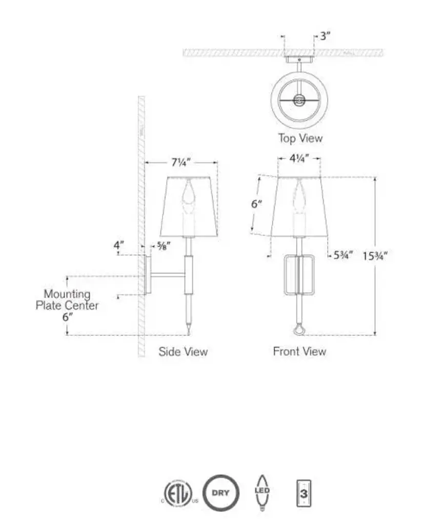 Inspired by natural materials, elements are brought to life with the simple lighting of Amber Lewis' Griffin series. Lending a touch of sophistication to ceilings and walls alike, the clean designs feature curved lines and unique accents like leather wrapping and chains that add textural details to any room. Designer: Amber Lewis Height: 15.75" Extension: 7.25" Backplate: 3" x 4" Rectangle Mounting: Hardwire Shade Detail: 4.25" x 5.75" x 6" Socket: E12 Candelabra Wattage: 6.5 LED B11 Safety Rating Location: DRY Note: Requires Smaller Outlet Box Assembly Required? Yes