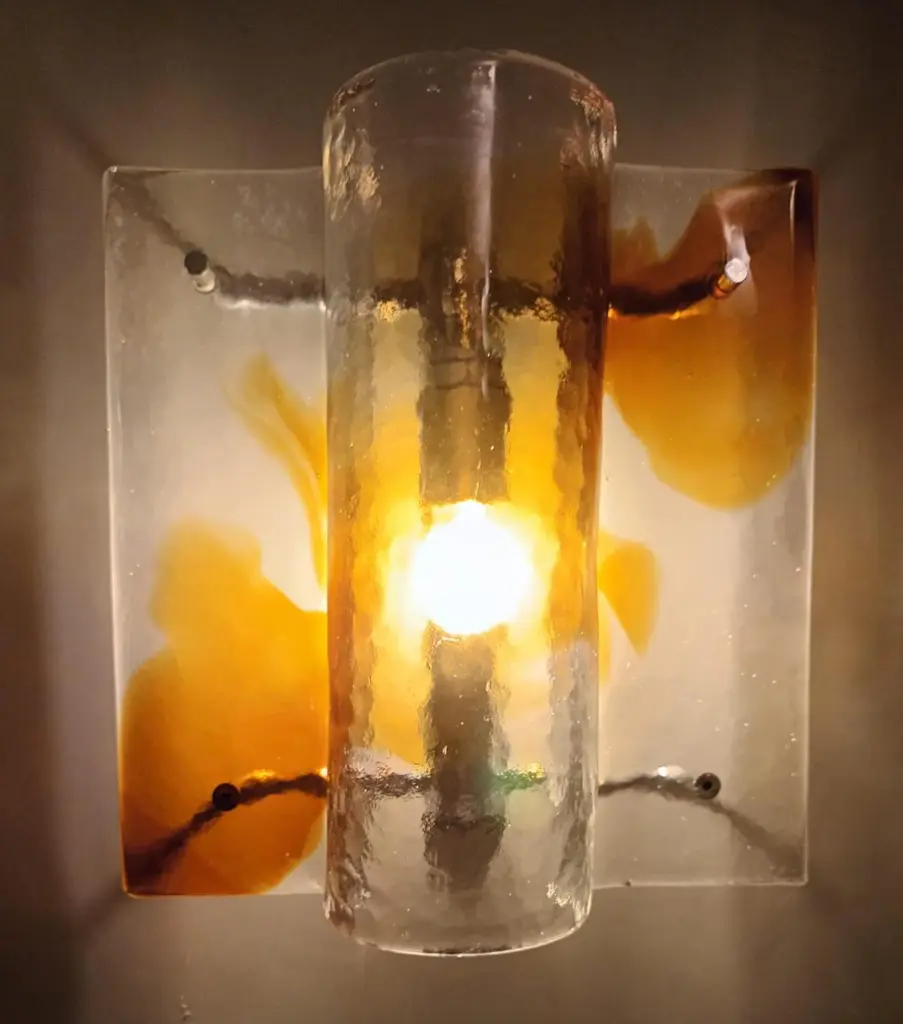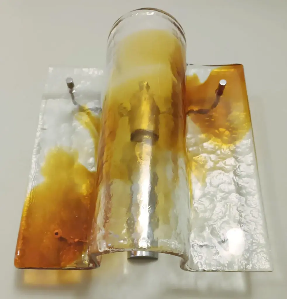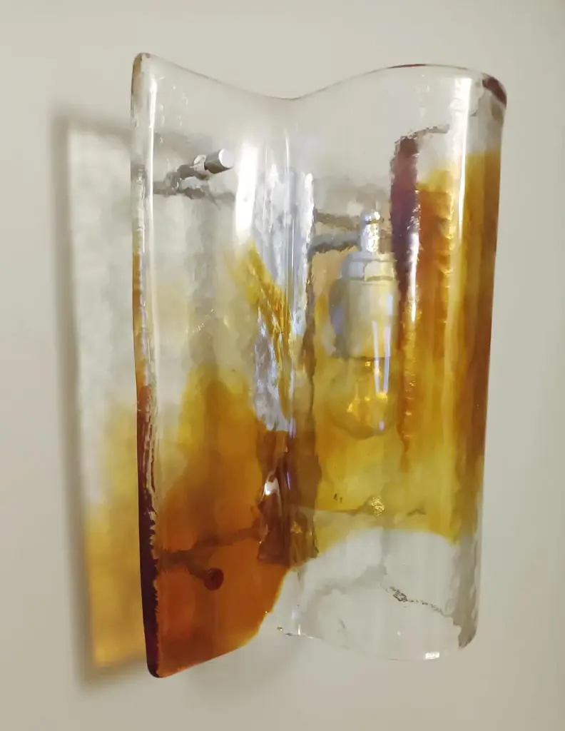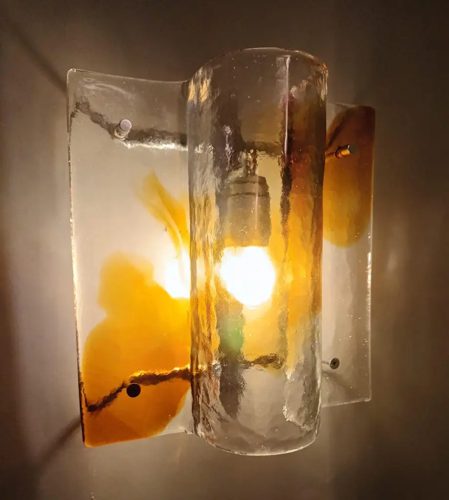 Italian wall lights with clear and amber Murano glass shades mounted on chrome brackets / Made in Italy by Mazzega, circa 1960s 1 light / E12 or E14 type / max 40W Measures: Height 12 inches, width 11.5 inches, depth 6 inches
