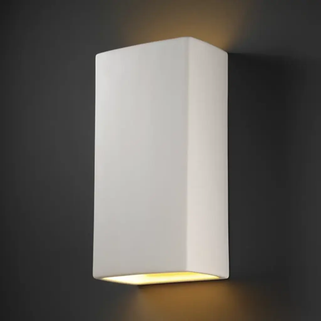 The Ambiance Up and Downlight Rectangle Wall Sconce by Justice Design Group is a highly versatile lighting design for virtually any modern space. The simple rectangular shade is molded by hand out of high-quality Ceramic, and it can be made to stand out or blend in with the wall surface or other surrounding décor, as desired. The design versatility of the wall sconce’s form also extends to its actual lighting functionality. A variety of available opening choices enables the creation of a customizable and super-functional lighting configuration throughout the home, with ambient light, accent light and even direct task light available wherever it’s needed.