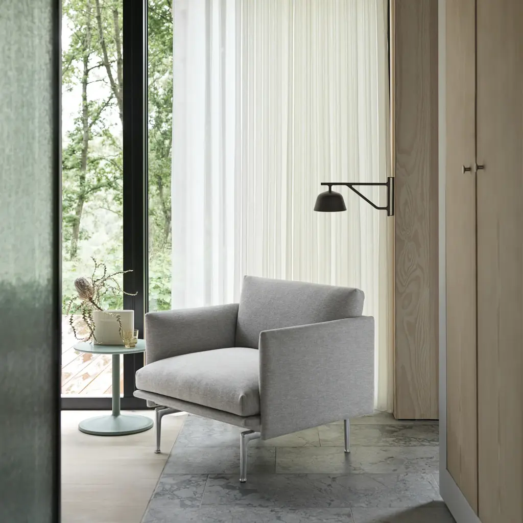 The wall version of Muuto’s Ambit rotates up to 120 degrees and the metal shade can be turned to each side for either direct or indirect light. Made of hand-spun aluminum, the shade has a hand-painted exterior with a white interior to enhance the light. Both timeless and contemporary, the design from Stockholm-based TAF complements both contract and residential settings.