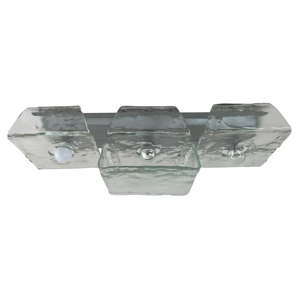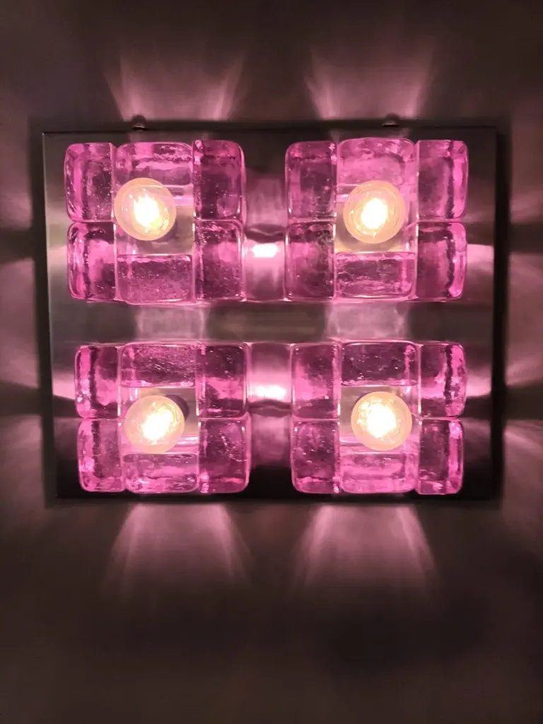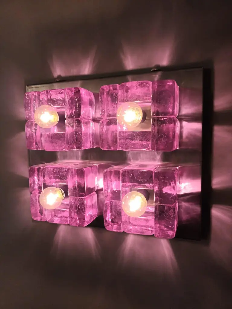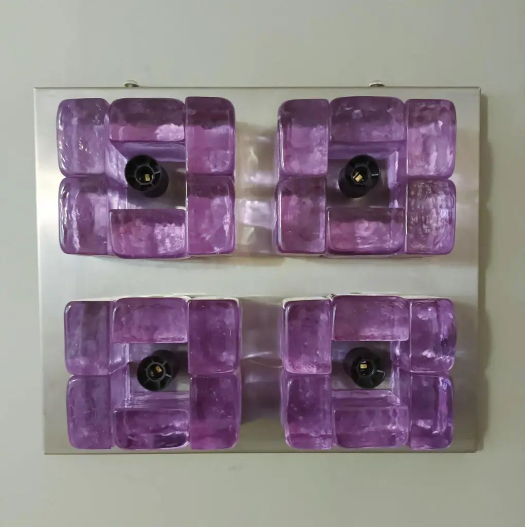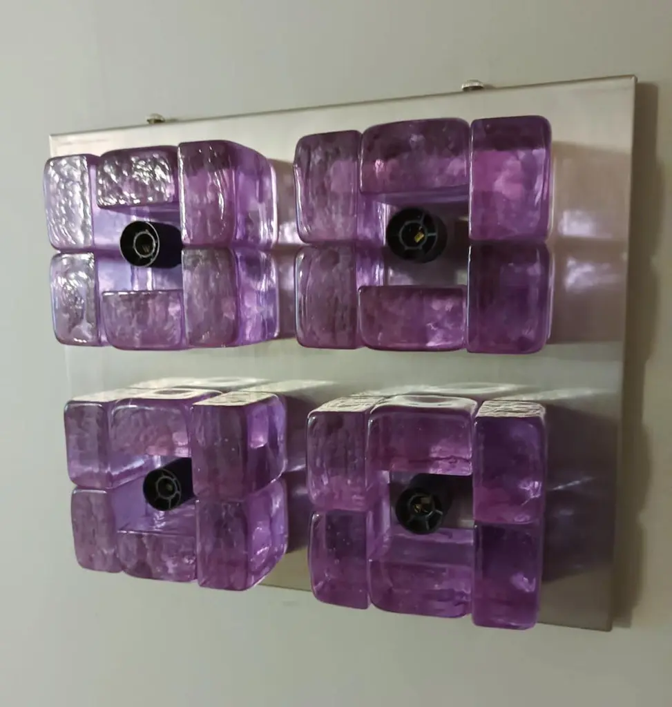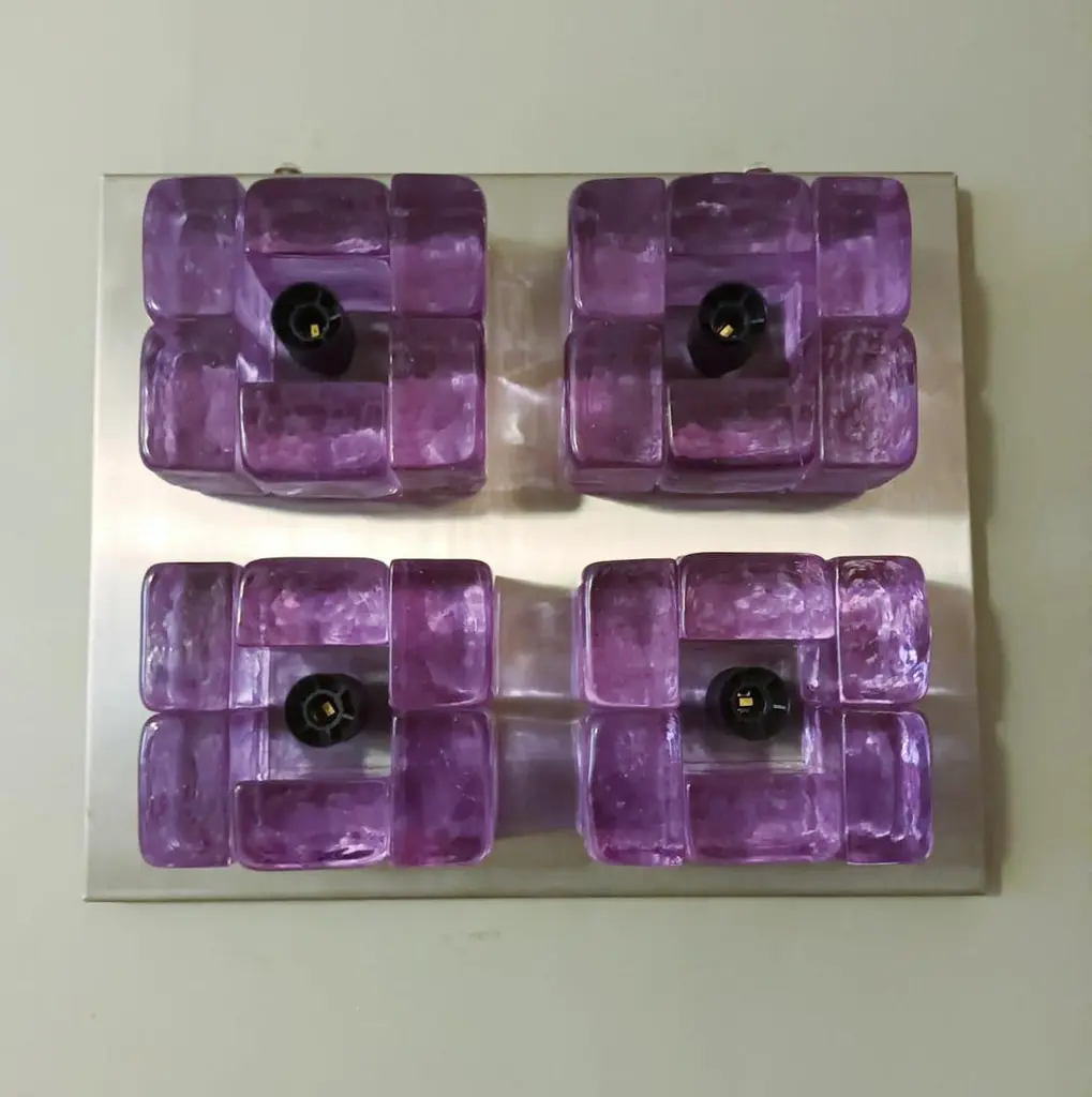 Vintage Italian wall lights or flush mounts with hand blown amethyst Murano glasses cubes mounted on brushed nickel frames / made in Italy circa 1970sMeasures: height 11.5 inches, width 14 inches, depth 3 inches4 lights / E12 or E14 type / max 40W each3 available in stock in Italy, price is for each itemOrder reference #: FABIOLTD H040.