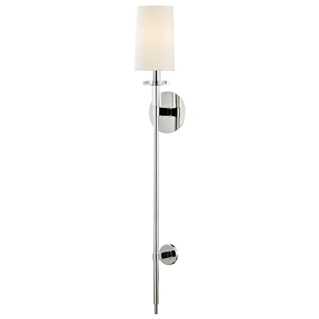 The Hudson Valley Amherst Tall Wall Sconce is dainty yet dramatic with its long tapered stem that lights the space like a modern wall torch. The shade is made of faux silk, which diffuses the illumination in a smooth and soothing manner. The only detail needed is the crystal bobeche, which uplifts this simple piece into something elegant.