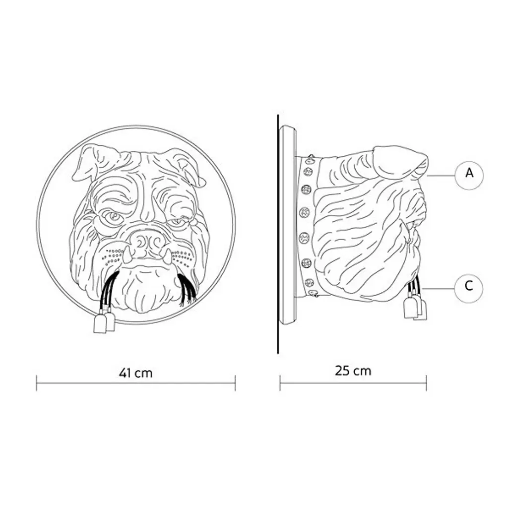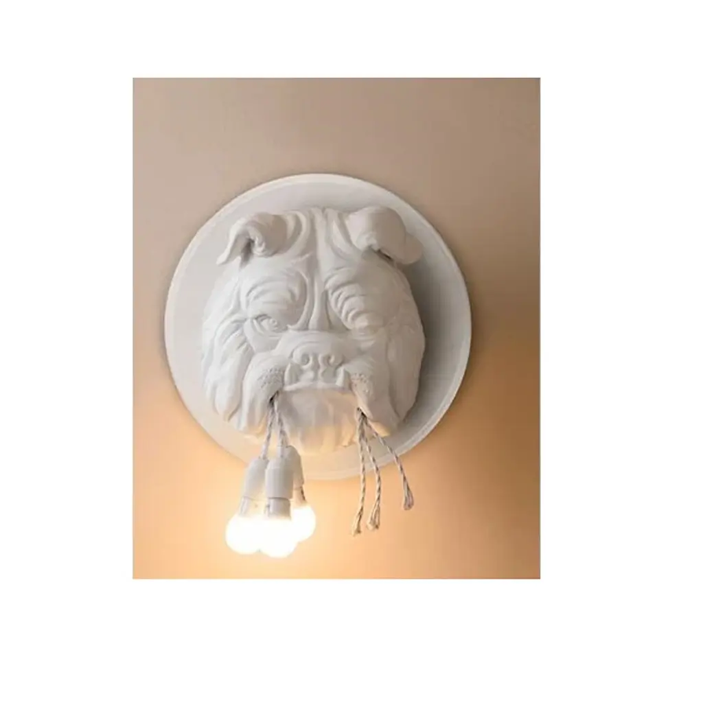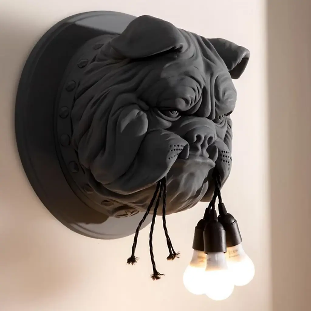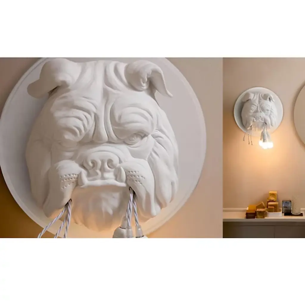 The Amsterdam Wall Sconce from Karman is part of a series of pieces that examine nature’s relationship to man. Designed by Matteo Ugolini, this fixture showcases the bust of an expressive bulldog rising from the wall to hold a ripped cluster of light bulbs in his mouth. Its ceramic composition adds to its structural detailing while the smooth matte finish lends a classic element. The light bulbs emit a warm glow that highlights the fine details within the bulldog’s angered expression.