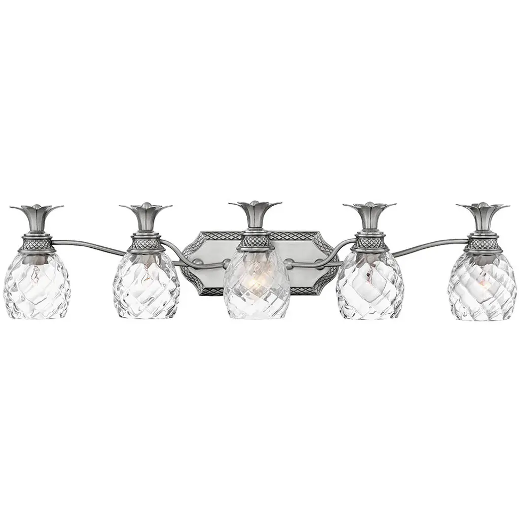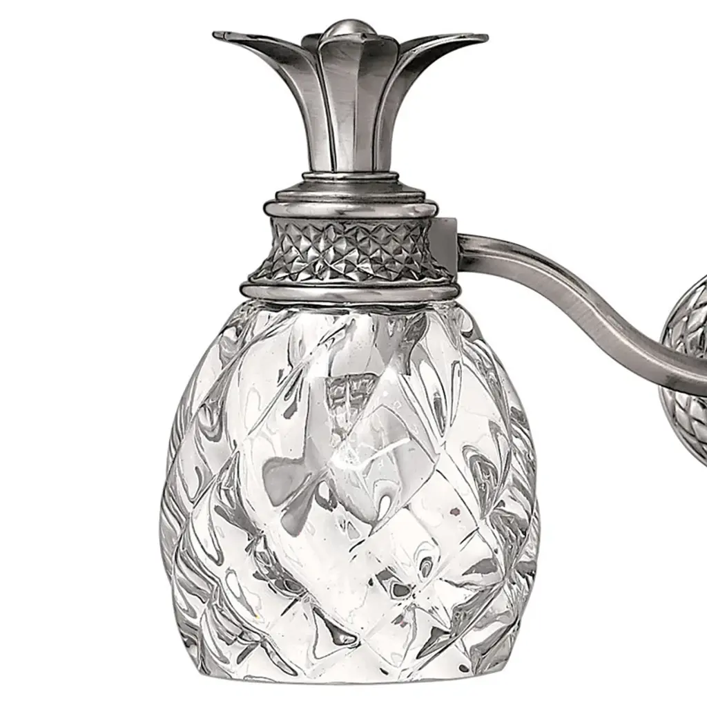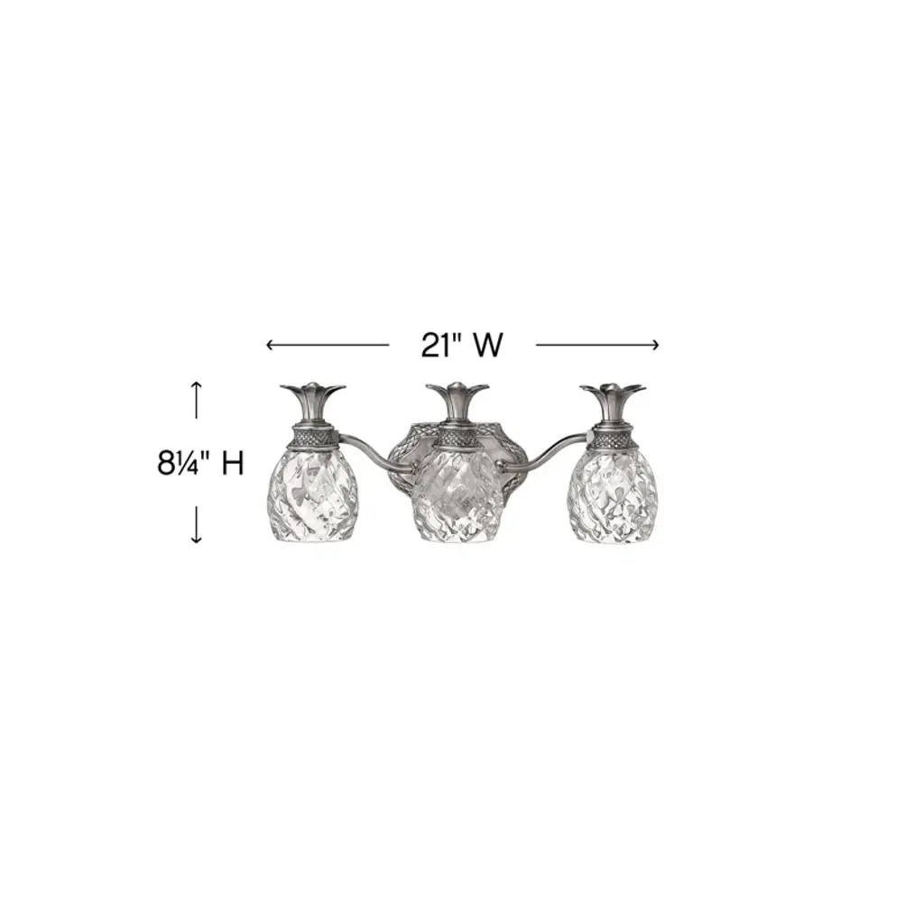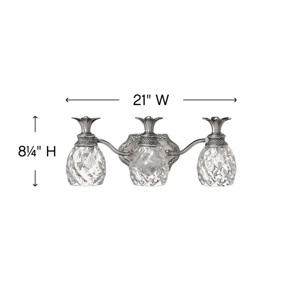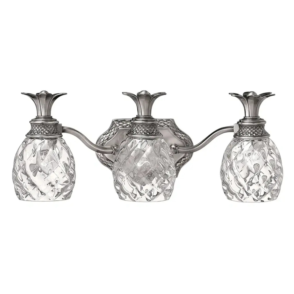 Bring the feel of the tropics to your main bathroom or guest bath with this 3-light vanity fixture. Rated for damp locations, this metal light features a textured hexagonal backplate, curved arms, and clear etched glass shades designed in pineapple shapes with elaborate metal stems for a breezy look. Each shade accommodates a single bulb up to 100W (not included), which aims the light up or down thanks to its reverse mounting. Best of all? It's compatible with a dimmer switch, so you can adjust the lighting to fit your morning and evening beauty routine.