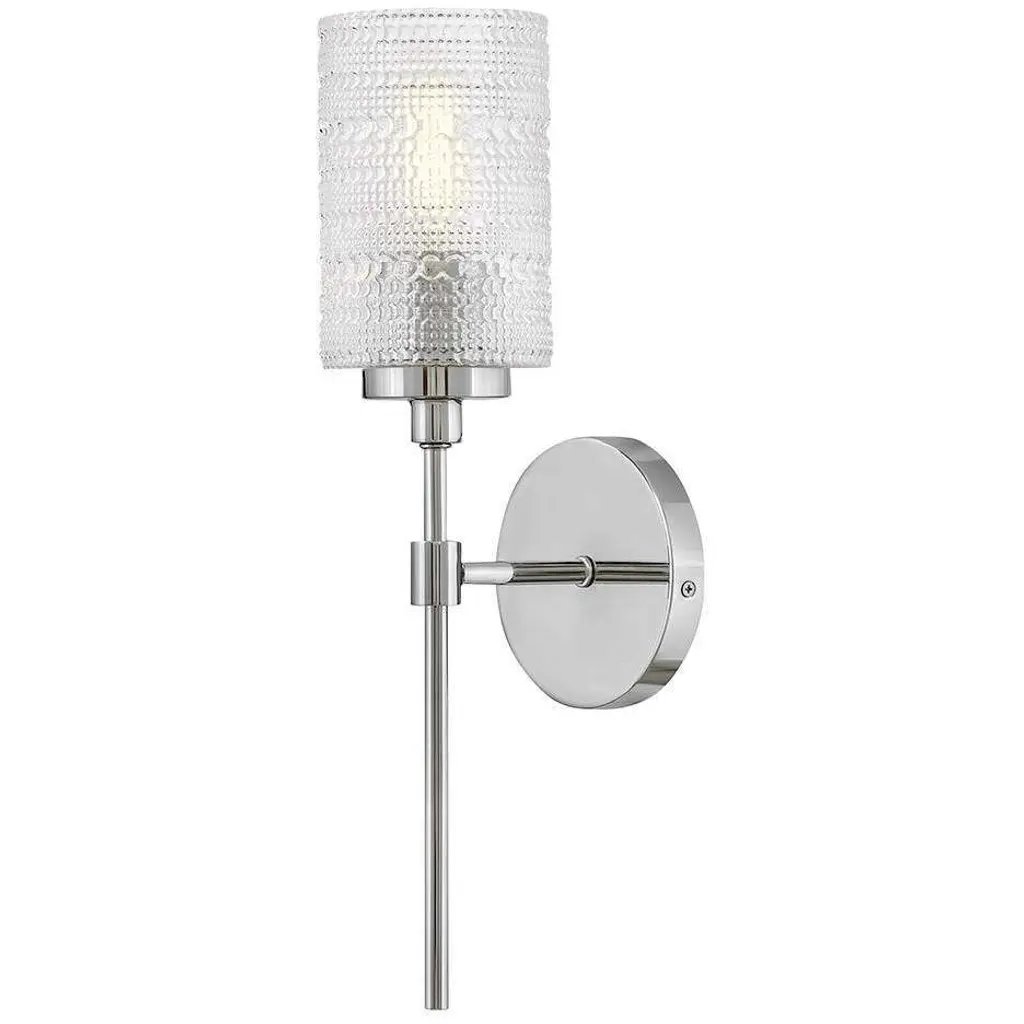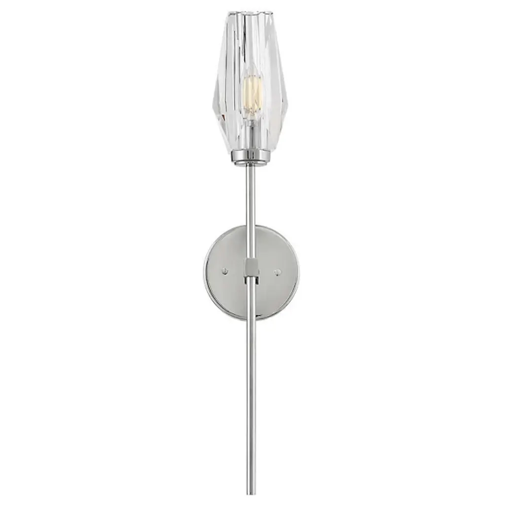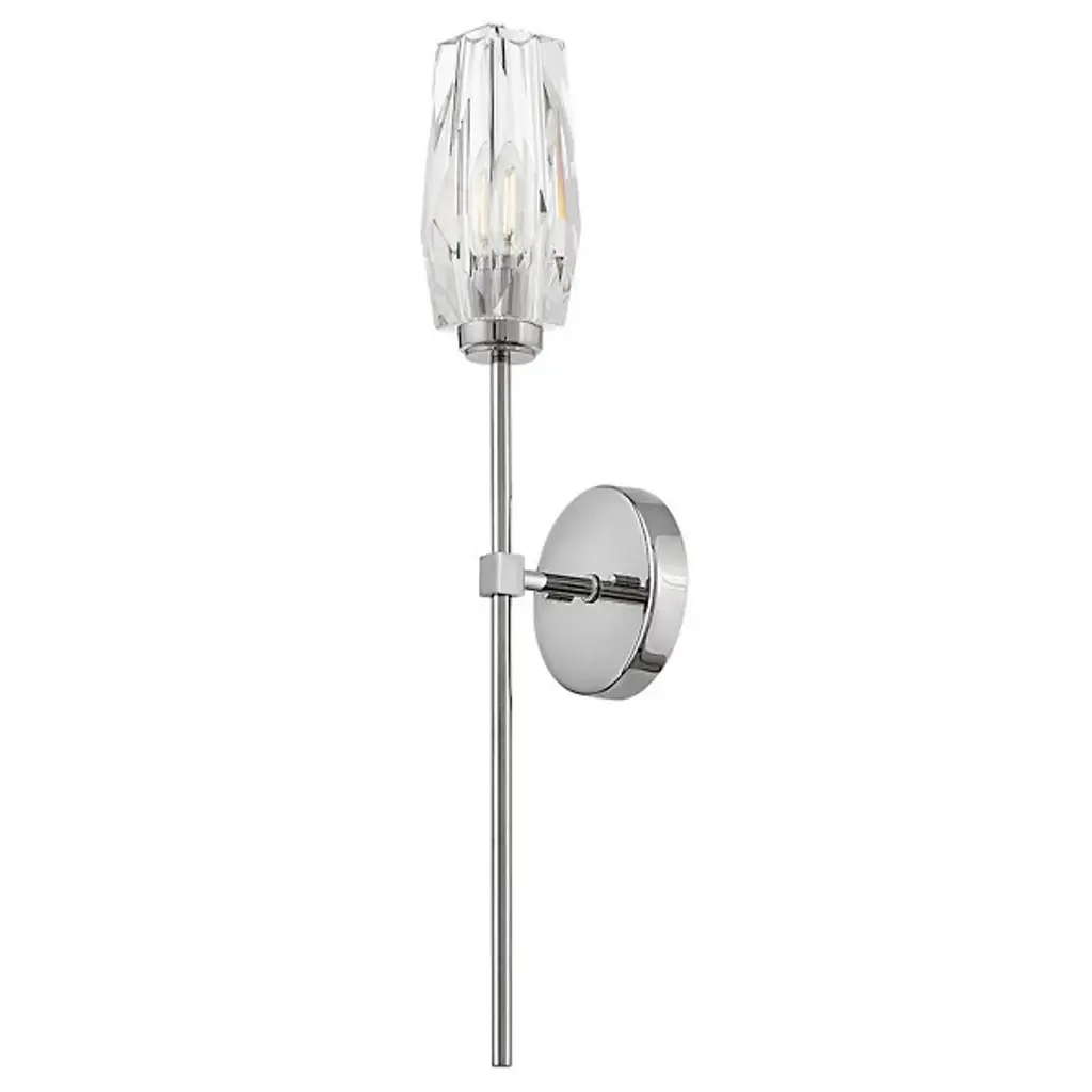 Go bold with a bright bouquet of light when you add the Ana Wall Sconce from Hinkley Lighting to your walls and hallways. A stylish transitional fixture that starts simply with a circular steel wall mount and single stem, it uses a single socket at its top to illuminate its surroundings from within a complex shade. The shade is made of heavy-cut crystal, clear and faceted, and shaped like a floral blossom for that extra touch of old-world elegance, surrounding the lamping and transforming its brightness into glittering glamour.