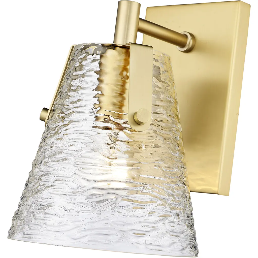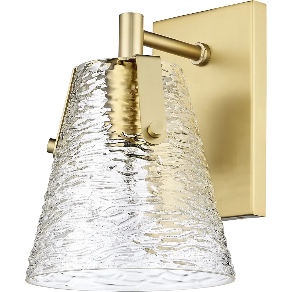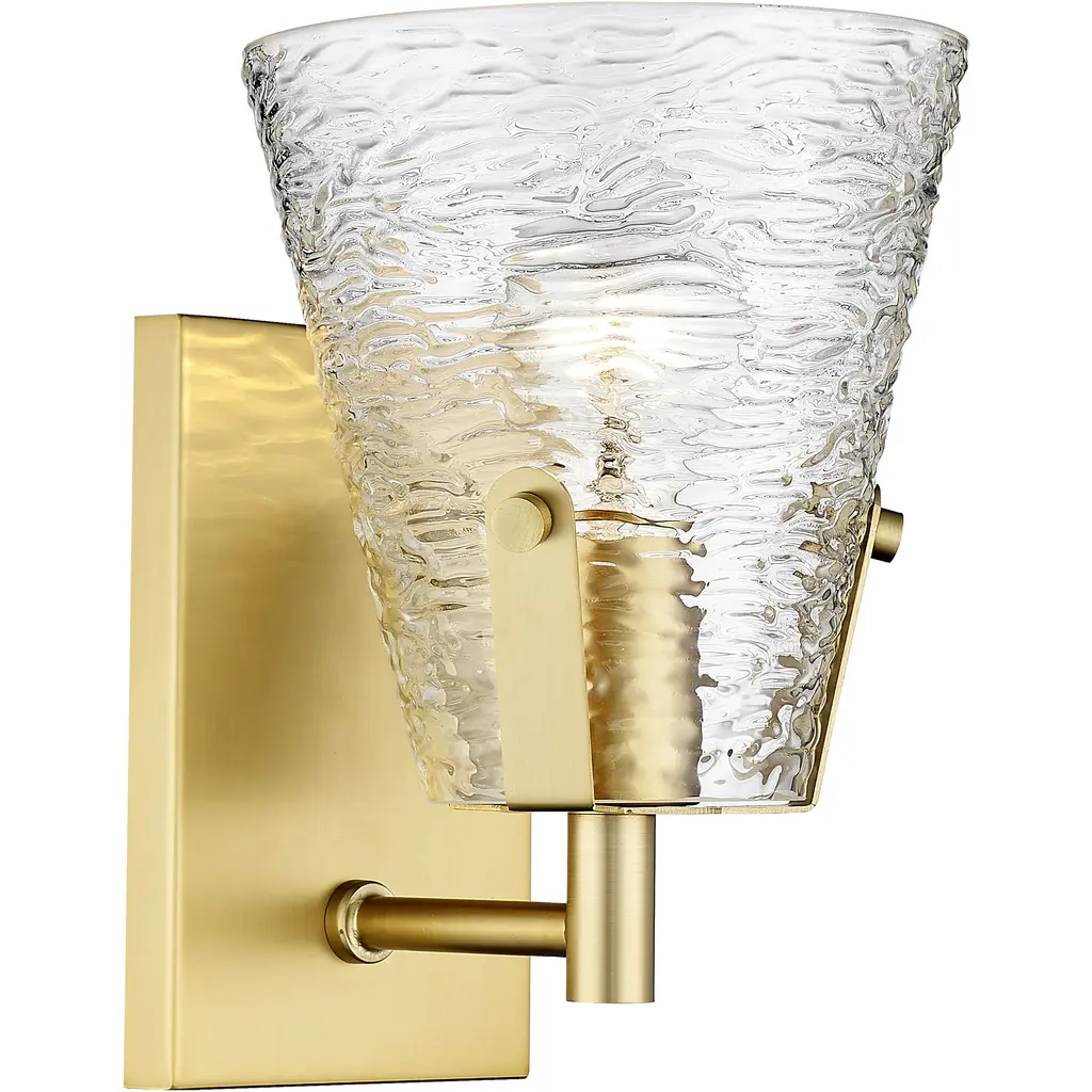 Add an elegant element to a custom bath space with this modern wall sconce from the Analia collection. Highlight a compact vanity or wall with a cool fixture featuring a minimalist-inspired modern gold finish steel frame and decadent conical shade crafted of hand-blown textured glass.