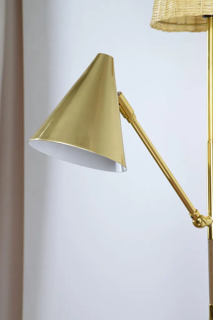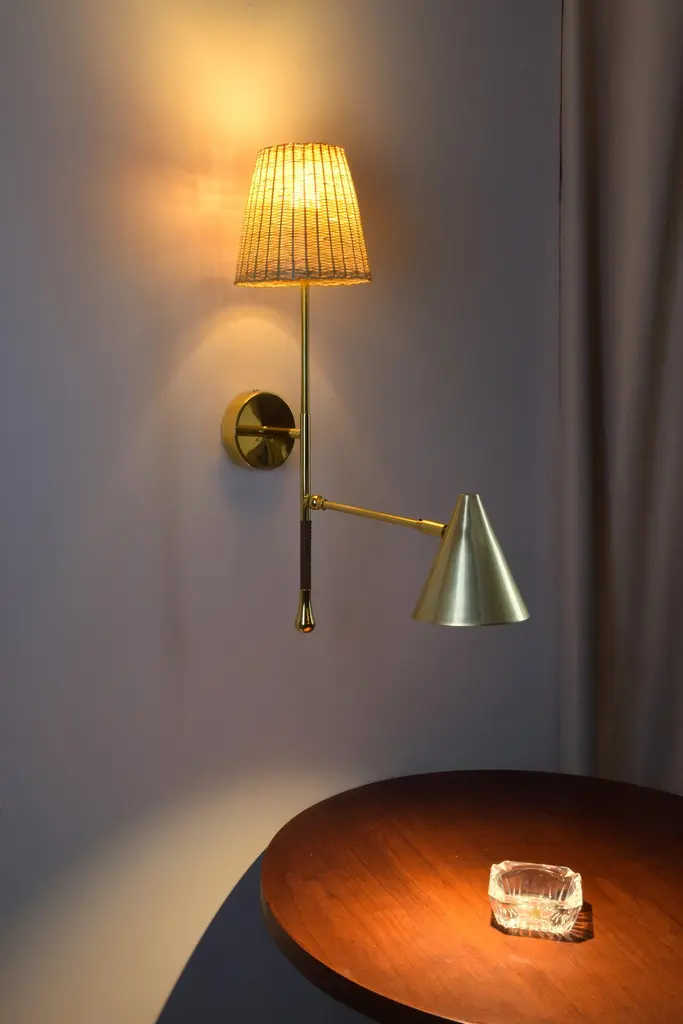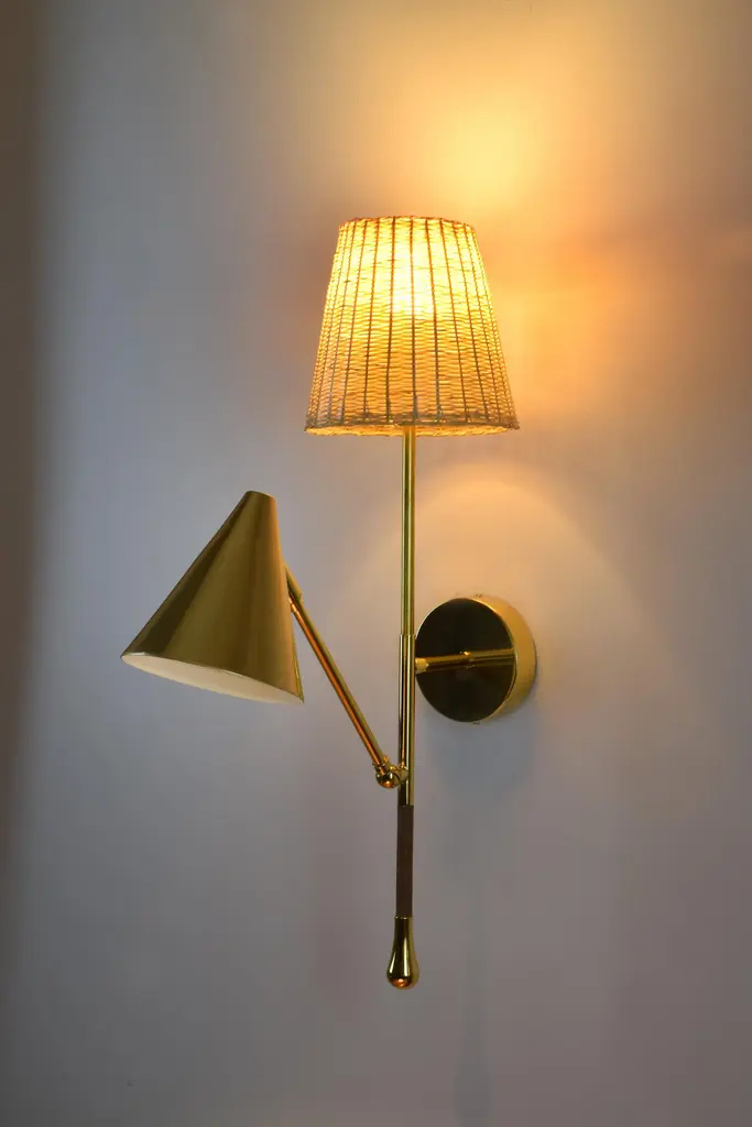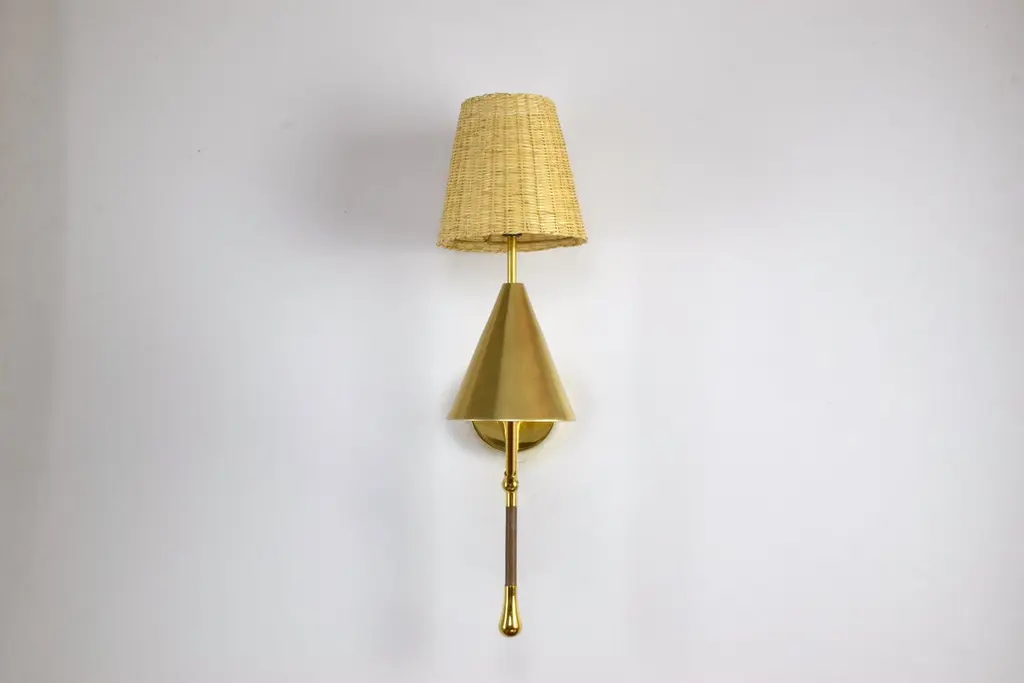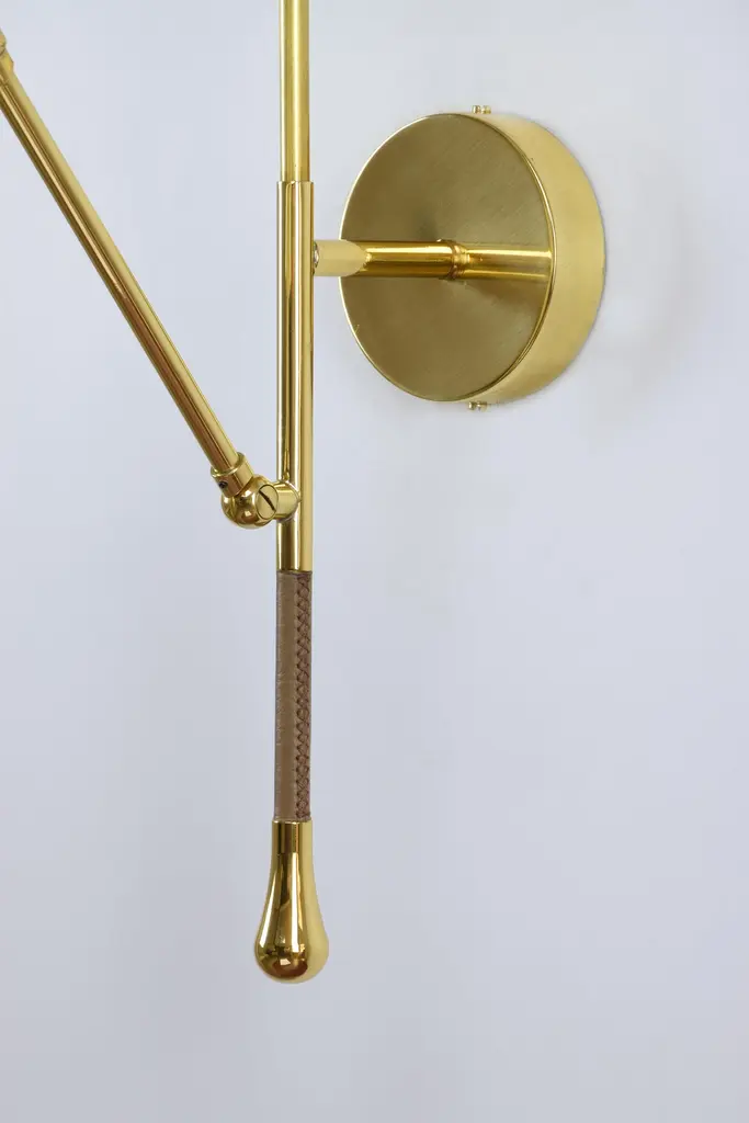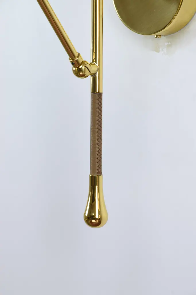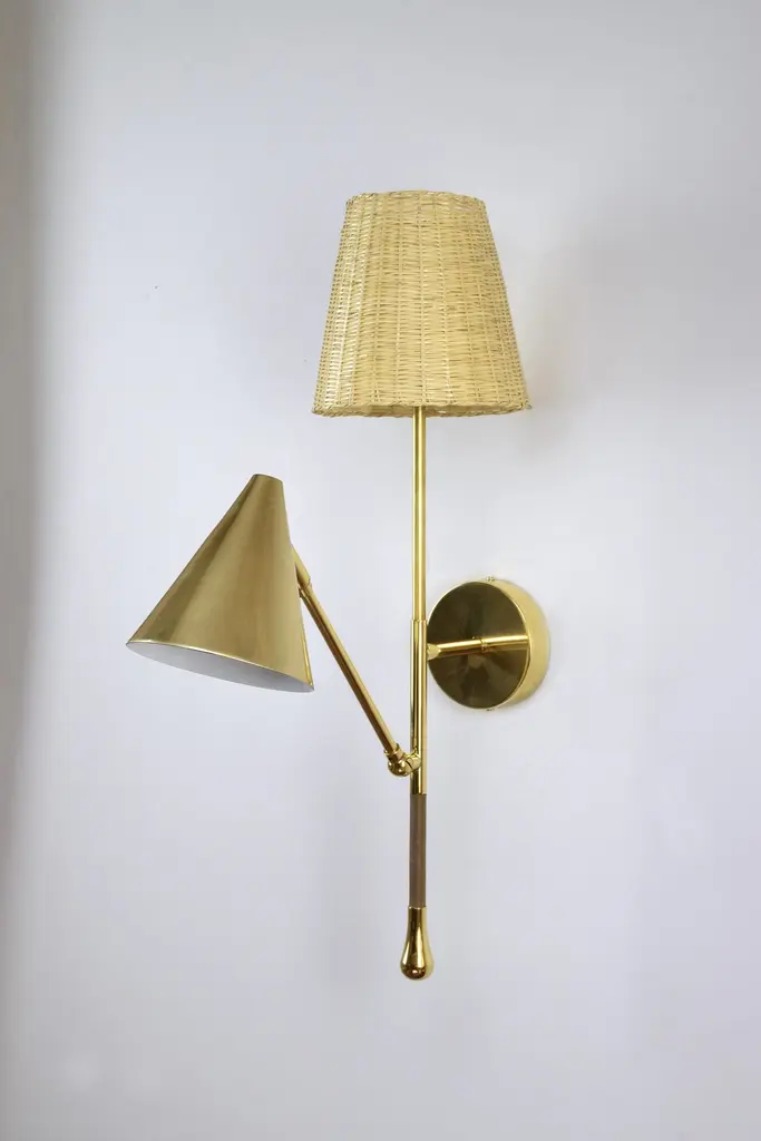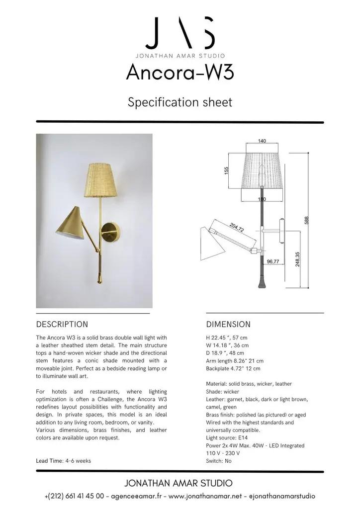The Ancora W3 is a solid brass double wall light with a leather sheathed stem detail. The main structure tops a hand-woven wicker shade and the directional stem features a conic shade mounted with a moveable joint. Perfect as a bedside reading lamp or to illuminate wall art.For hotels and restaurants, where lighting optimization is often a Challenge, the Ancora W3 redefines layout possibilities with functionality and design. In private spaces, this model is an ideal addition to any living room, bedroom, or vanity. Various dimensions, brass finishes, and leather colors are available upon request.For a separate switch, there is an additional charge of $96.The Flow collection is an ode to movement designed by Jonathan Amar composed of artisanal articulating lamps and side tables following three years of research and development between his office in Paris and his atelier in Rabat and Leiria. It represents 35 years of passion and know-how in the fields of decorative arts and interior design. -----We are an exhibition space and an online destination established by the passionate art director behind Jonathan Amar Studio. Our gallery presents a harmonious mix of iconic and engaging 20th century pieces and bespoke contemporary lighting. With a strong focus on Italian mid-century designs, his success strives from sourcing designs with striking shapes, creative techniques and interesting materials that cross the concept of time in the same way a Spirit does.?Our 350 square meter workspace includes a luminous gallery, a restoration atelier where our expert artisans in metalwork, woodwork, upholstery, and electrics; restore each piece with the mission to honor a balance between restoration and preservation. There may be light age-related wear but no hard damages or structural issues.?Since the launch of our gallery in late 2017, we have exported over 280 items to buyers in 21 countries located in all four corners of the world from Europe and North America to Asia and Australia. In the United-States alone, we have ensured the delivery of over 150 pieces of all sizes (from massive dining tables to small decorative objects) in 23 states. We take the utmost attention to our packaging by building robust made to measure boxes in our atelier with the aim of providing safe and cost-effective delivery prices for every client. Most deliveries arrive smoothly in less than 8 days. We are located both in Paris and Rabat. FYI the Morocco Free Trade Agreement (MAFTA) went into effect on January 1, 2006. Under the agreement, most Moroccan goods enter the United States duty-free.