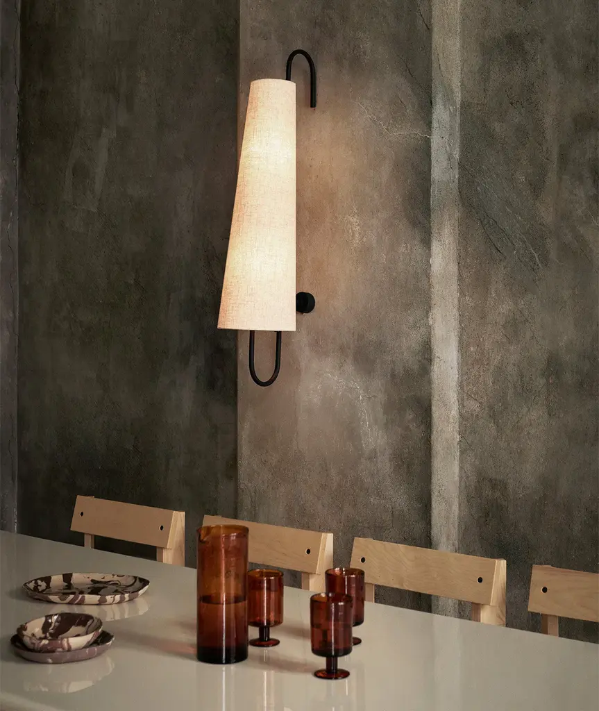 The Ancora Wall Lamp derives its name from the Italian word for ‘anchor’, drawing inspiration from its distinctive shape. The warm and textured textile lampshade beautifully contrasts its powder-coated iron frame, resulting in a poetic and vintage-inspired expression. This design effortlessly balances lightness and materiality, creating an enchanting ambiance in any space.