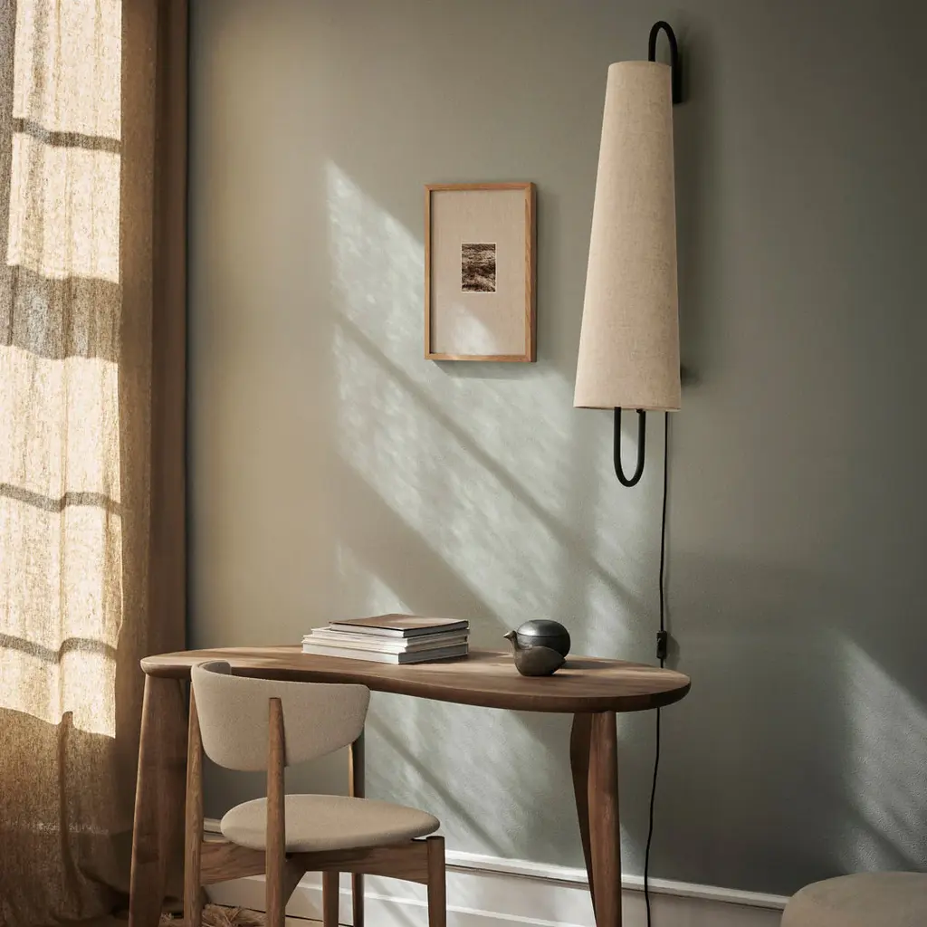 The Ancora Wall Lamp derives its name from the Italian word for ‘anchor', drawing inspiration from its distinctive shape. The warm and textured textile lampshade beautifully contrasts its powder-coated iron frame, resulting in a poetic and vintage-inspired expression. This design effortlessly balances lightness and materiality, creating an enchanting ambiance in any space. Bulb not included.