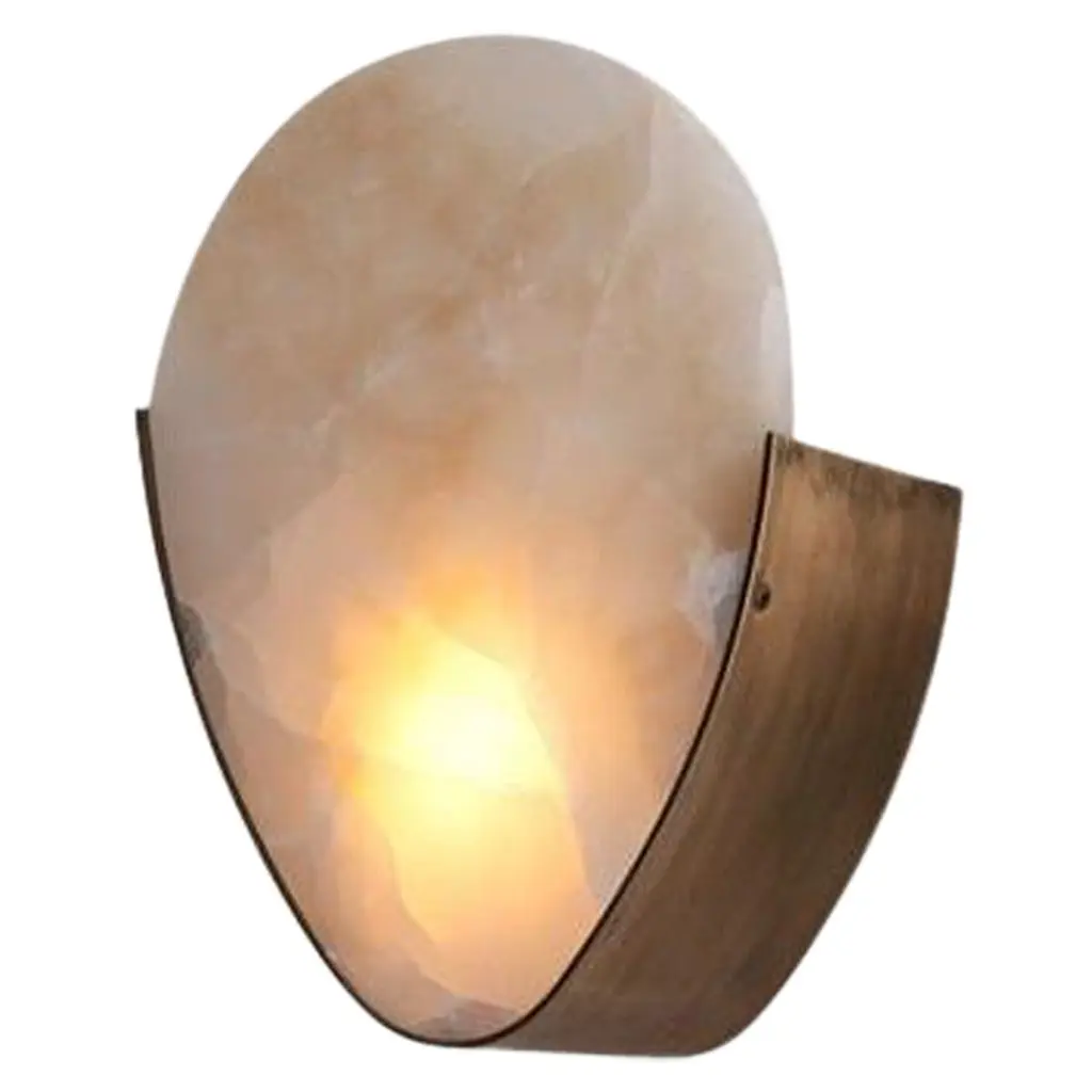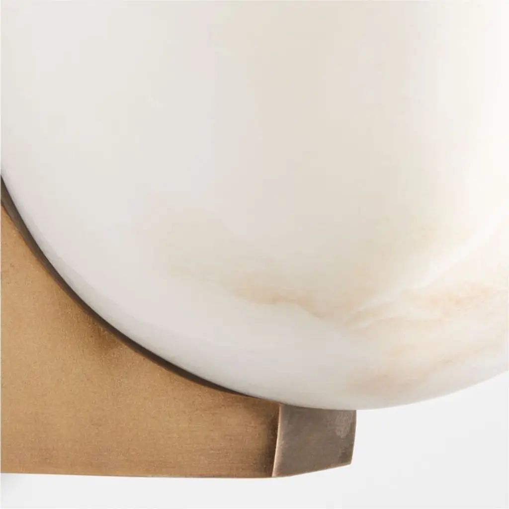 Prized for its frosty white color, translucency and unique veining, alabaster illuminates the beauty of natural stone in our Ando sconce. Handcarved with globe-like contours, the alabaster shade rests on a faceted aluminum base with burnished brass finish. Ideal for washing walls with ambient light, we love our Ando sconces in multiples lining a hallway or flanking a mantel.